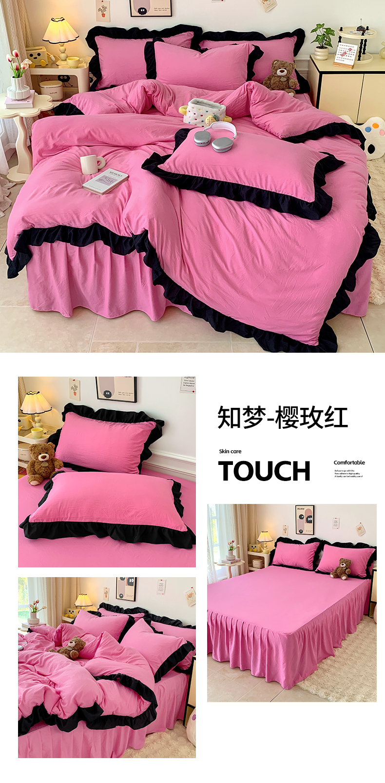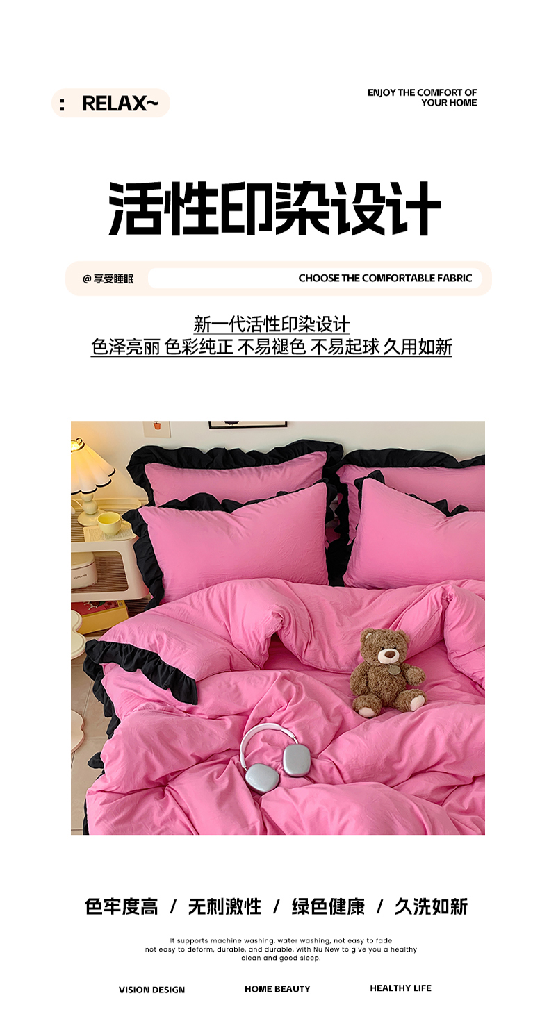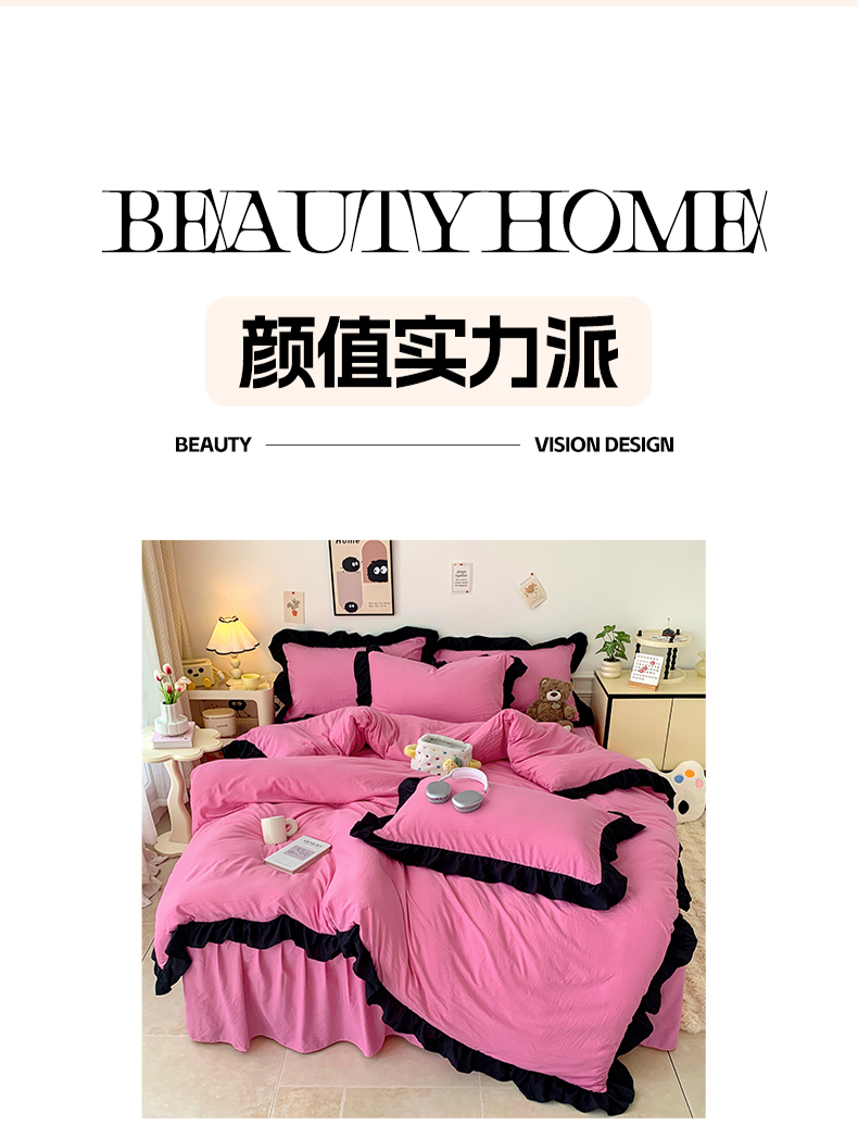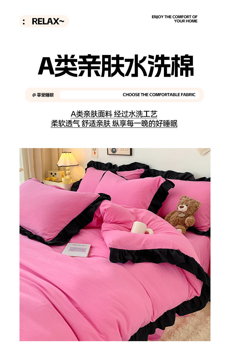 当前位置: 91家纺网 > 商品网购 > 床品套件 > 四件套 > 水洗棉四件套 > 2024新款水洗棉知梦系列黑花边四件套 知梦-樱玫红