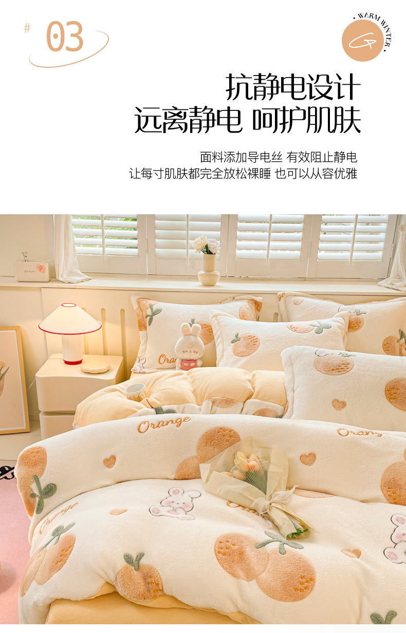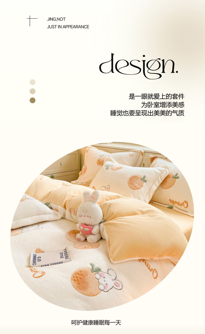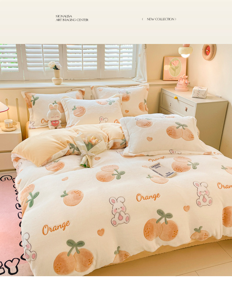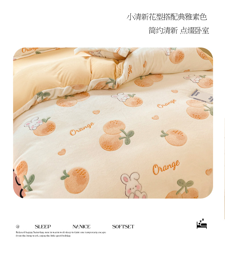 当前位置: 91家纺网 > 商品网购 > 床品套件 > 四件套 > 其它四件套 > 沐慕 2024新款卡通印花雪花绒四件套加厚牛奶绒四件套 小橘子
