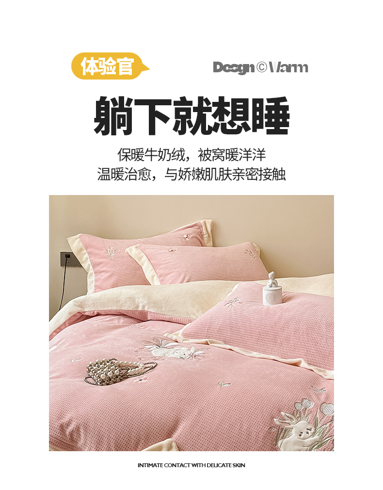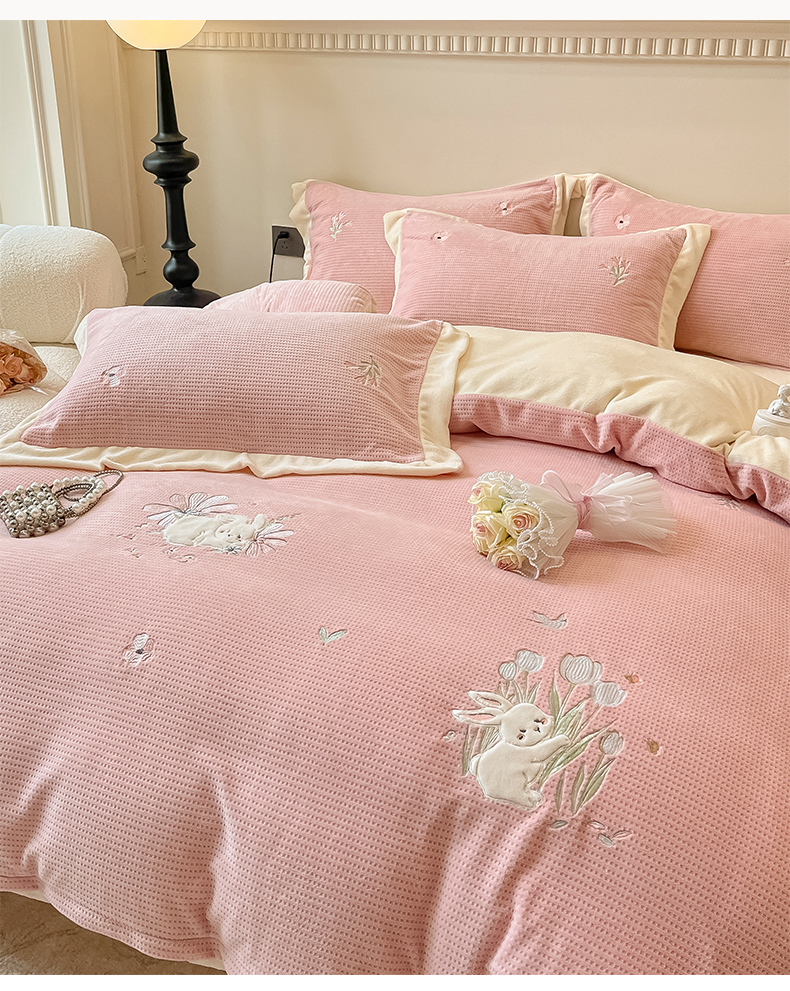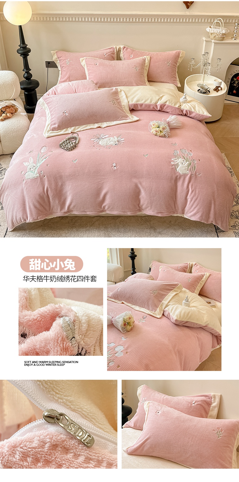 典曼家纺 2024新款【华夫格绣花】牛奶绒四件套 甜心小兔