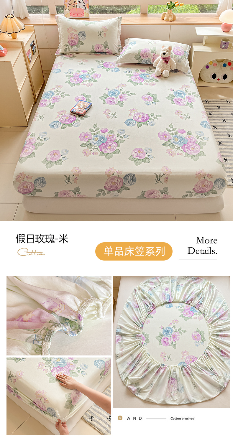 • 91家纺网 家纺一手货源 找家纺 铭成家纺 2024新款新疆棉喷气印花小清新系列单床笠 假日玫瑰-米
