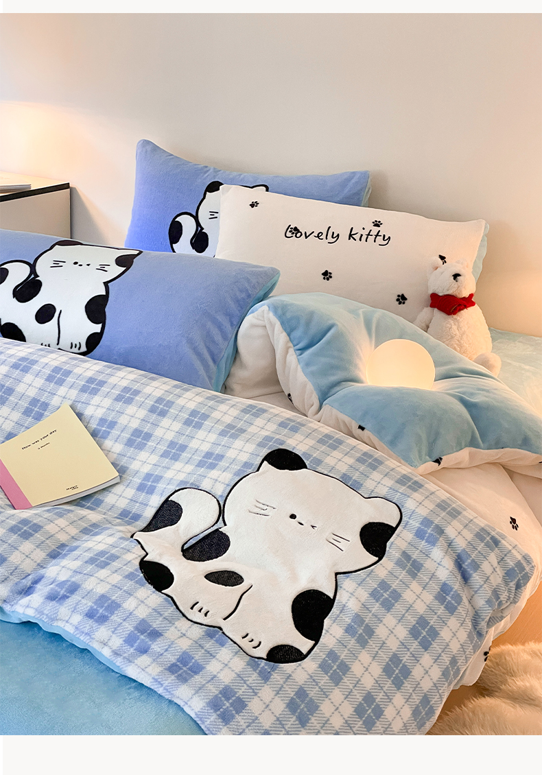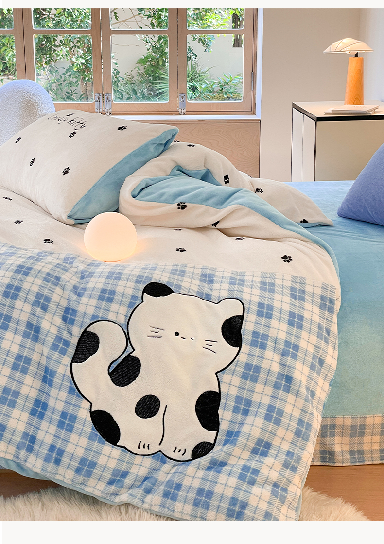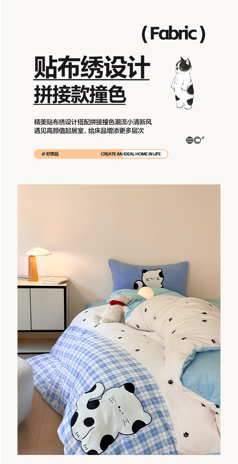 如一 2024新款牛奶绒拼接工艺款贴布绣+毛巾绣四件套 贴布绣-黑白猫
