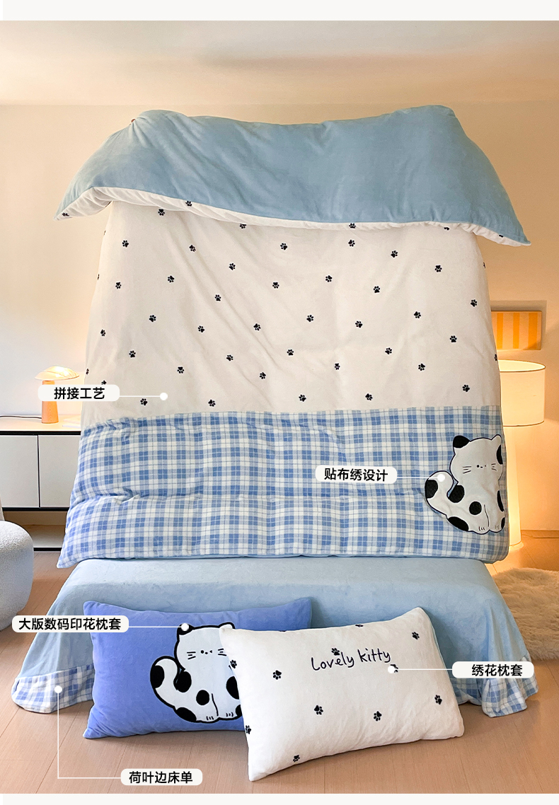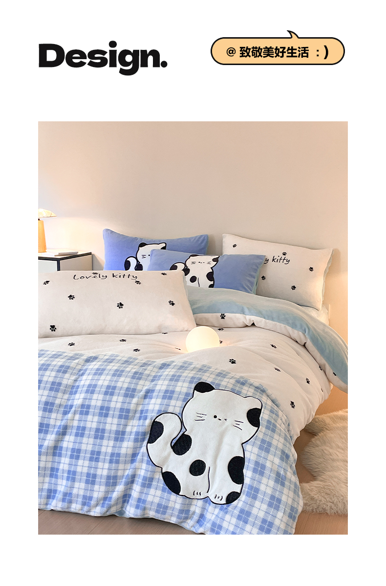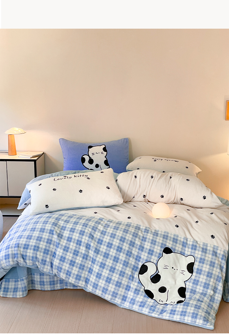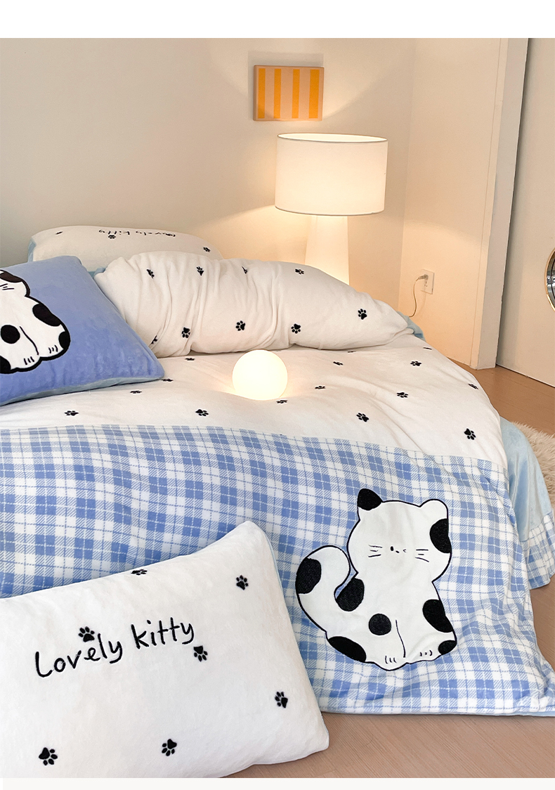 (总)如一 2025新款卡通毛巾绣系列牛奶绒四件套第三批,蓝格黑猫,草莓灰猫,蛋糕小狗,粉格小猫,樱桃黑猫