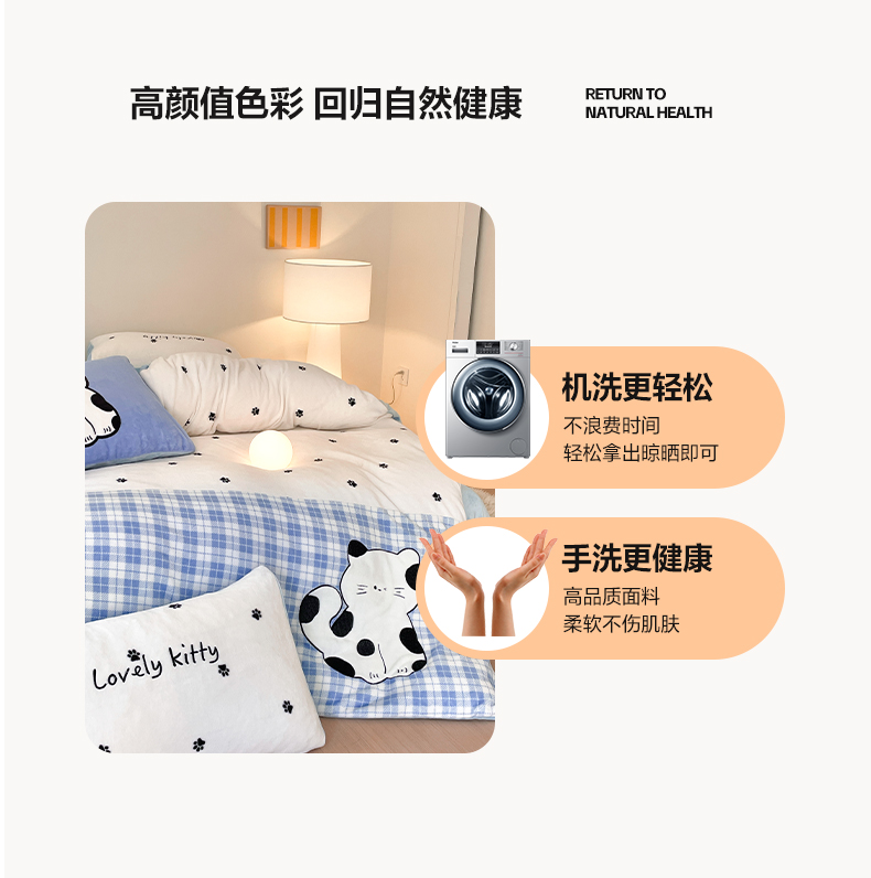 商品名称:如一 2024新款牛奶绒拼接工艺款贴布绣+毛巾绣四件套 贴布绣-黑白猫