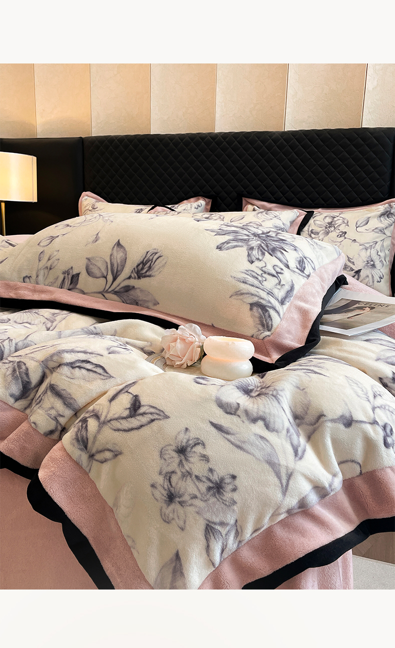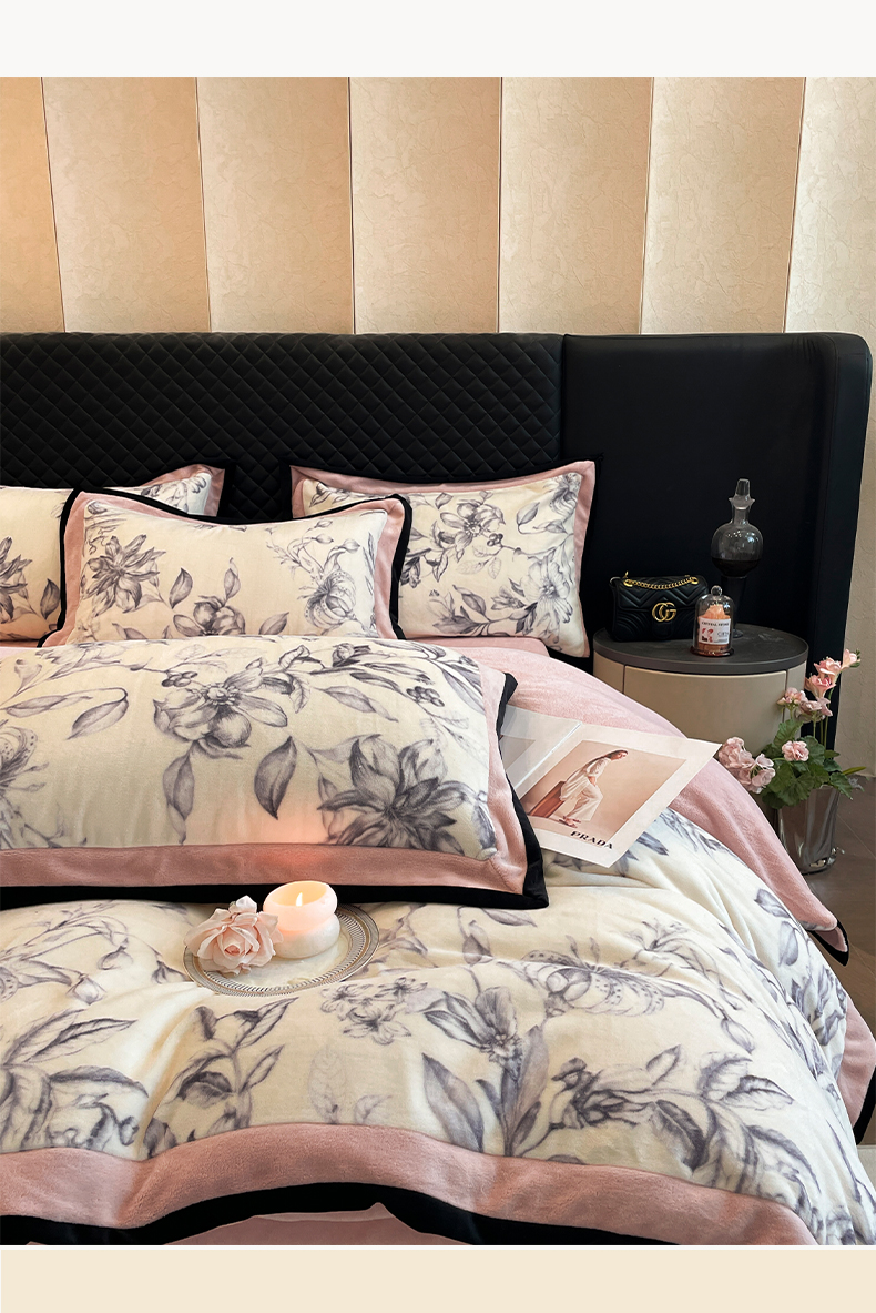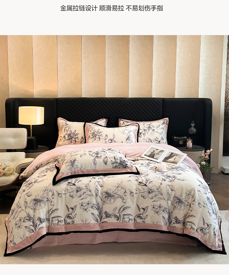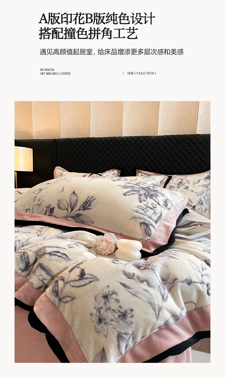商品名称:首尔家纺 2024新款牛奶绒轻奢宽边法式印花四件套 石榴花-粉