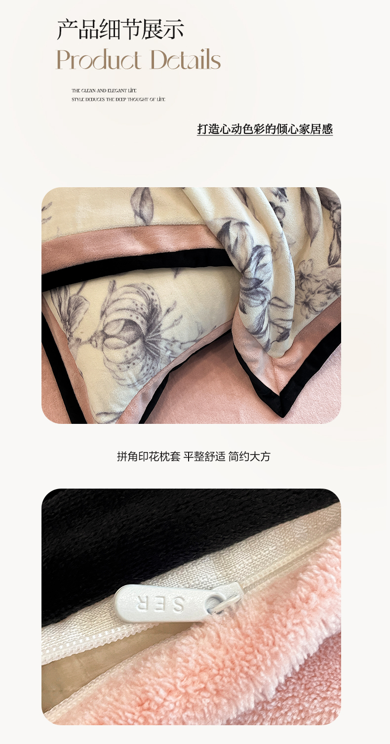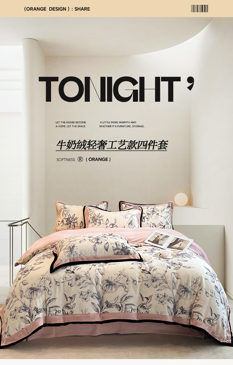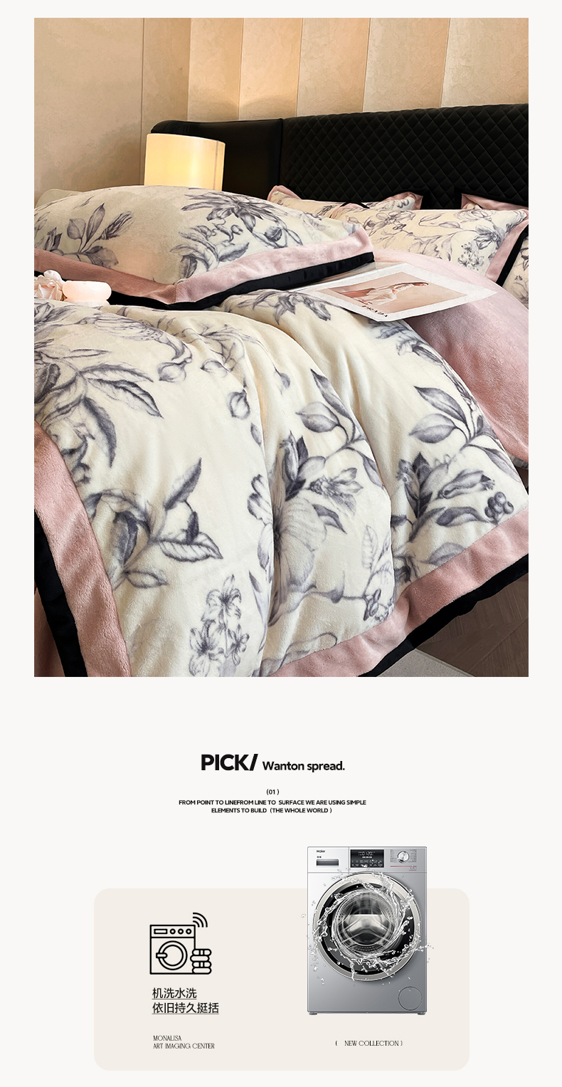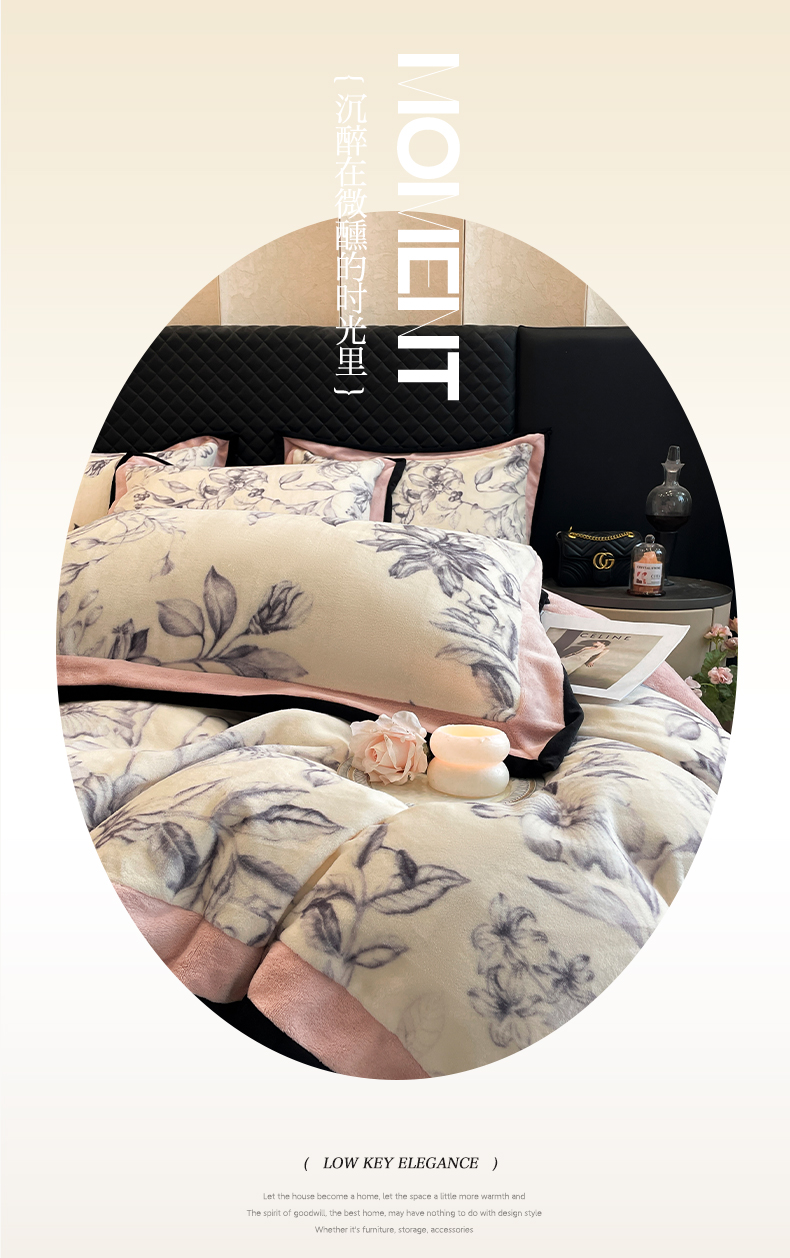 商品名称:首尔家纺 2024新款牛奶绒轻奢宽边法式印花四件套 石榴花-粉