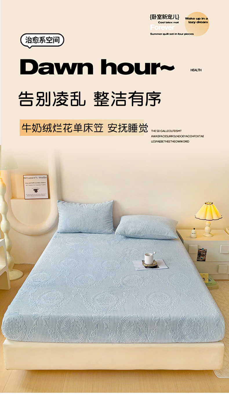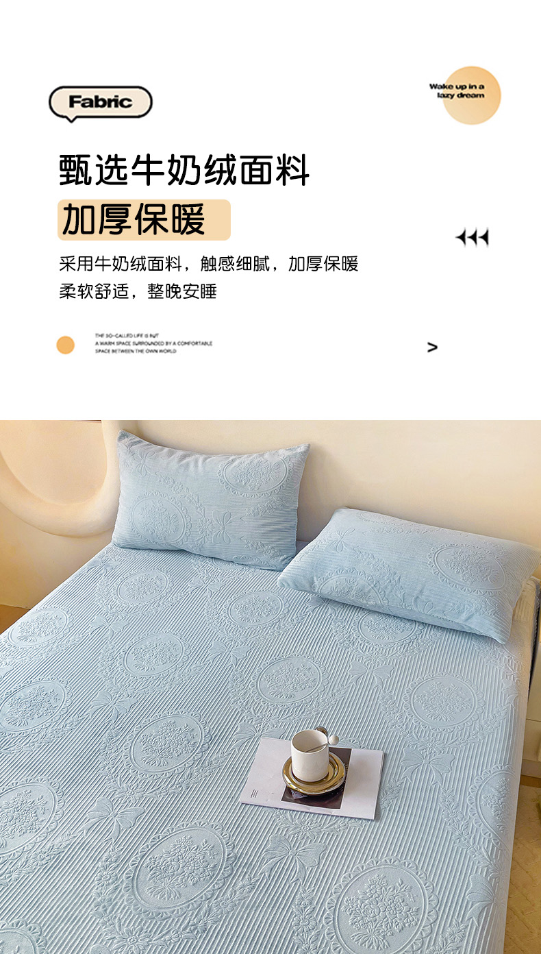 • 91家纺网 家纺一手货源 找家纺 漫时光 2025新款牛奶绒烂花床笠 梦洁花-蓝