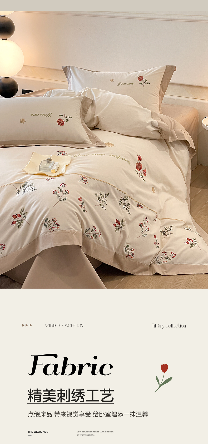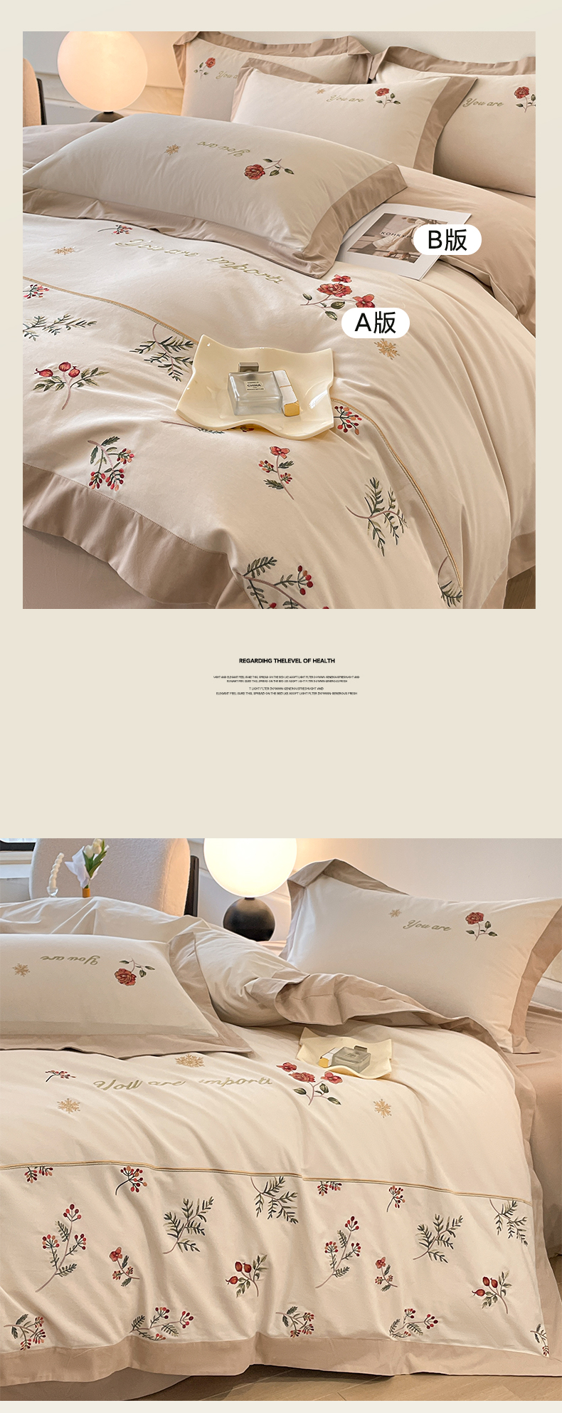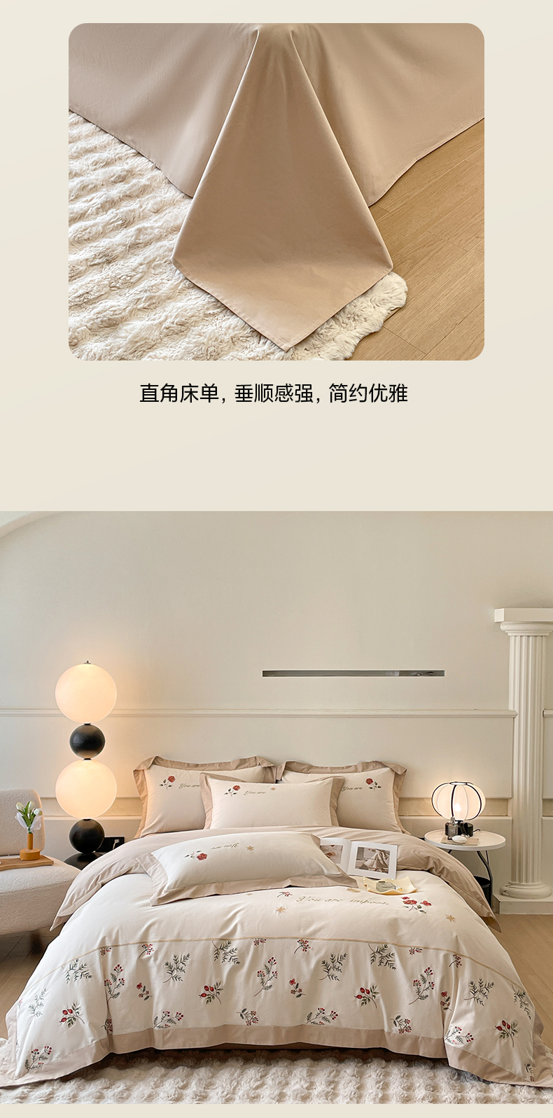 商品名称:遇见家居生活馆 2024新款A类全棉磨毛刺绣四件套-丽莎 丽莎-杏驼色