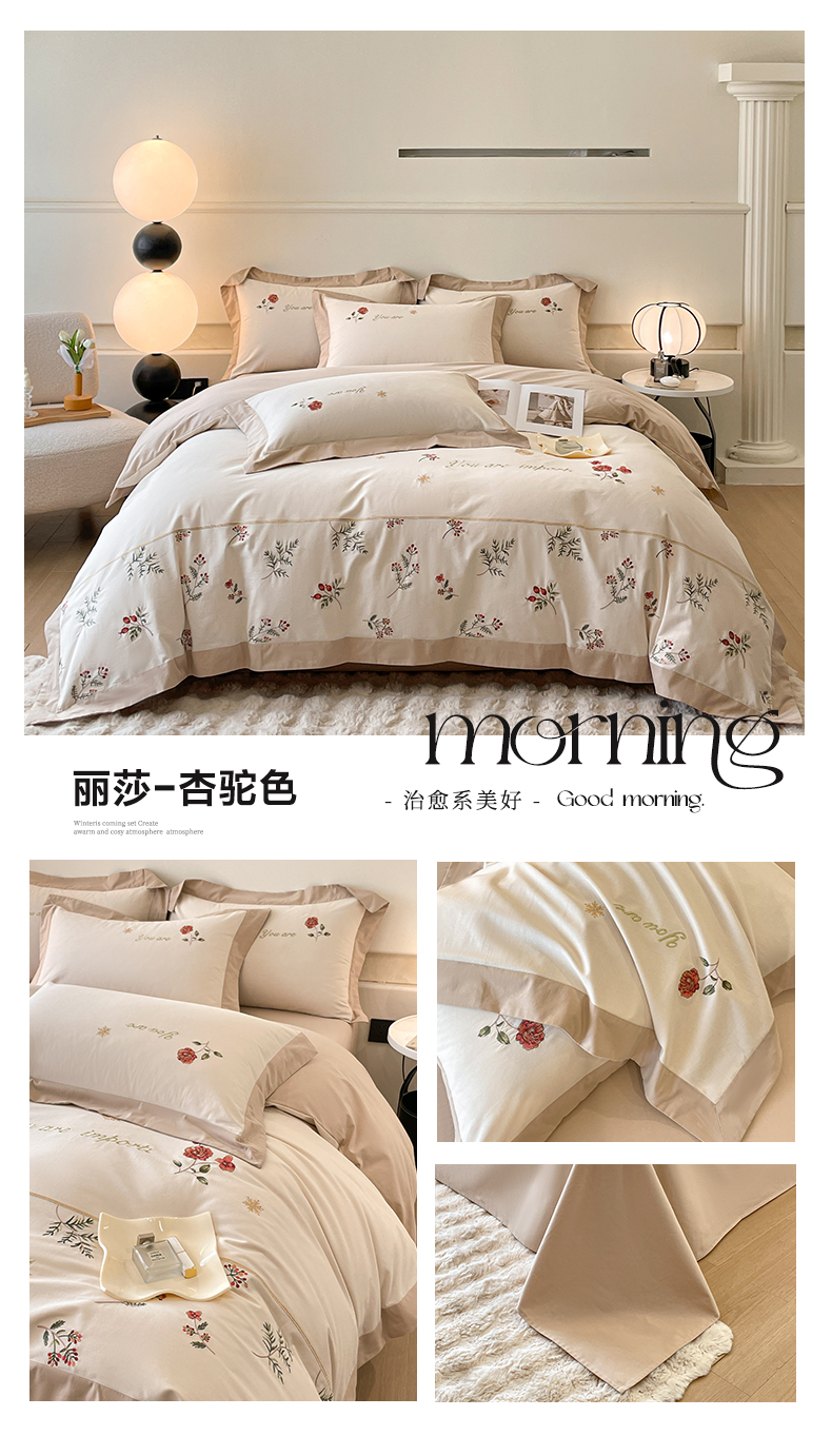 遇见家居生活馆 2024新款A类全棉磨毛刺绣四件套-丽莎 丽莎-杏驼色