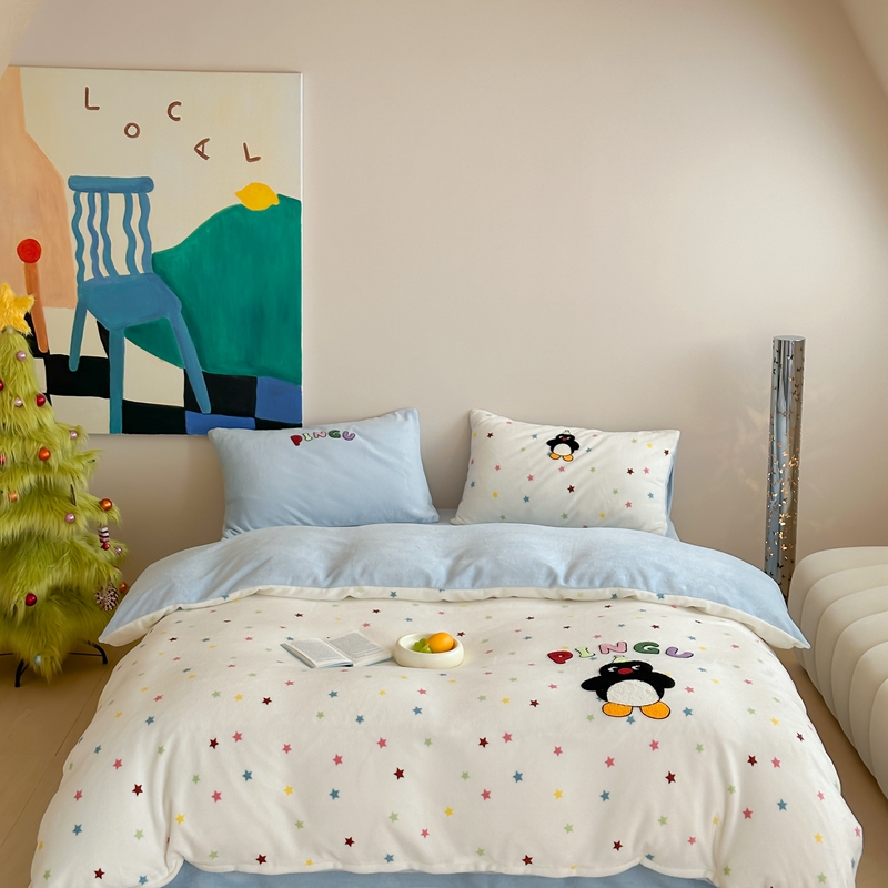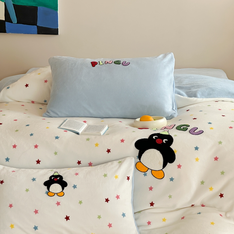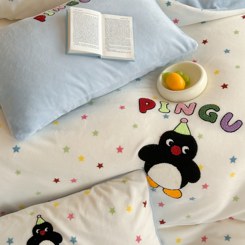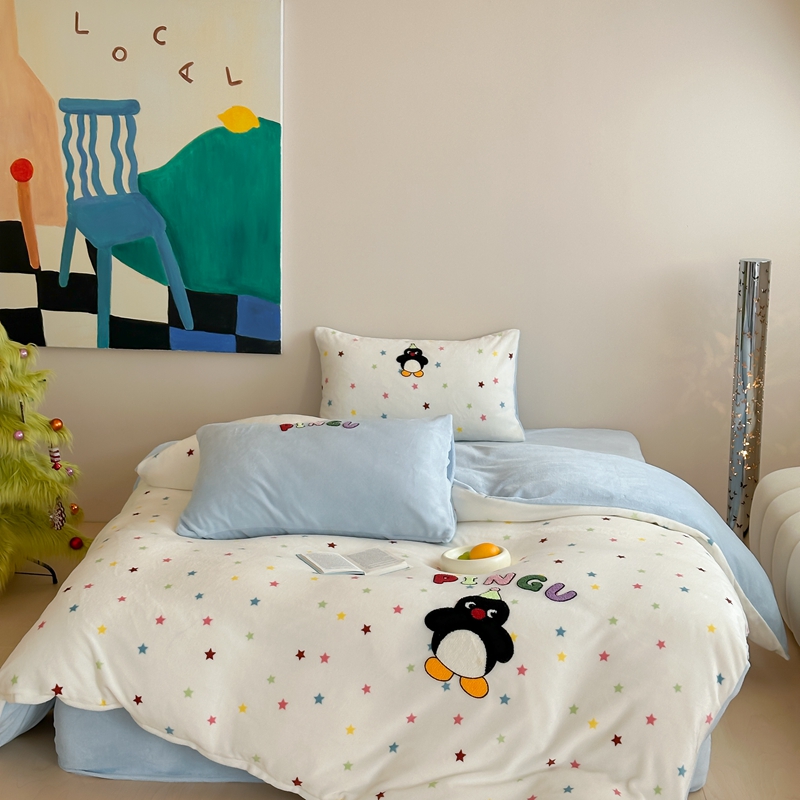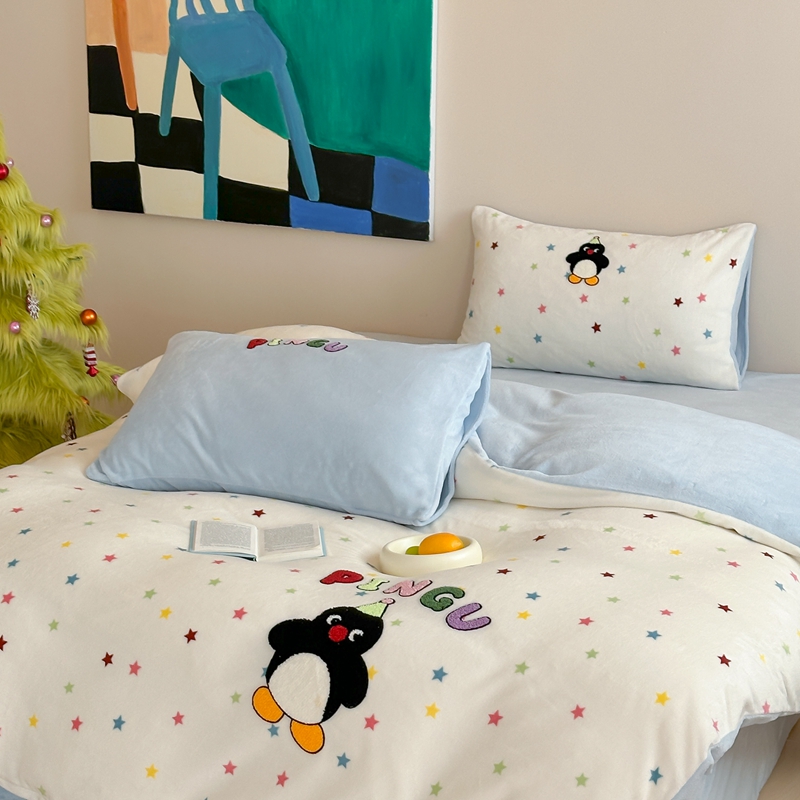 商品名称:时年家纺 2024新款牛奶绒毛巾绣系列四件套(充值会员优惠5元) 多彩企鹅