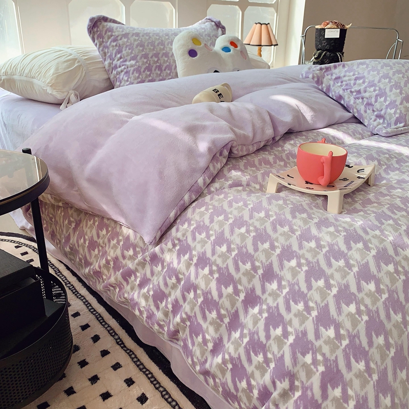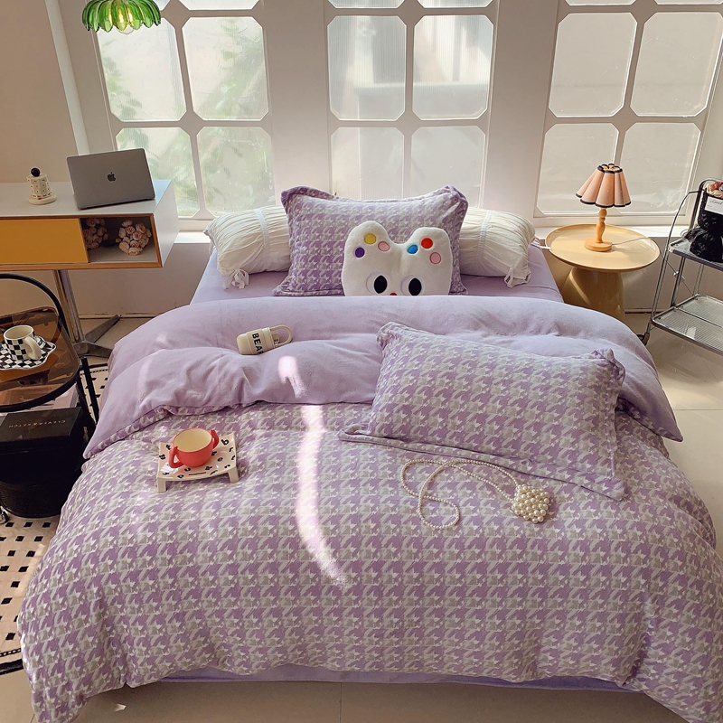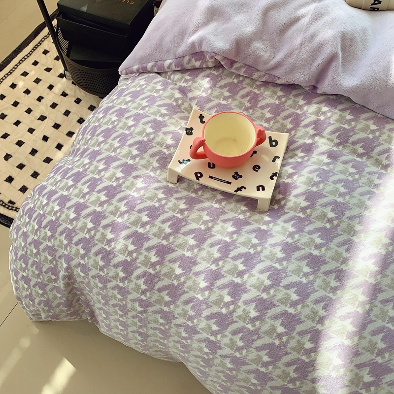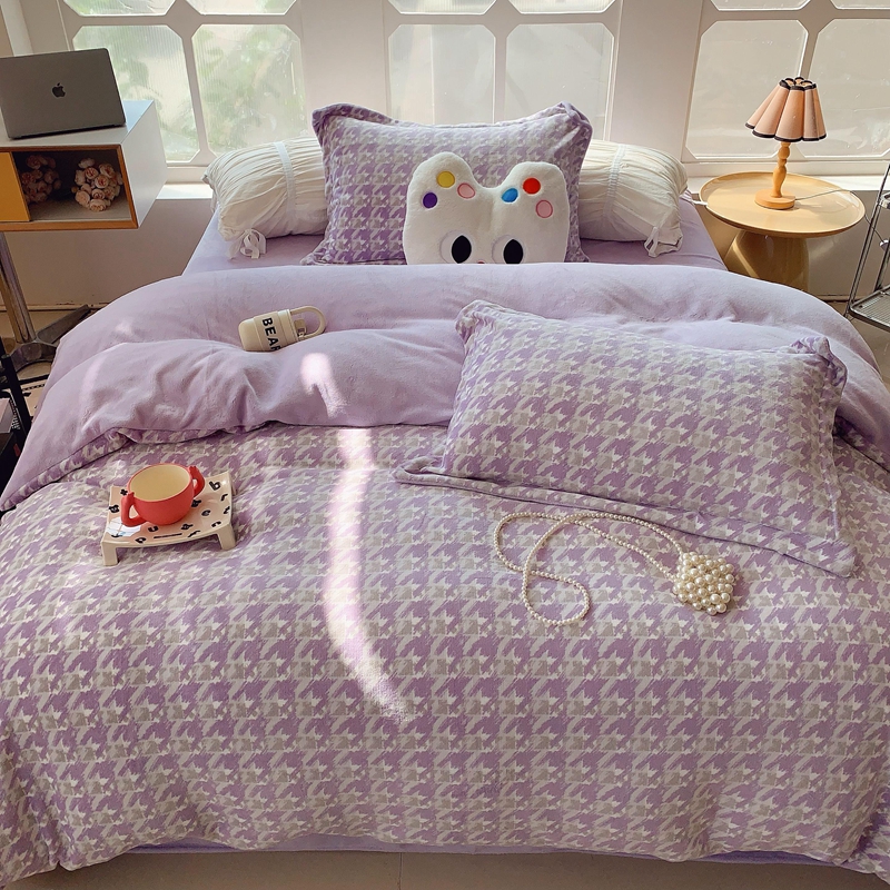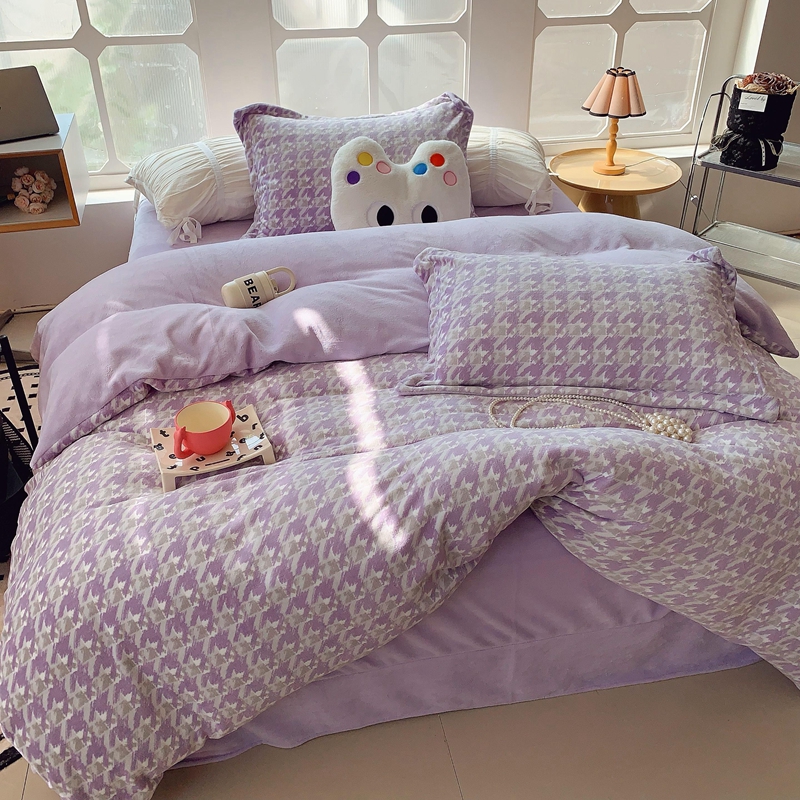 莱豫家纺 2024新款牛奶绒印花四件套 千鸟紫