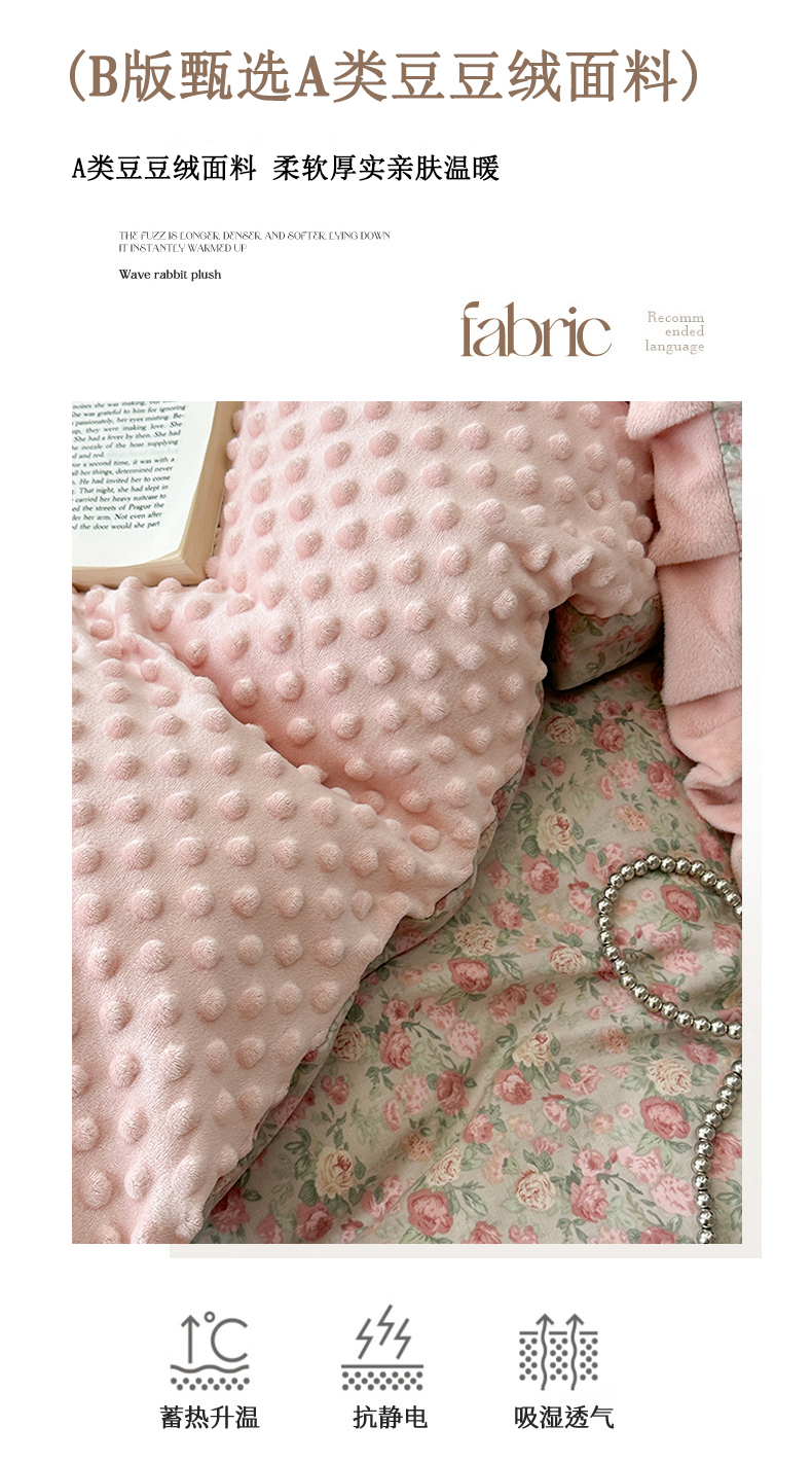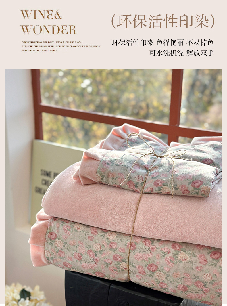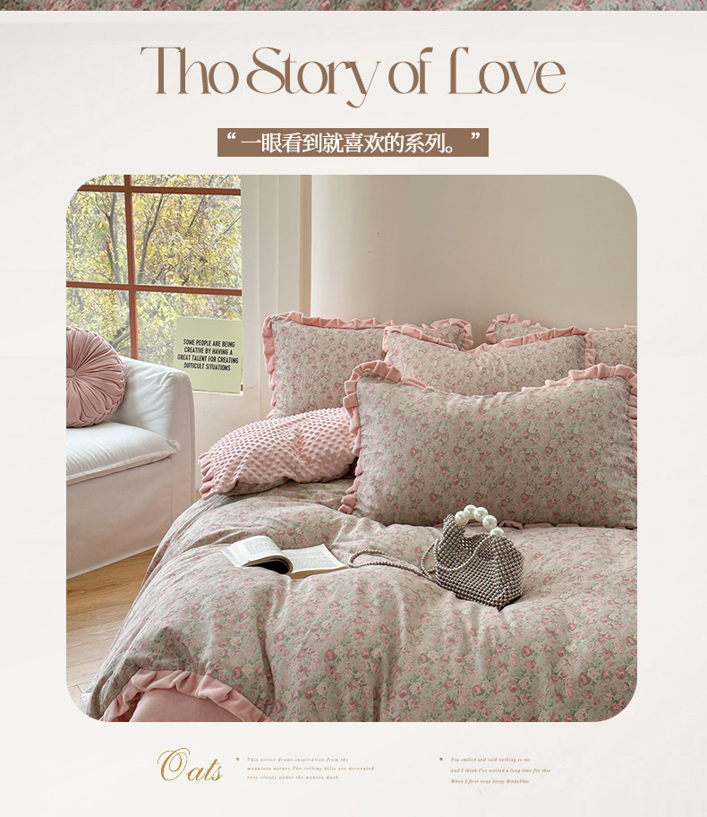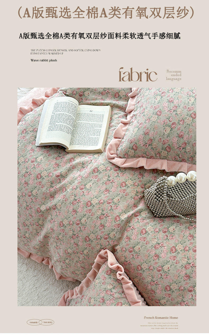 当前位置: 91家纺网 > 商品网购 > 床品套件 > 四件套 > 其它四件套 > 麦伦家居 2025新款多功能床品全棉A类有氧双层纱+豆豆绒四件套荷叶边系列 花样年华