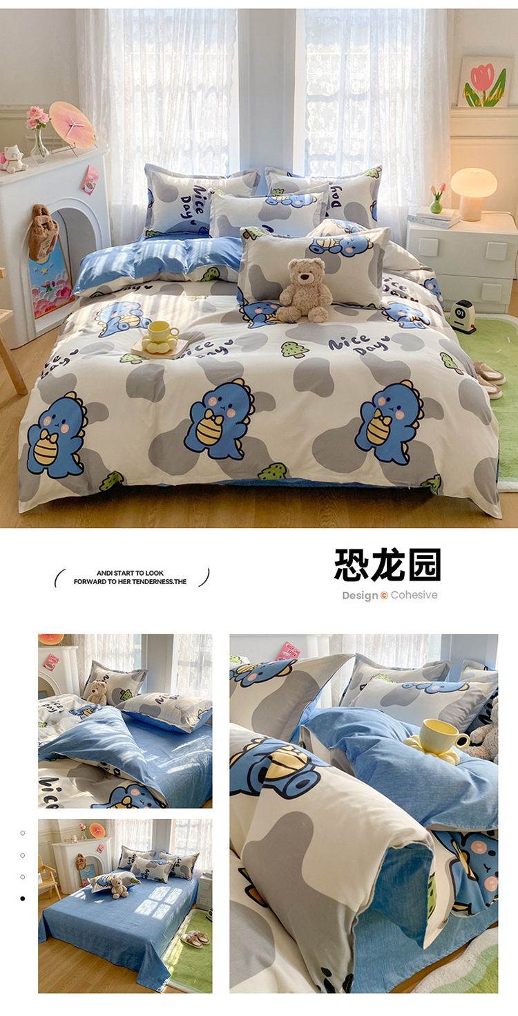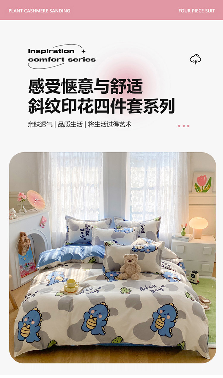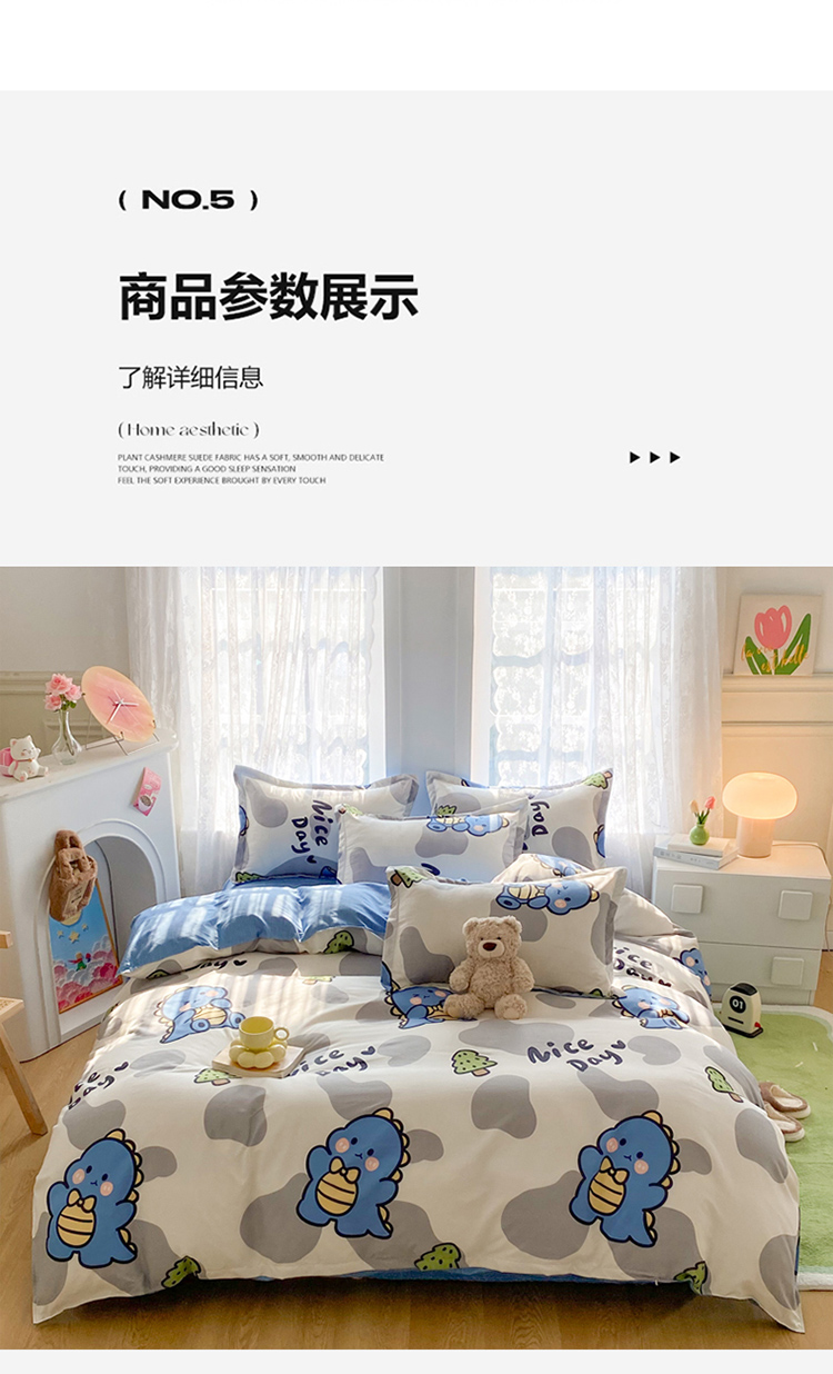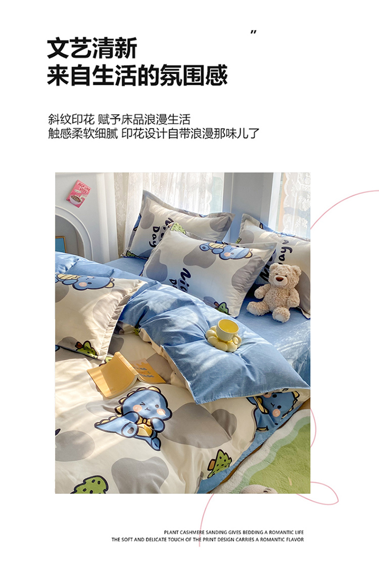 当前位置: 91家纺网 > 商品网购 > 床品套件 > 四件套 > 化纤普通四件套 > 简冠家纺 2024直播爆款北欧风亲肤植物羊绒磨毛四件套恐龙园