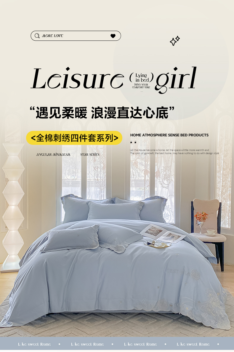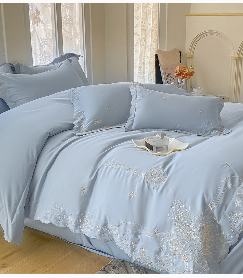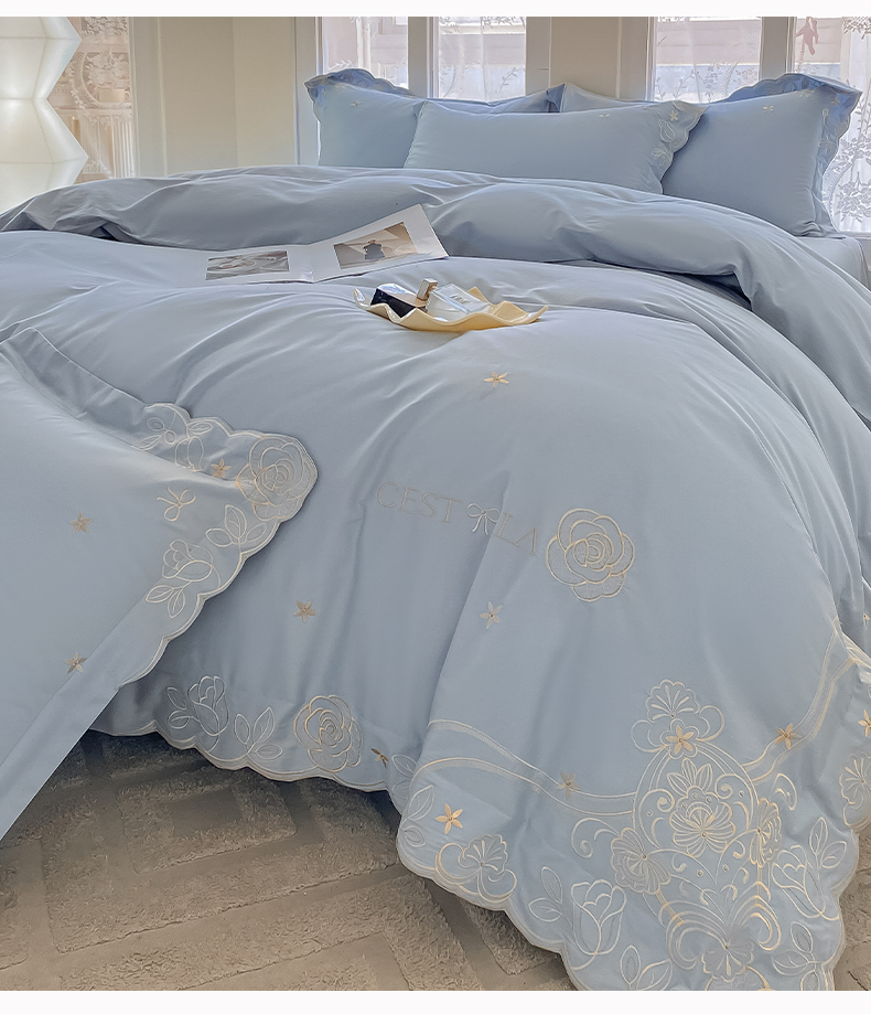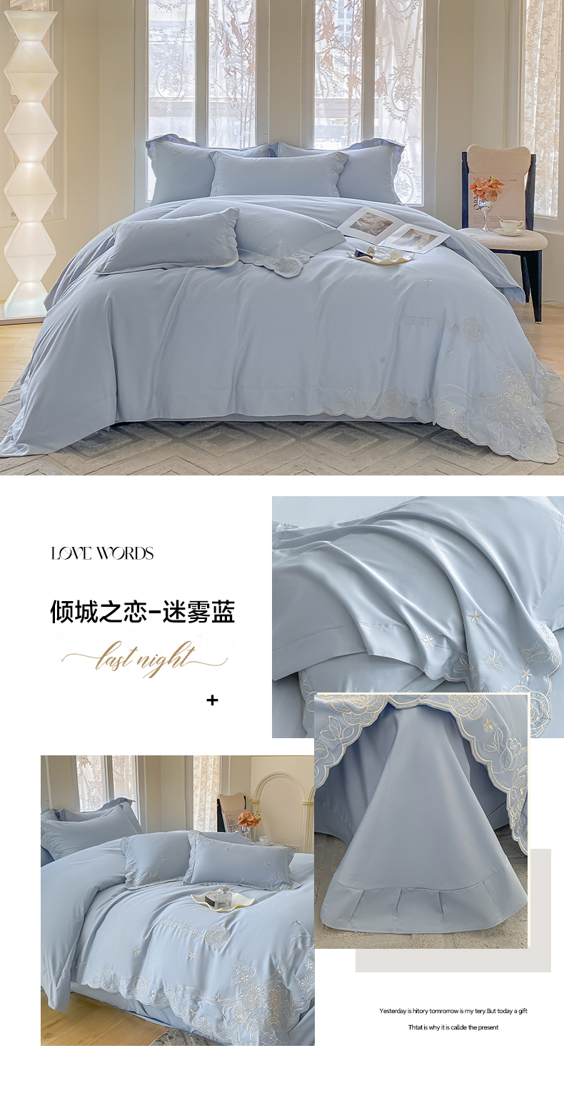 祺瑞佳家纺 2025新款A类100%双面纯棉法式刺绣花四件套全棉长绒棉四季款床单床笠——倾城之恋 倾城之恋-迷雾蓝