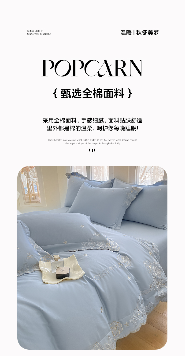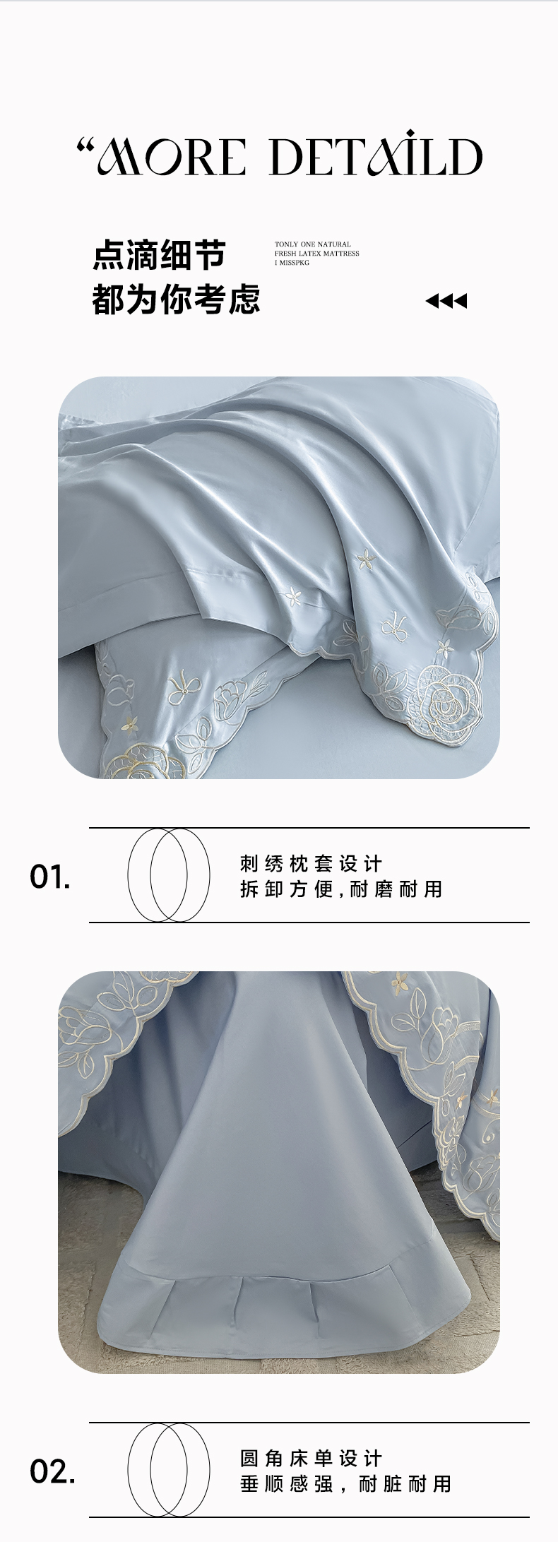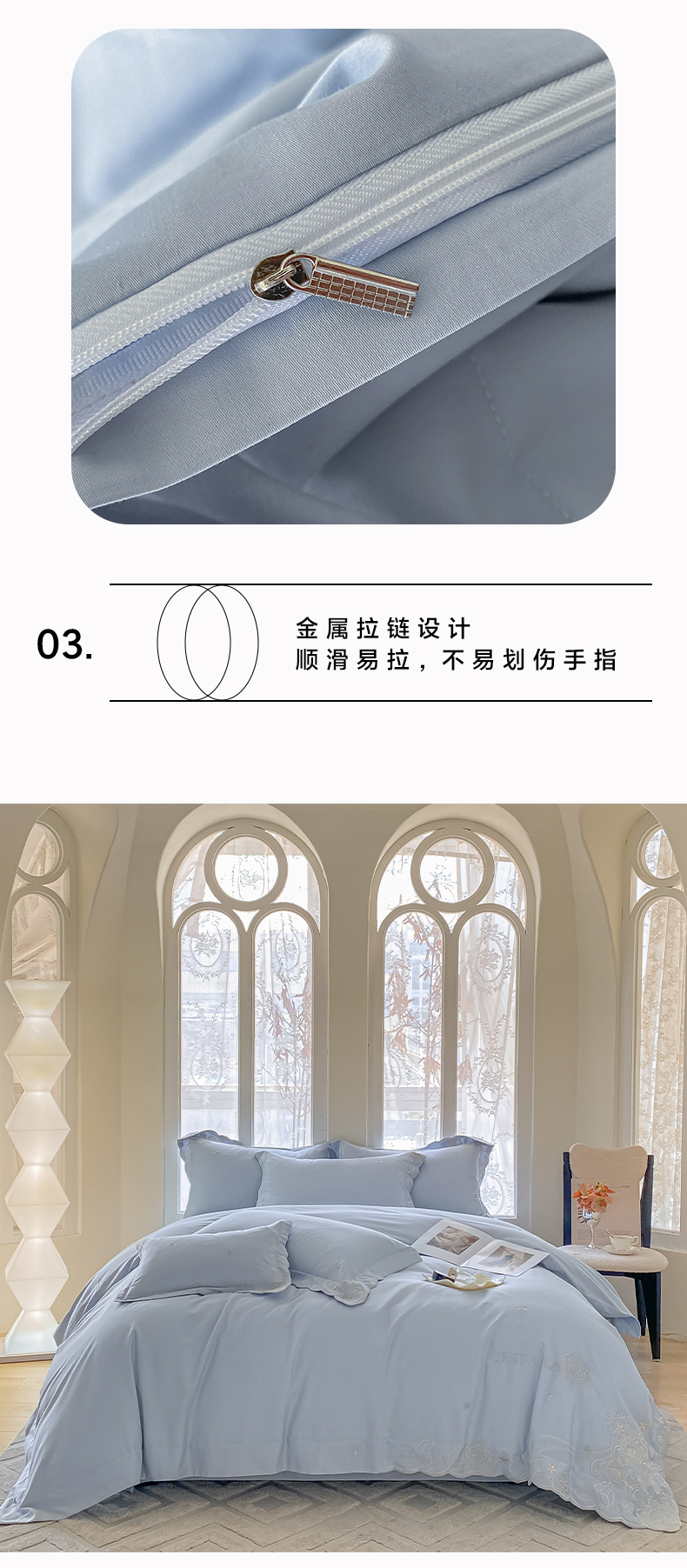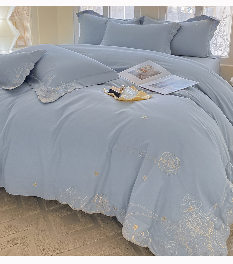 商品名称:祺瑞佳家纺 2025新款A类100%双面纯棉法式刺绣花四件套全棉长绒棉四季款床单床笠——倾城之恋 倾城之恋-迷雾蓝
