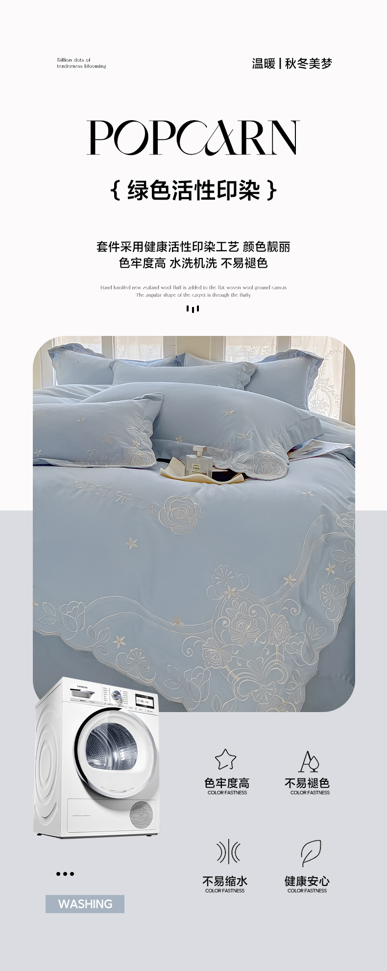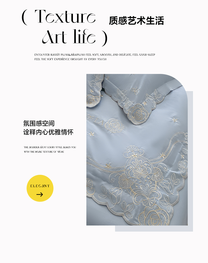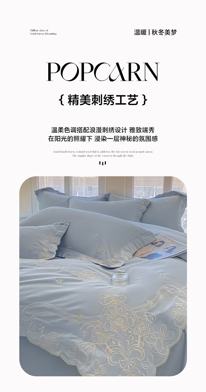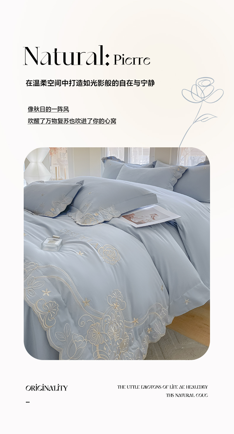 商品名称:祺瑞佳家纺 2025新款A类100%双面纯棉法式刺绣花四件套全棉长绒棉四季款床单床笠——倾城之恋 倾城之恋-迷雾蓝