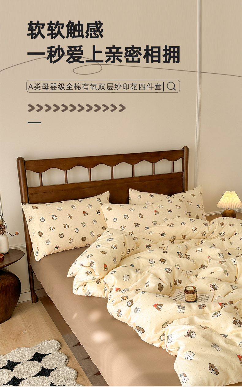 呗旺鹿 2025新款A类母婴级全棉有氧双层纱印花四件套 富贵狗