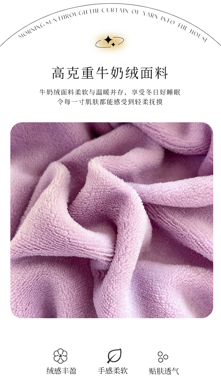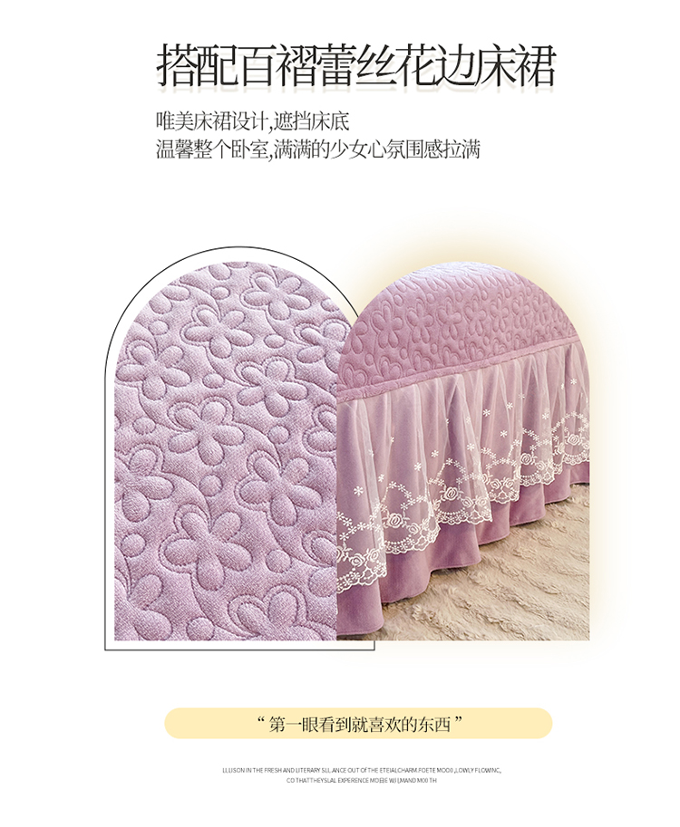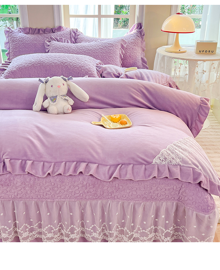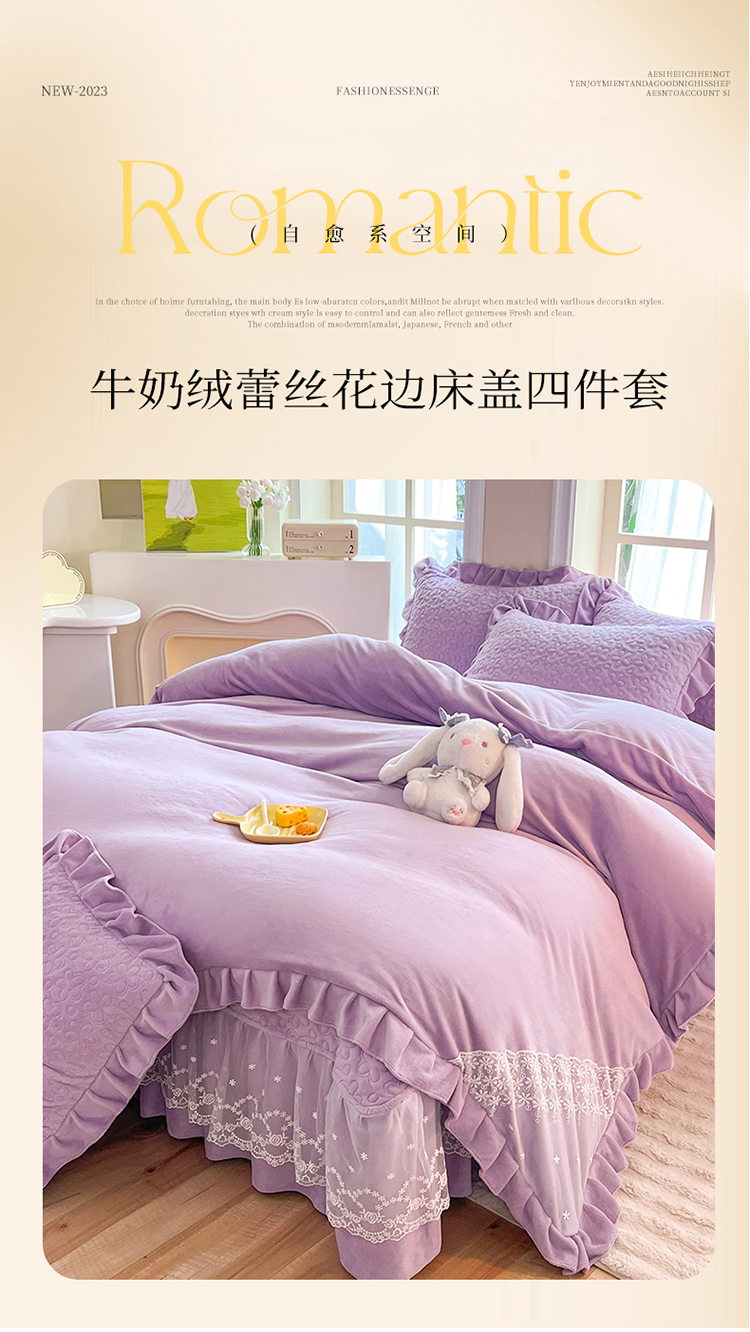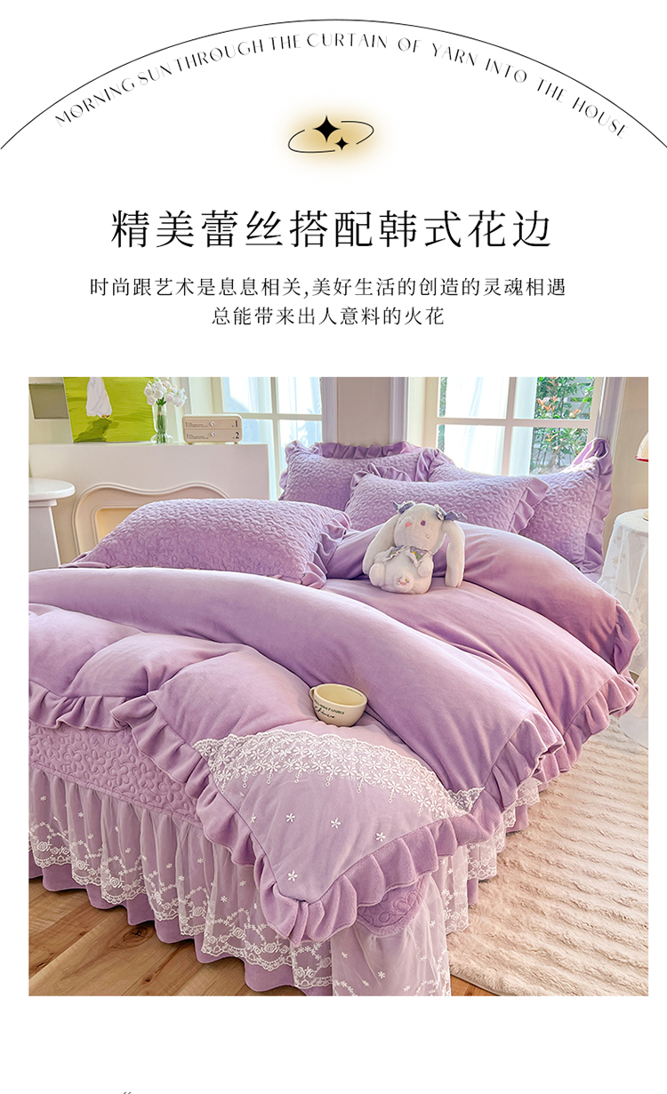 商品名称:2025秋冬新款220g全消光牛奶绒床盖四件套12斤重加厚婴儿绒法莱绒床裙款床盖款四件套 浪漫花语—梦幻紫