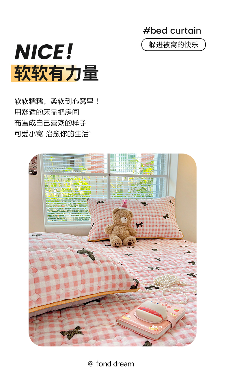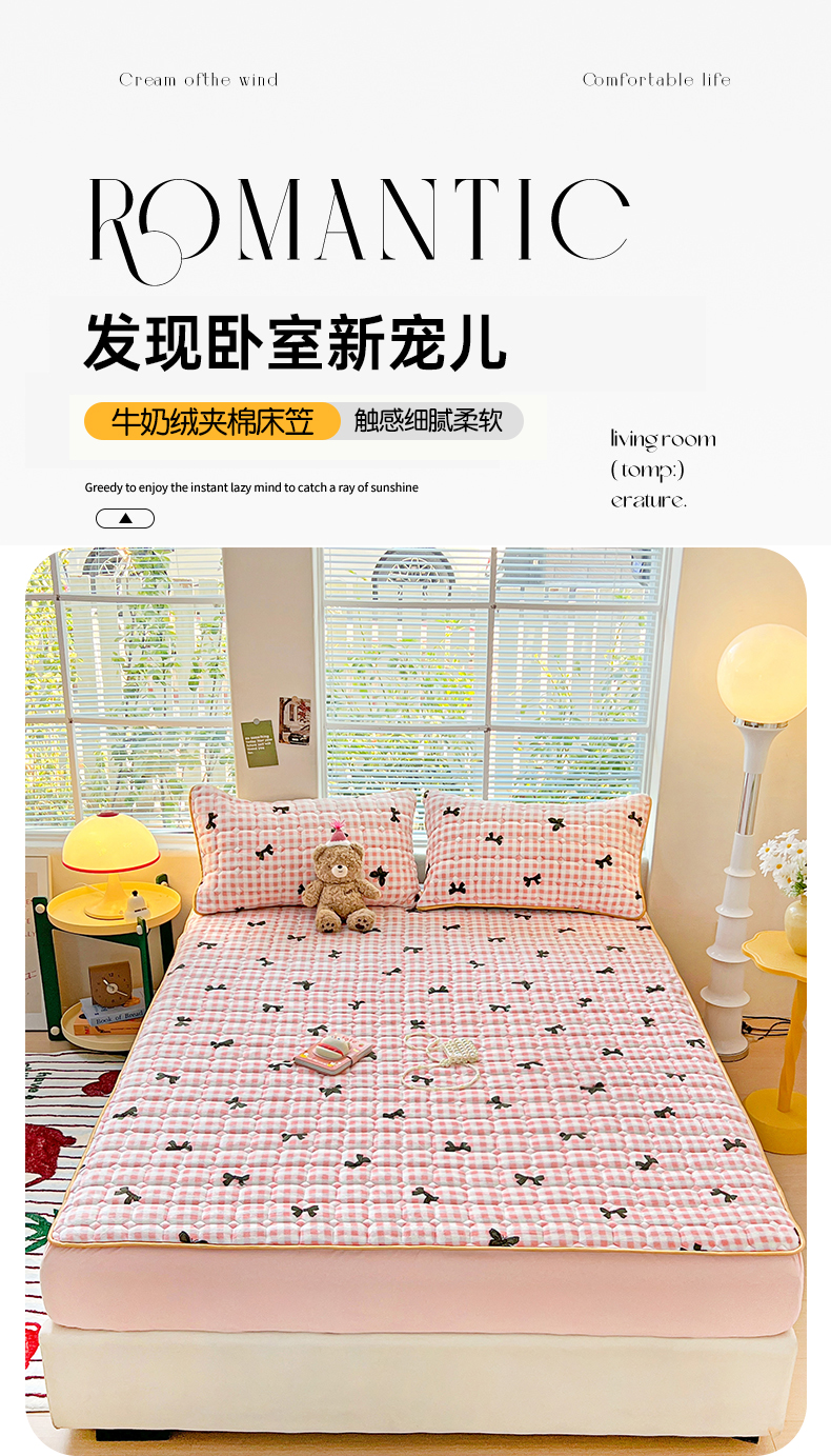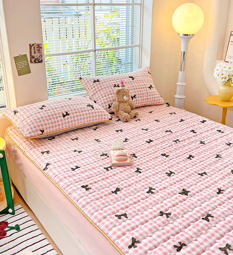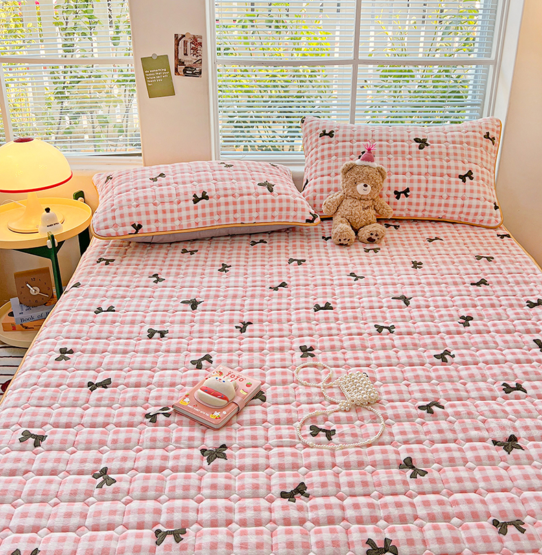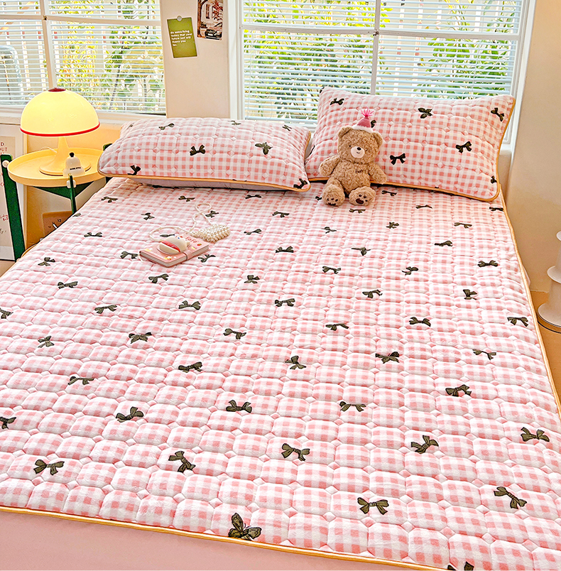 • 91家纺网 家纺一手货源 找家纺 帛洵 2025新款舒适亲肤高克重牛奶绒夹棉床笠 蝴蝶结-粉