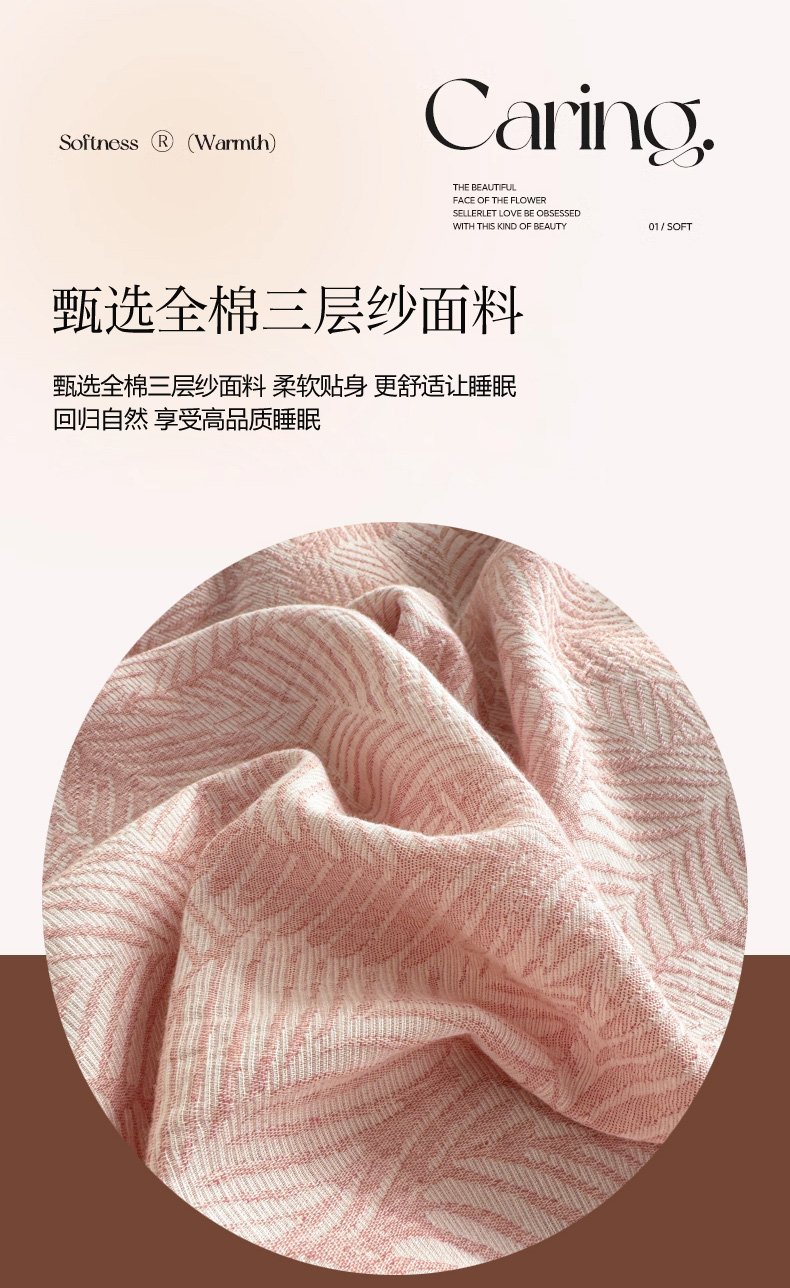当前位置: 91家纺网 > 商品网购 > 床上用品 > 被套 > 眠博士2025新款AB版简约时尚A类全棉三层纱系列单被套 三层纱-幸运叶-粉