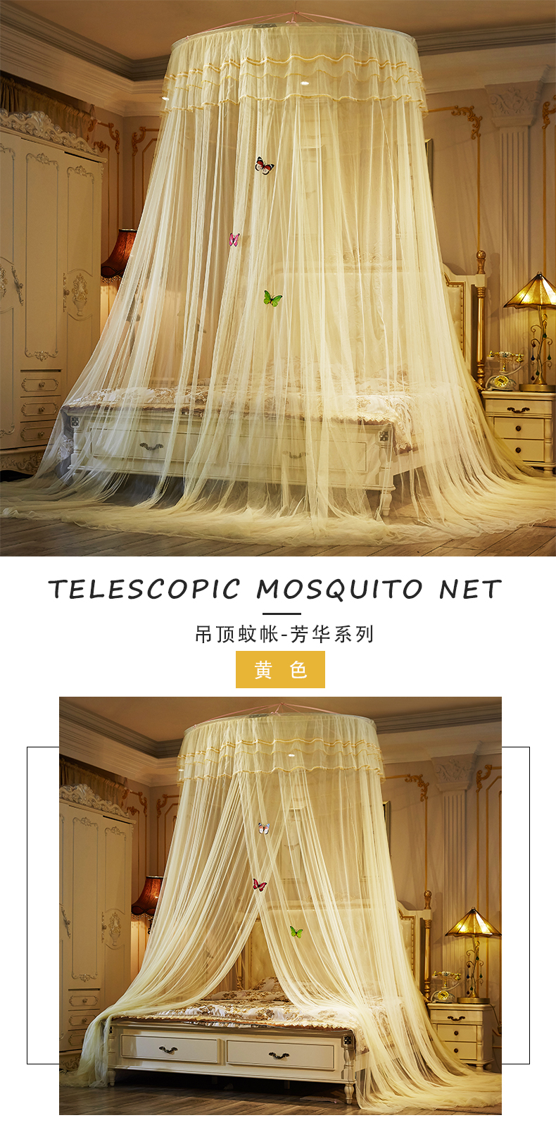 商品名称:宝莱利 2025年新款1.5米直径圆顶吊顶落地蚊帐-芳华 米黄