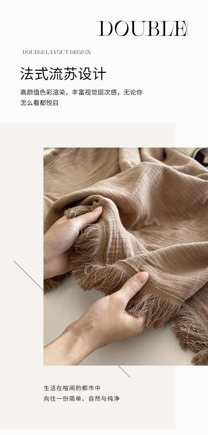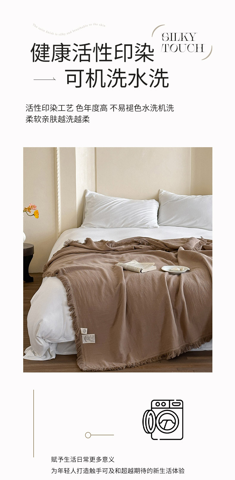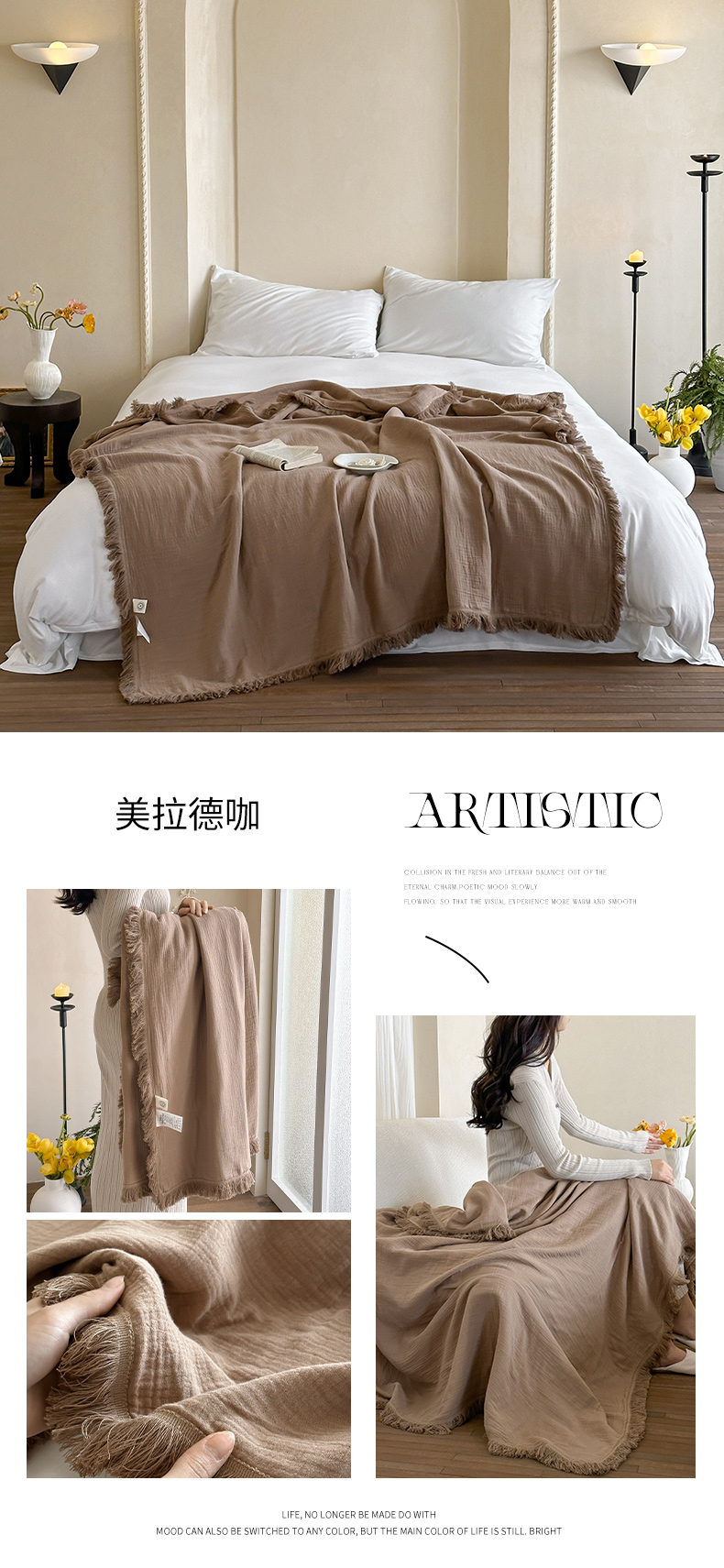 三朵 2025新款全棉四层绉绉纱流苏多功能毯 美拉德咖