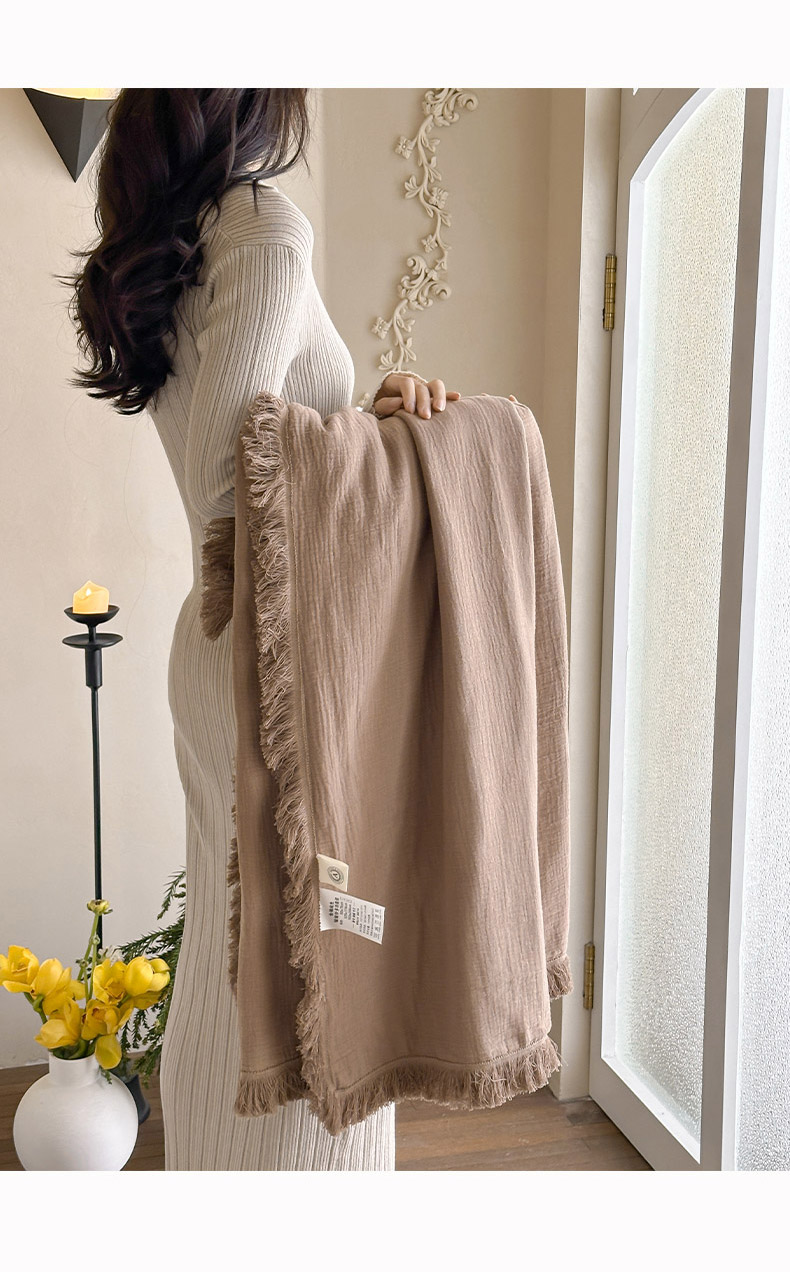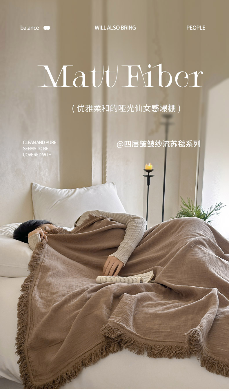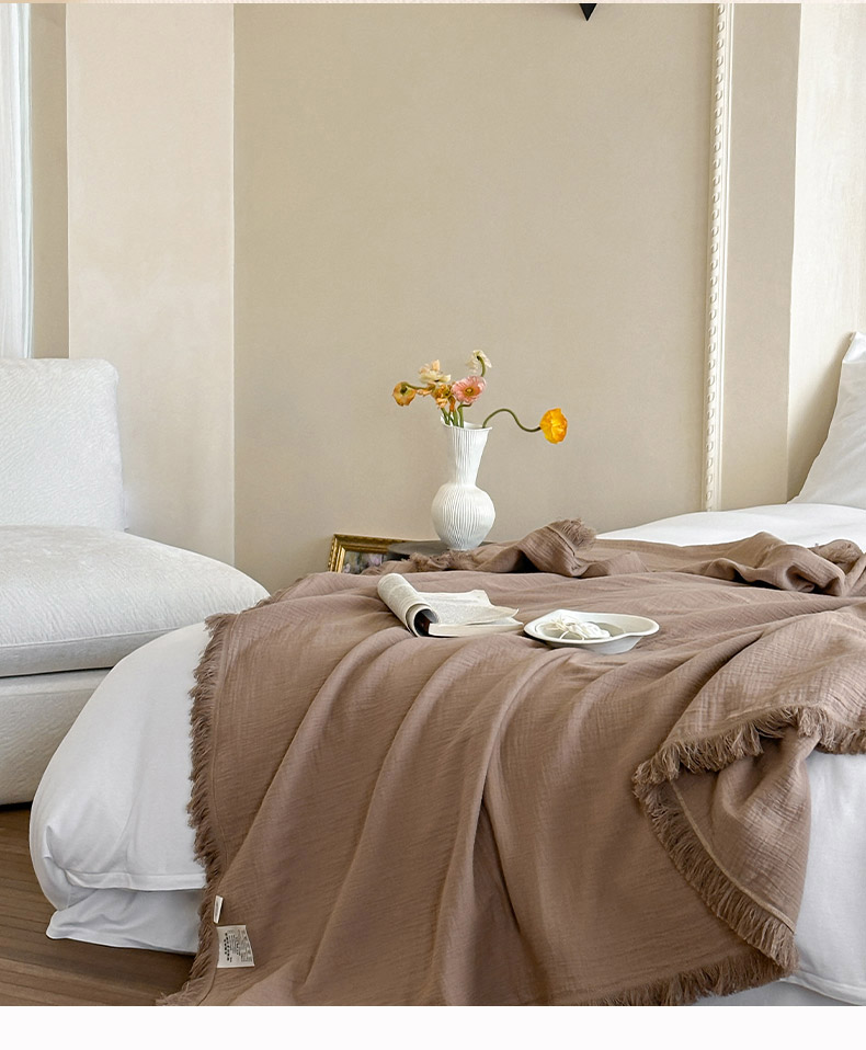 三朵 2025新款全棉四层绉绉纱流苏多功能毯 美拉德咖