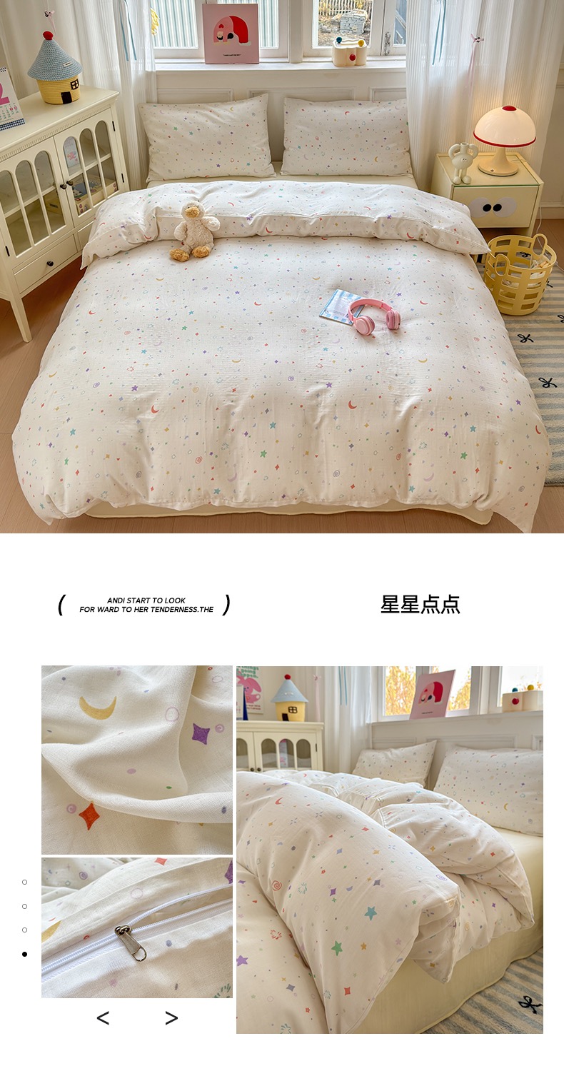 商品名称:2025新款双层纱印花卡通四件套-床拍 星星点点