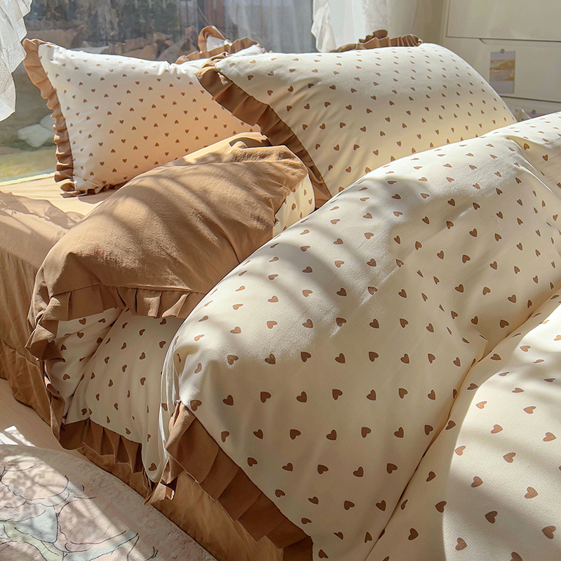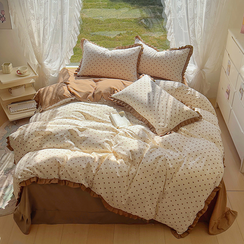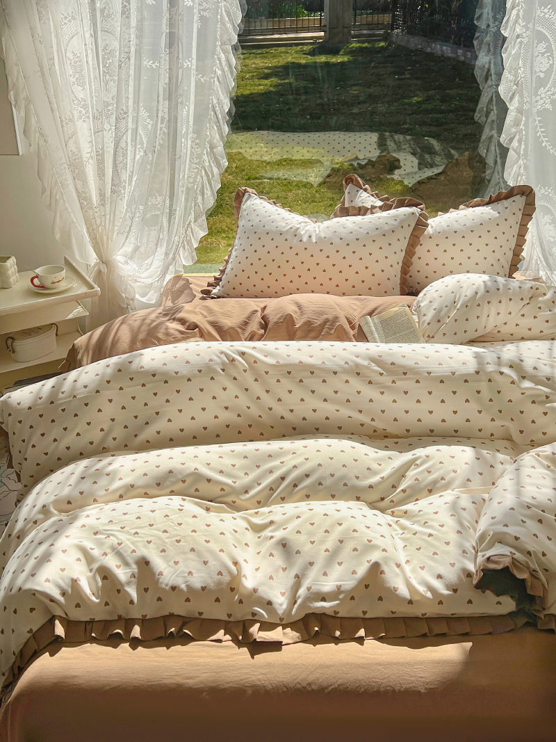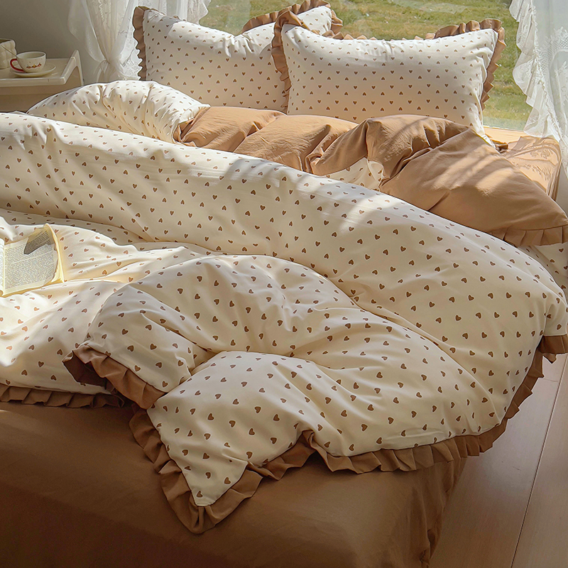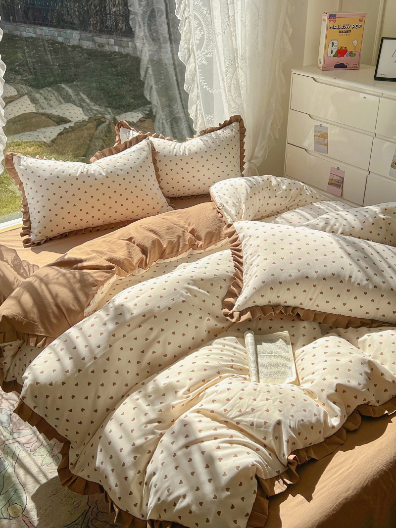 商品名称:欧尚 2025新款针织棉双层纱四件套 咖爱心