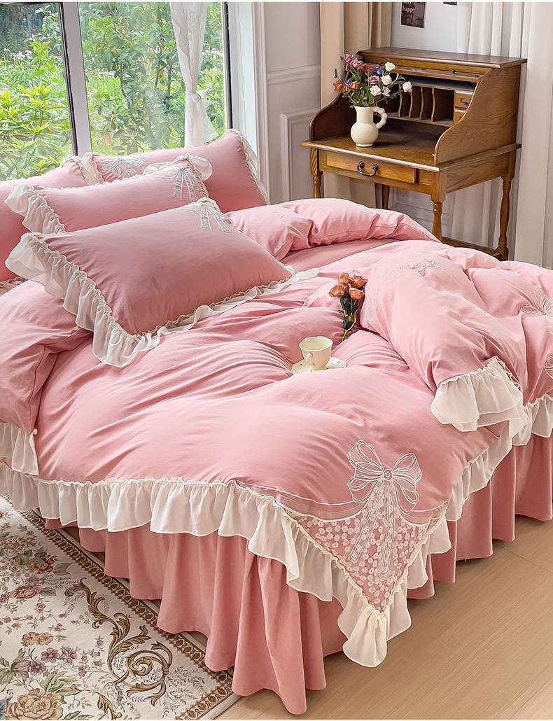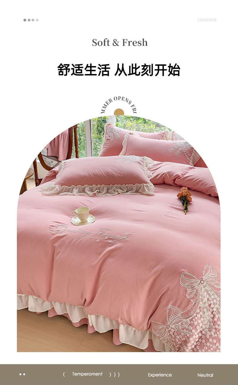 睡美人 2025韩版全锦棉刺绣公主风蕾丝床裙款四件套-蝶恋花 蝶恋花-锦豆沙