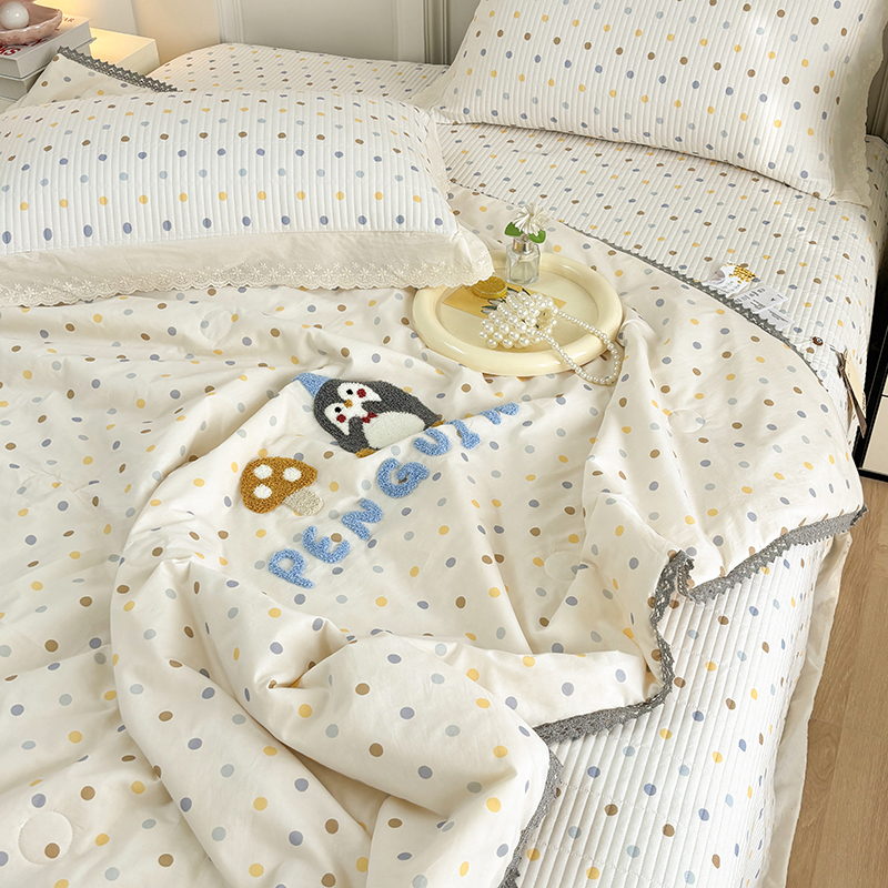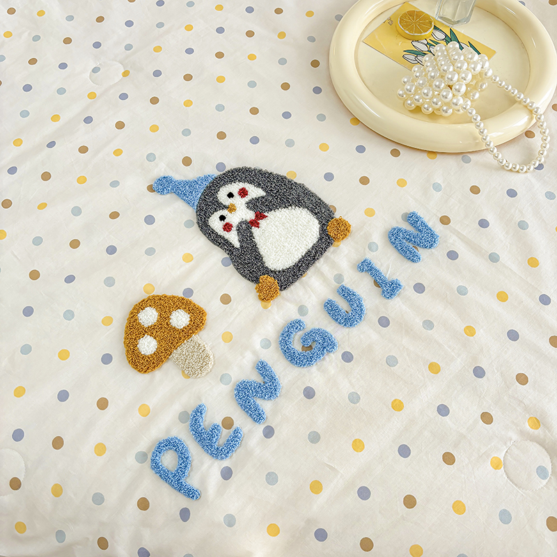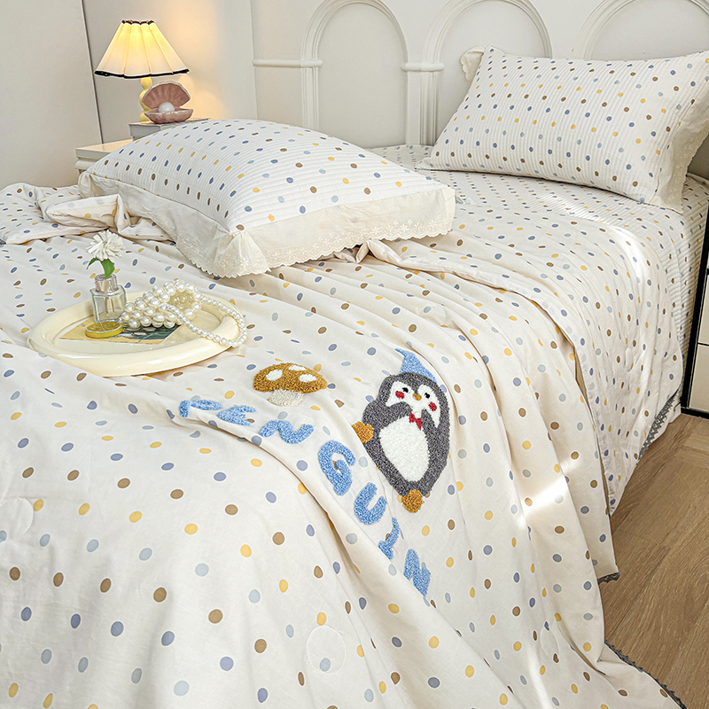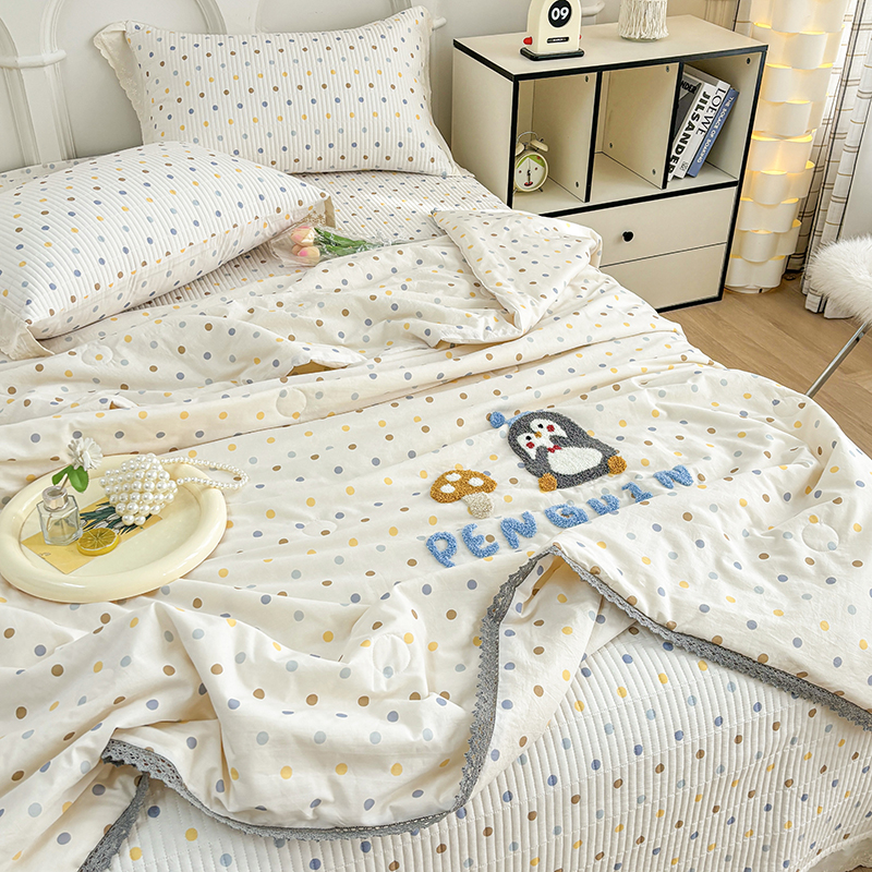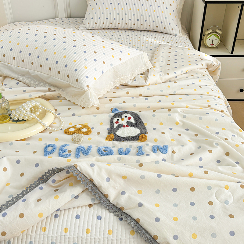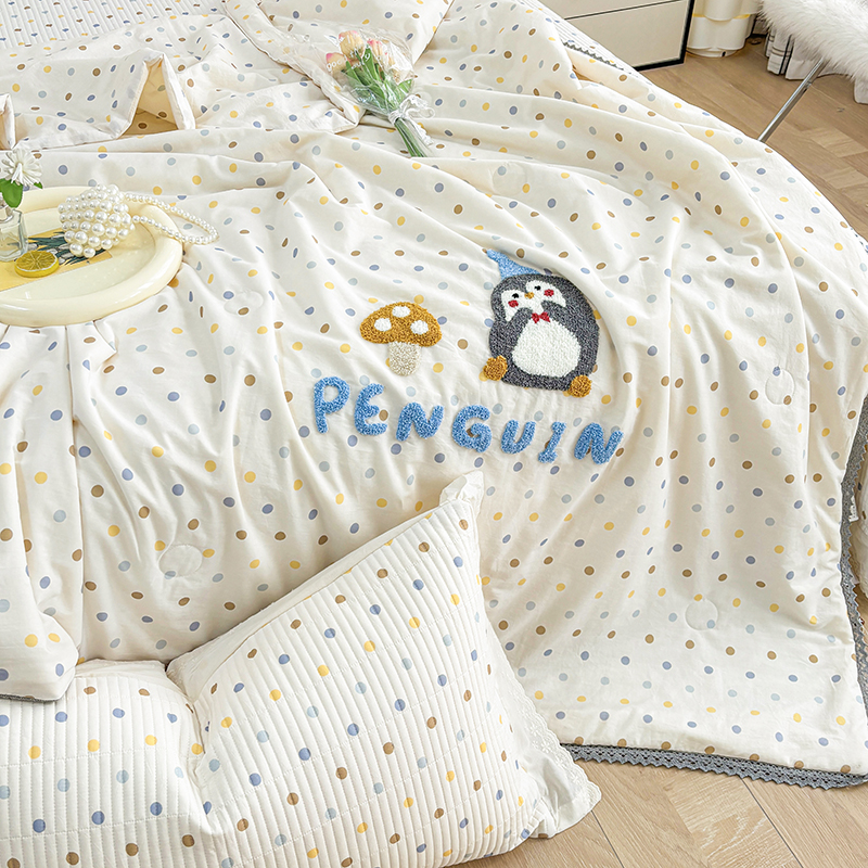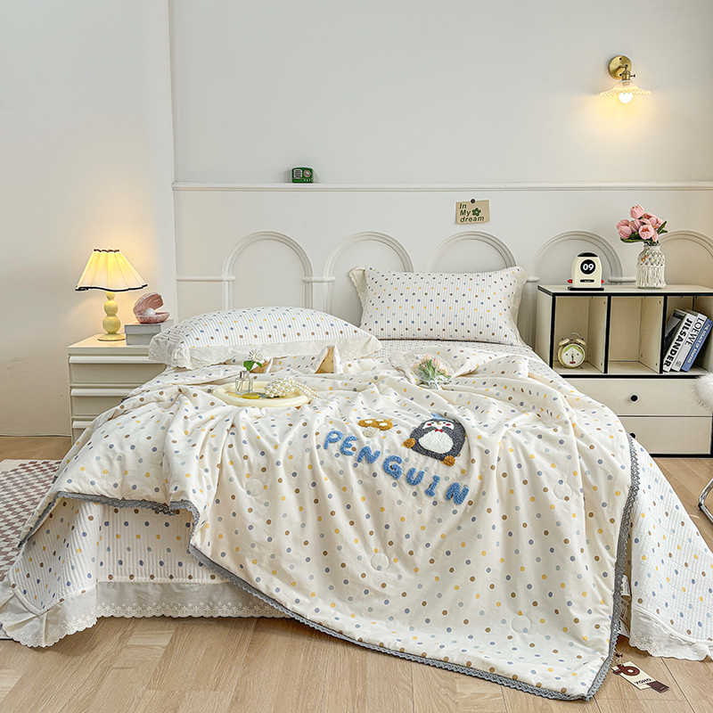 • 91家纺网 家纺一手货源 找家纺 有货2025新款云纱棉毛巾绣夏被+床盖三件套 小企鹅
