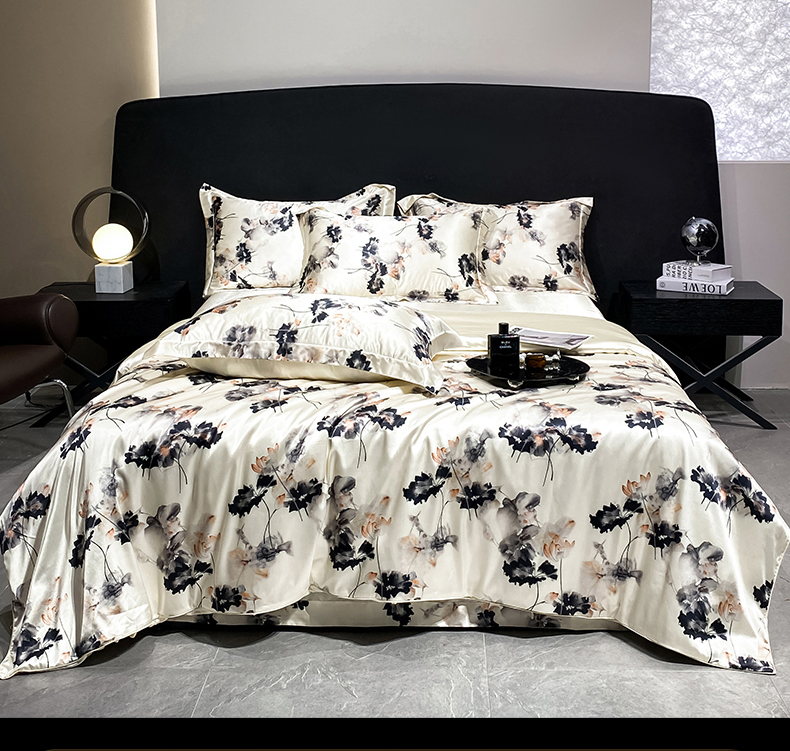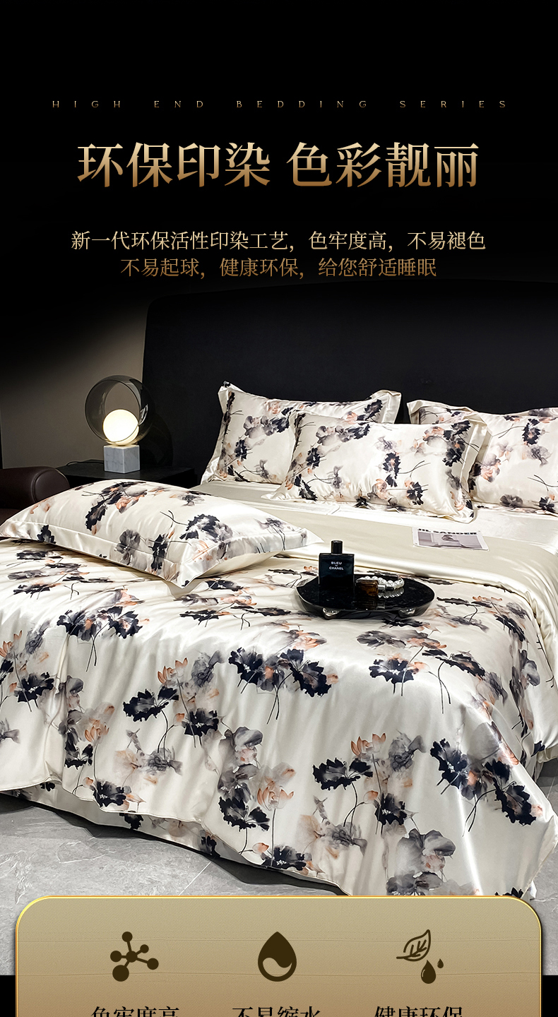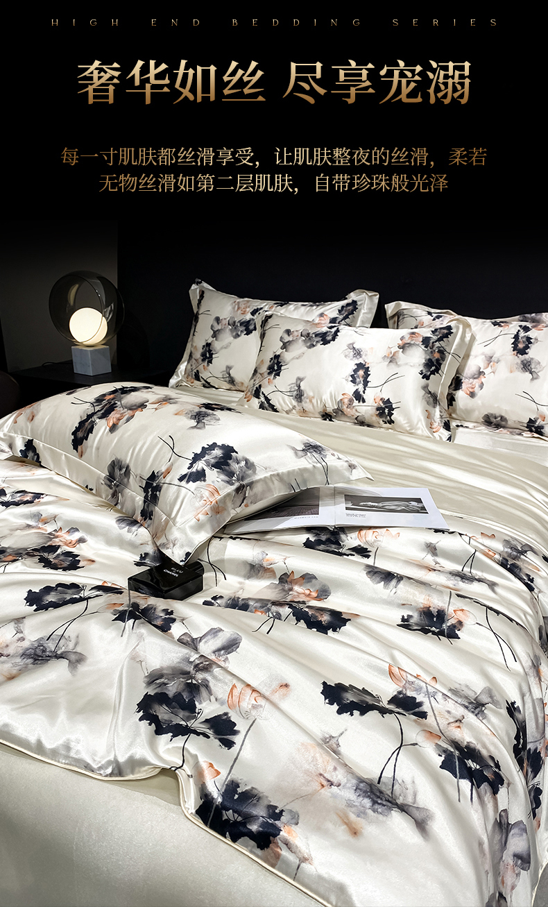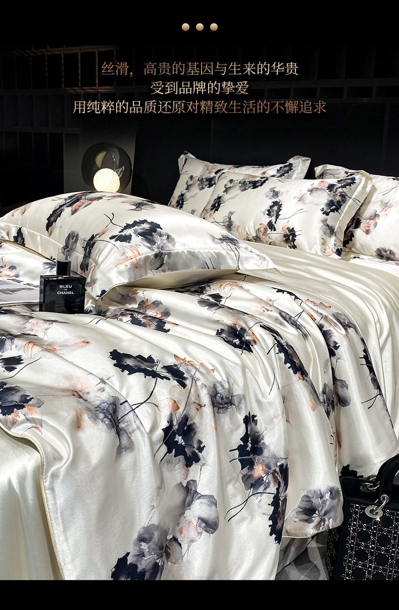 商品名称:黄鹂鸟 2025新款高端轻奢丝滑裸睡丝绸数码印花水洗真丝天丝四件套系列 -风格四 雾里看花