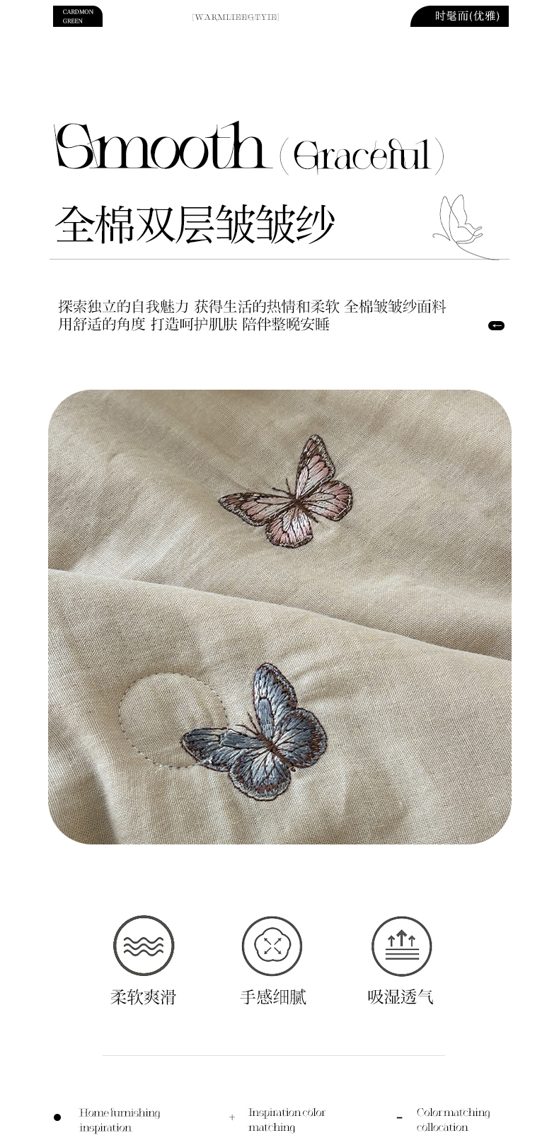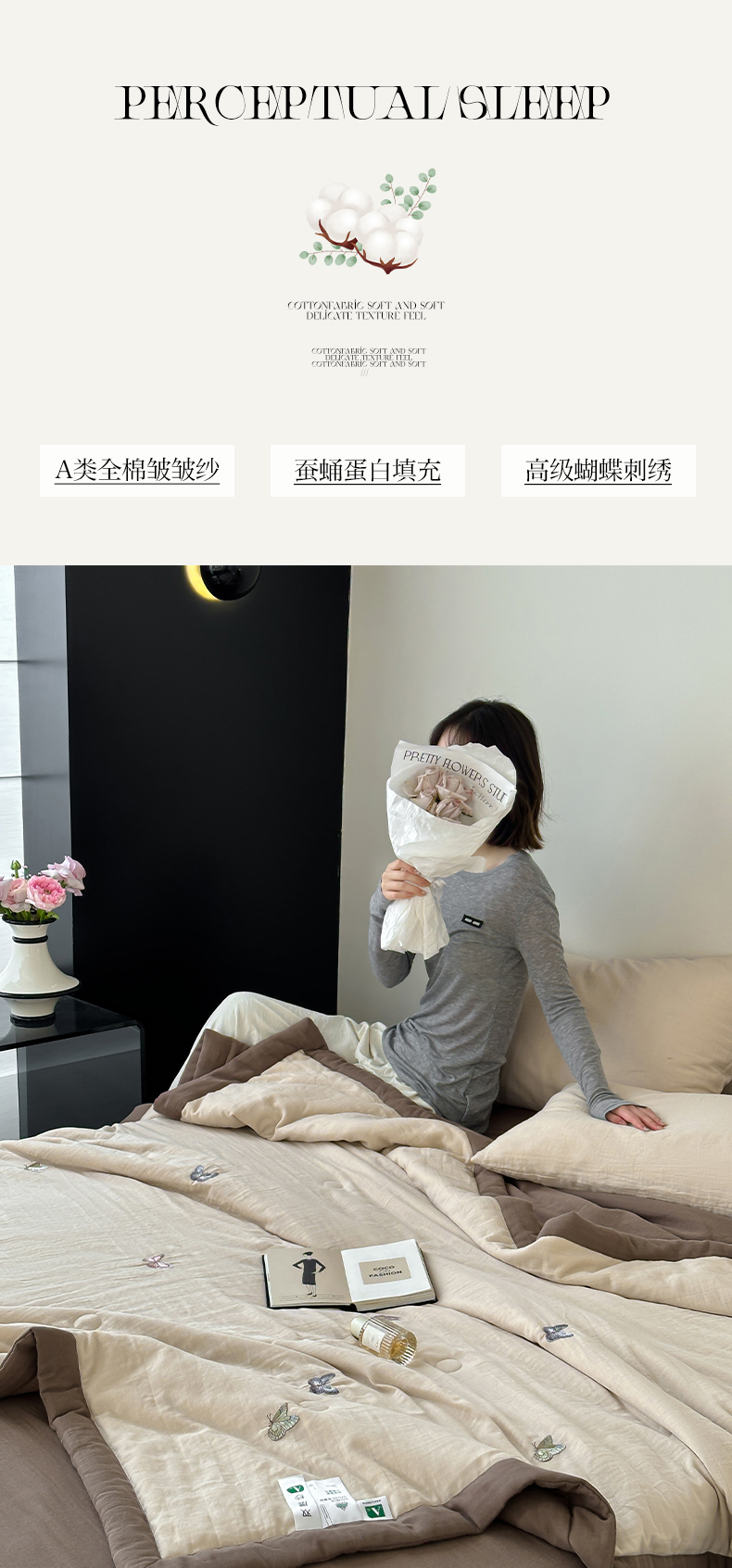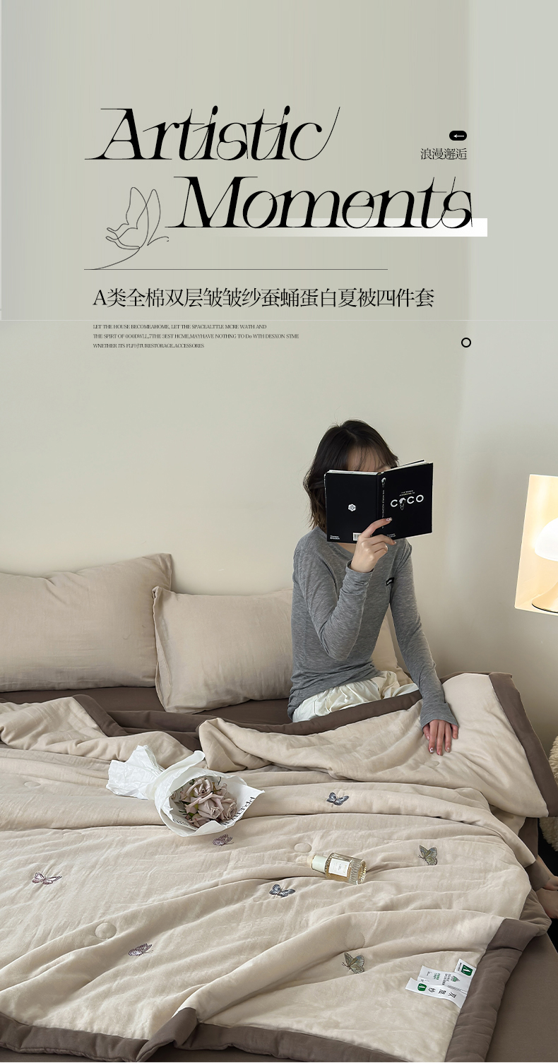 当前位置: 91家纺网 > 商品网购 > 床品套件 > 四件套 > 夏被四件套 > 一加一 2025新款A类全棉双层皱皱纱蚕蛹蛋白夏被四件套(蝶梦系列) 蝶梦-米咖