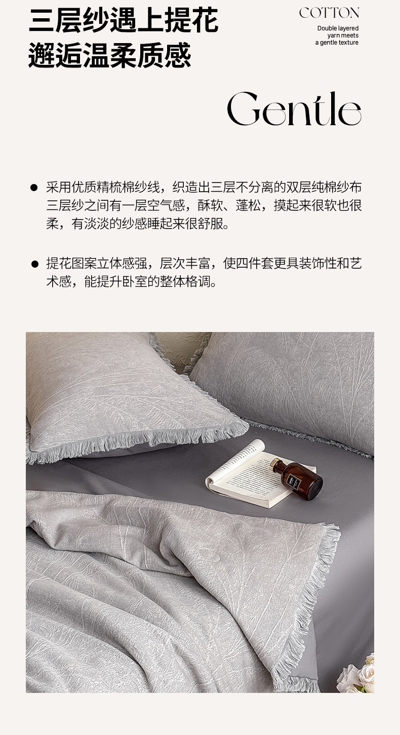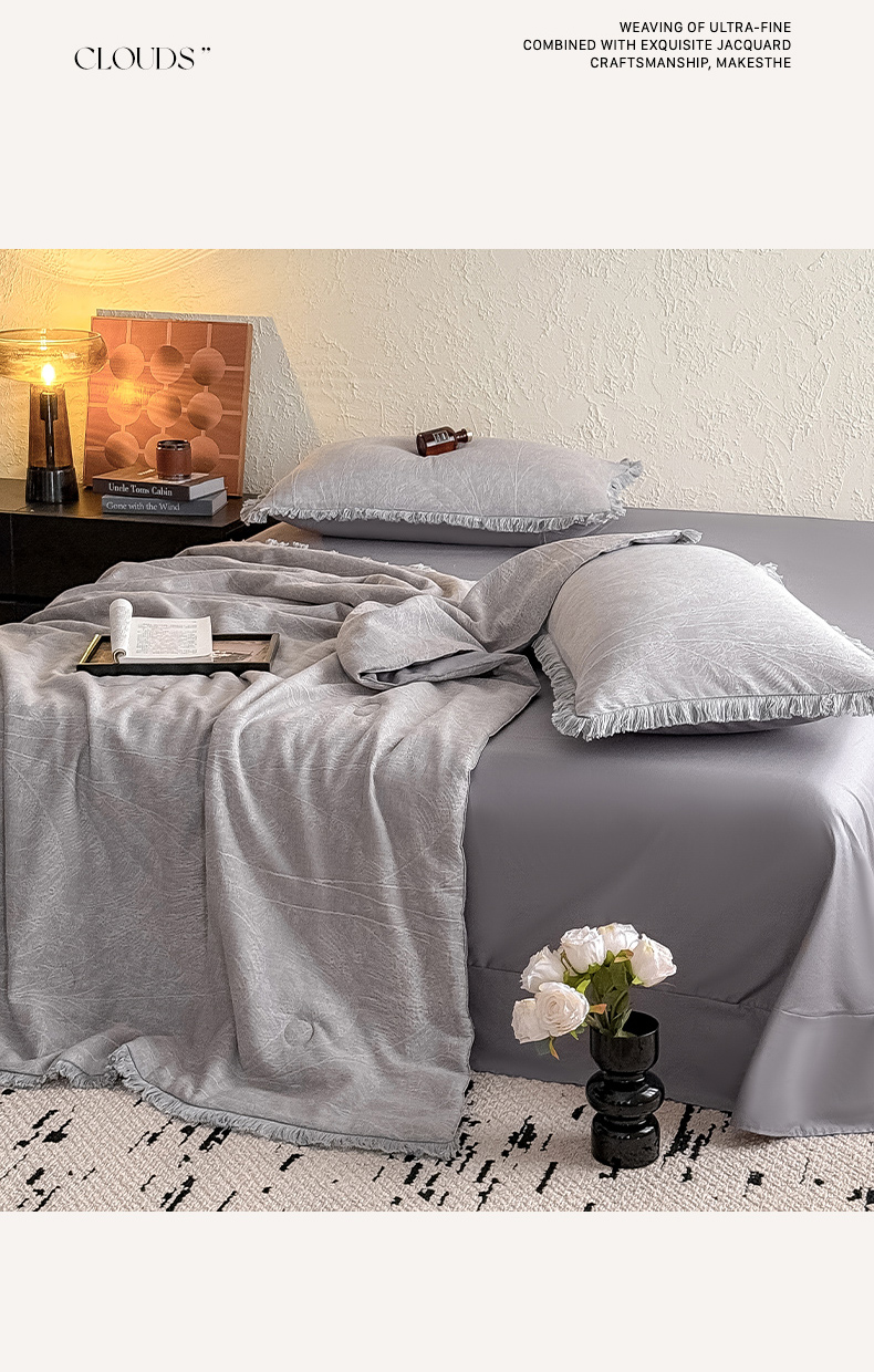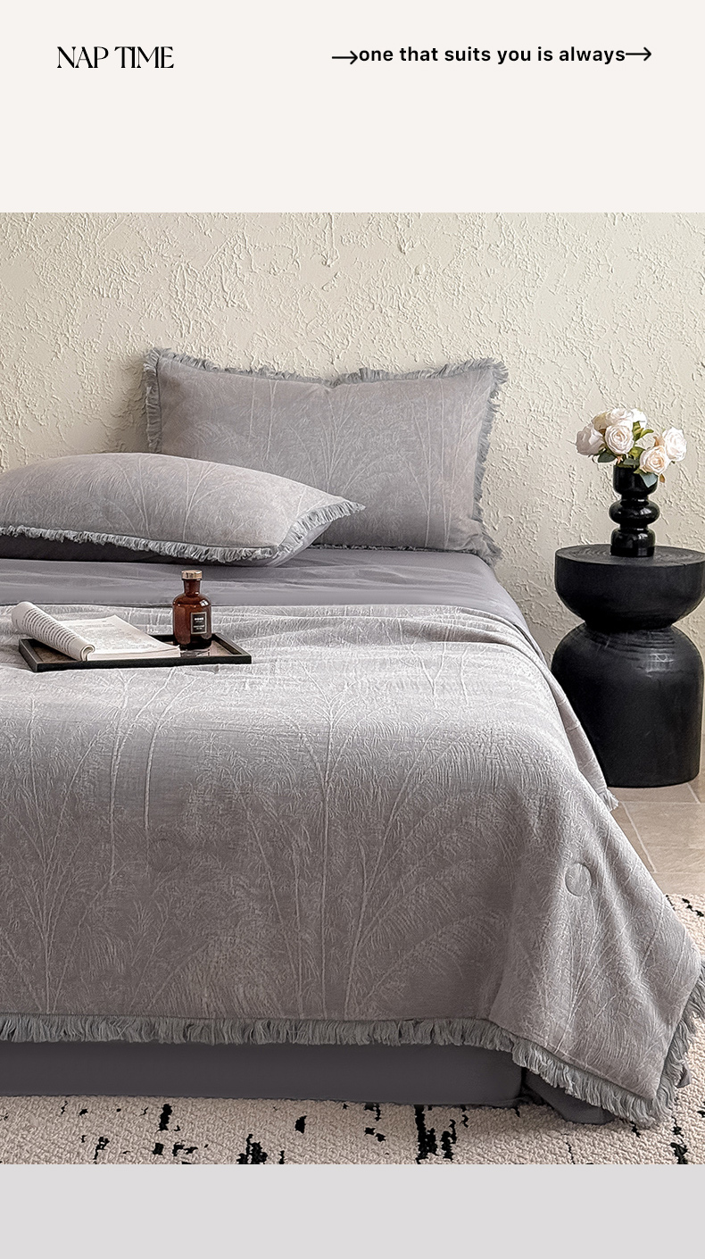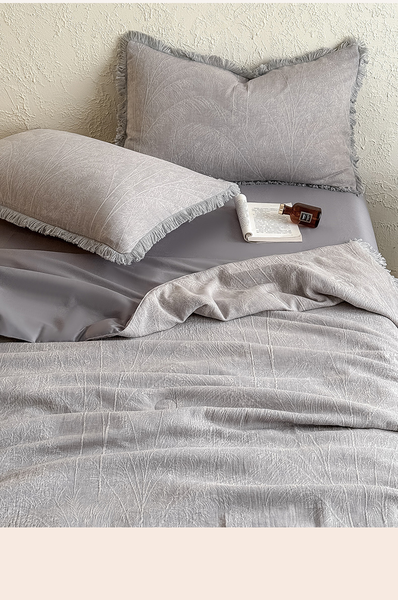 当前位置: 91家纺网 > 商品网购 > 床品套件 > 四件套 > 全棉活性四件套 > 2025新款全棉三层纱提花夏被四件套 竹影-灰紫