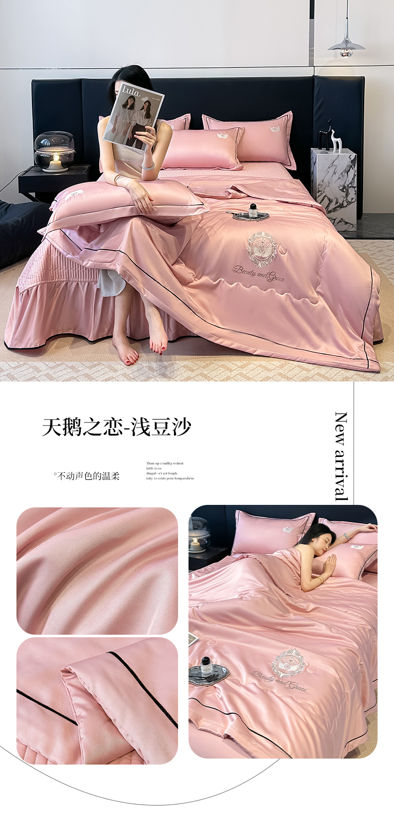 商品名称:富米莱(原臻工厂) 2025新款水洗真丝冰丝刺绣夏被床盖四件套夏凉被 天鹅之恋-浅豆沙