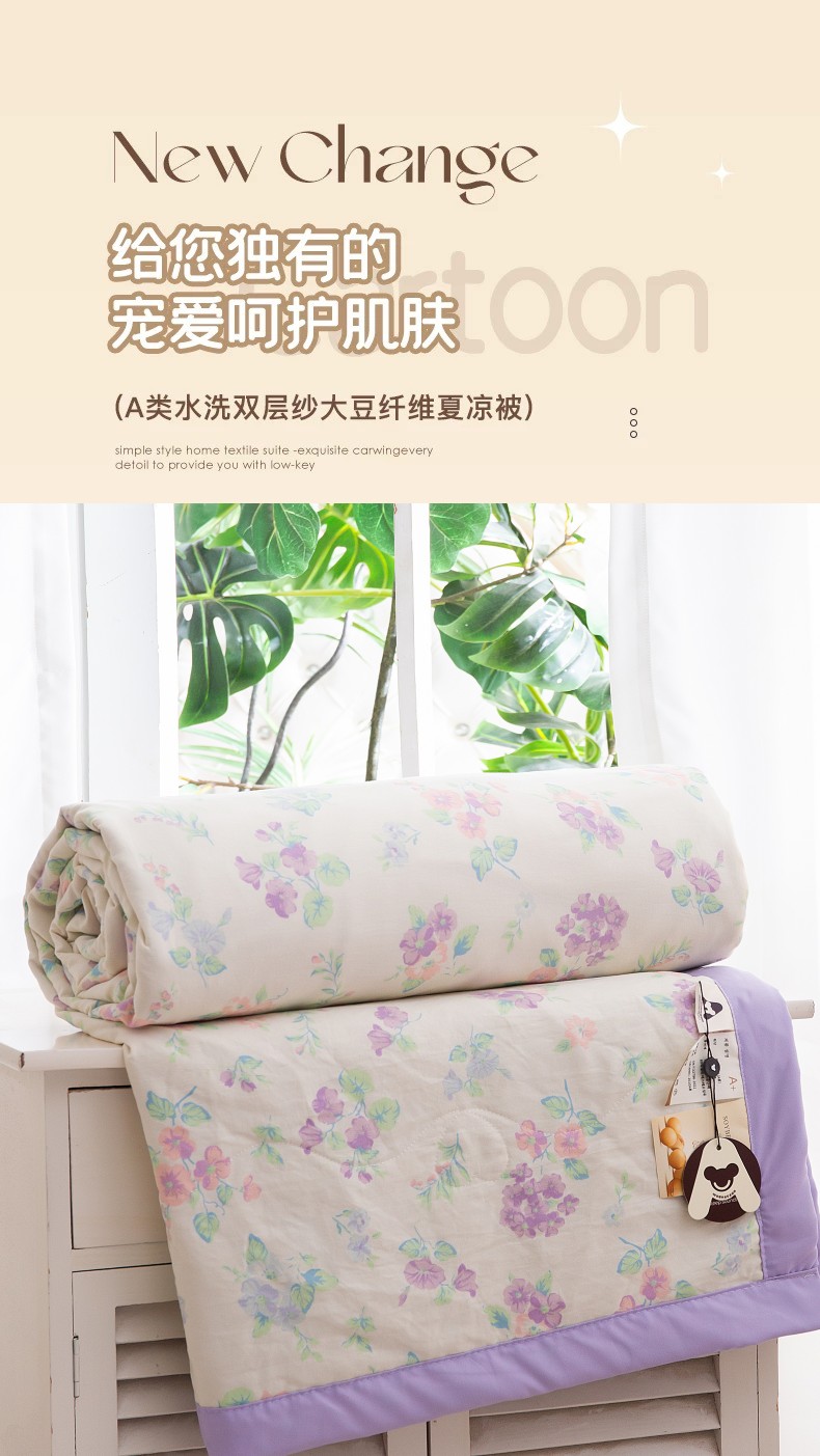 (总)博睿家纺 2025新款A类水洗双层纱皱皱纱大豆纤维被夏被夏凉被空调被,曼塔玫瑰,夕颜,紫色花语,花园兔,猫咪日记,兰格心语