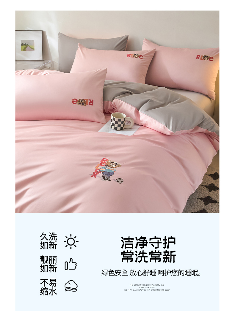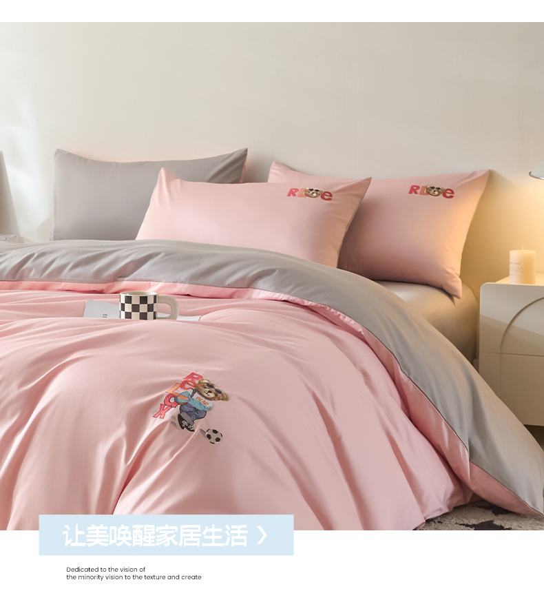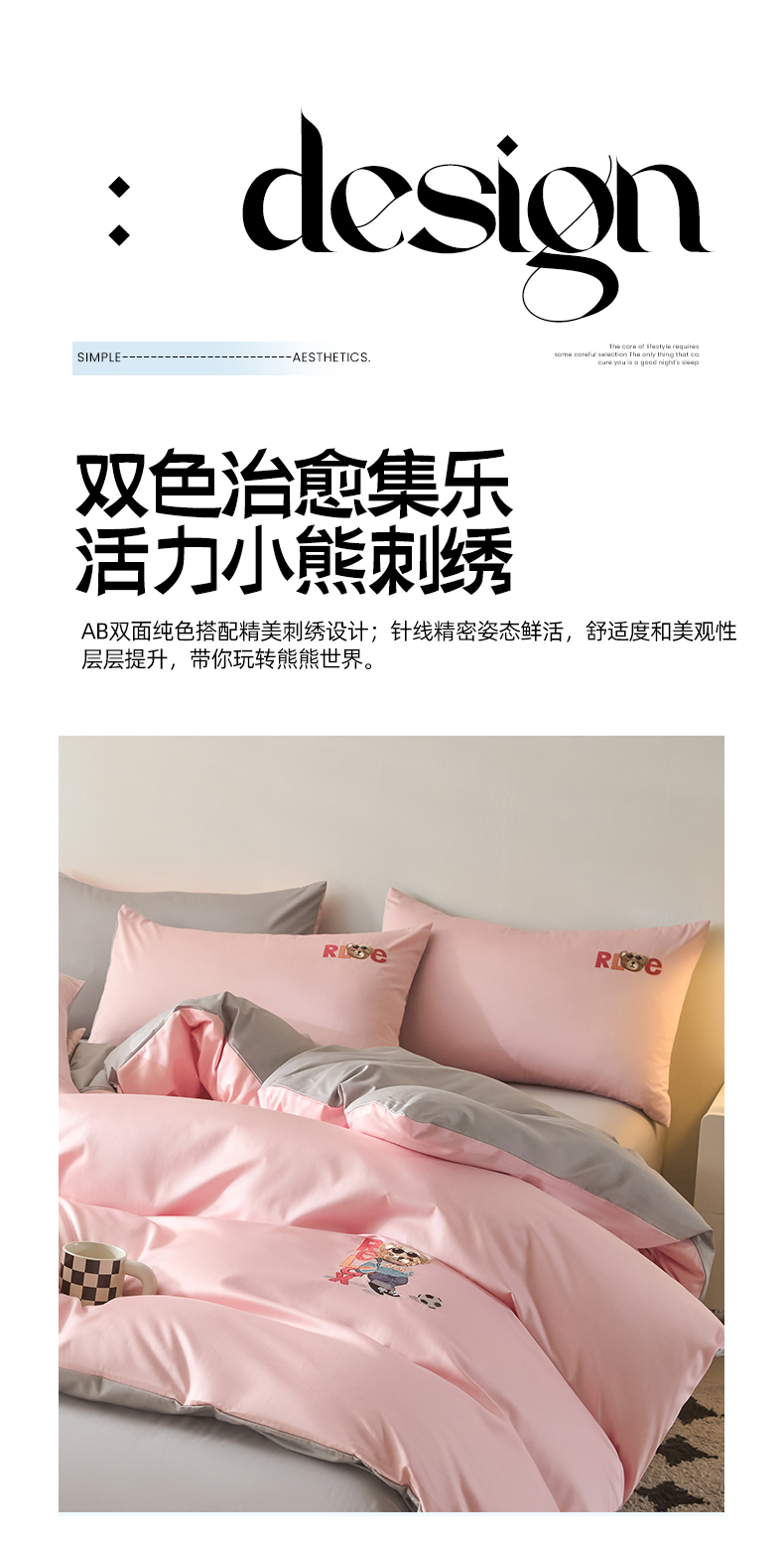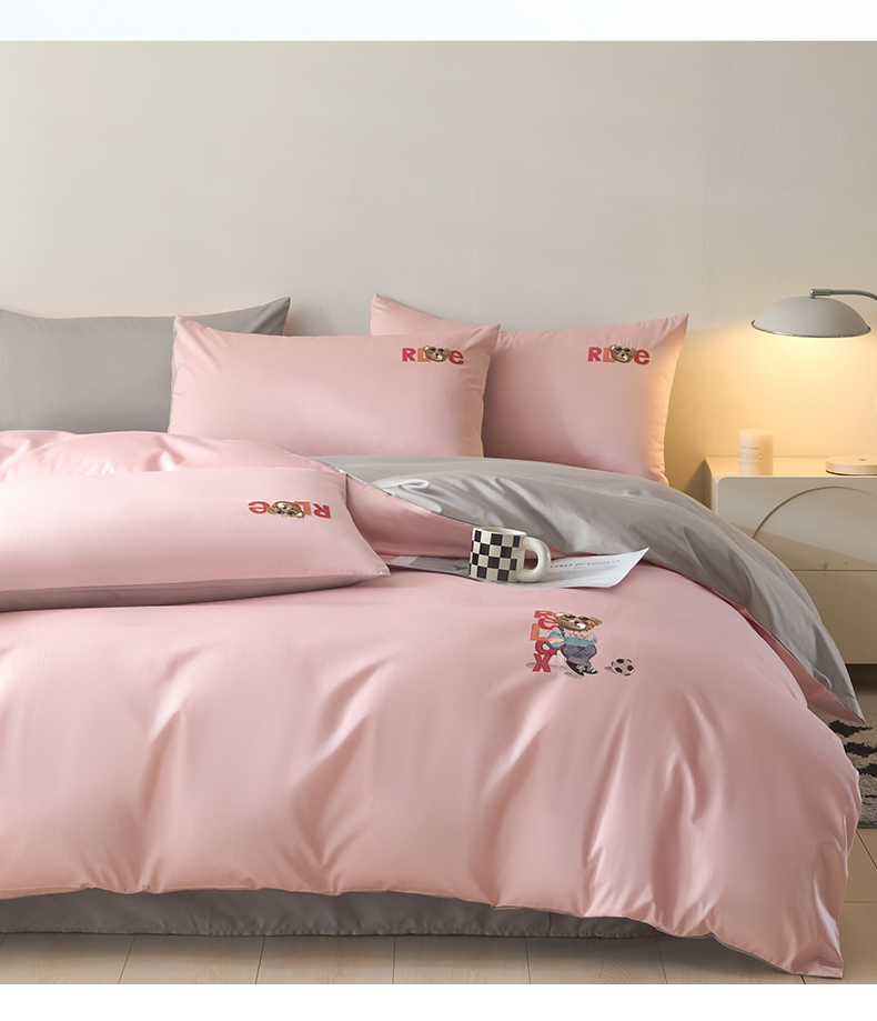 拼社家纺 2025新款全棉长绒棉四件套纯棉四件套小熊刺绣床上用品【提供买家秀】 可爱熊-粉灰