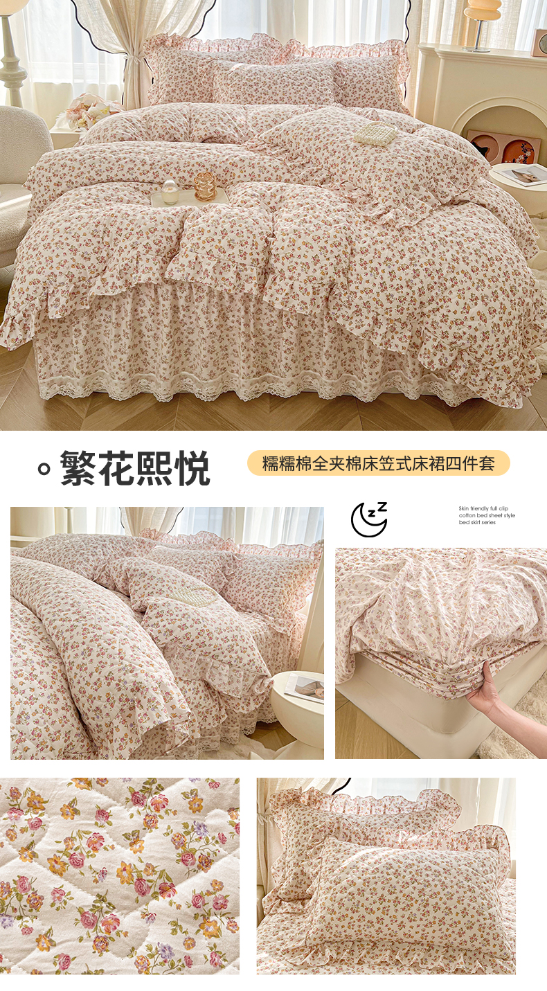 • 91家纺网 家纺一手货源 找家纺 宜凡家纺 2025新款糯糯棉全夹棉床笠式床裙四件套 繁花熙悦