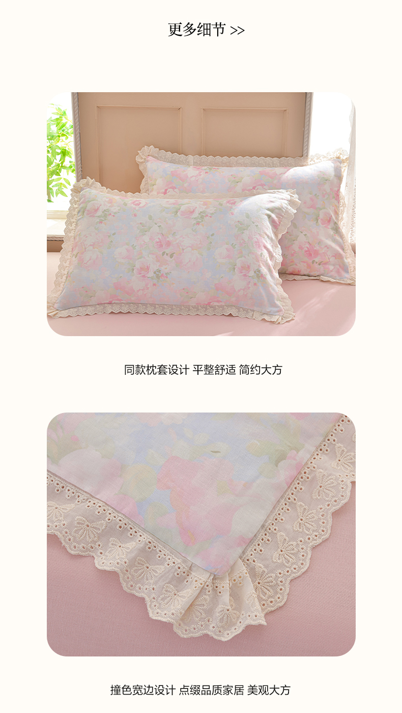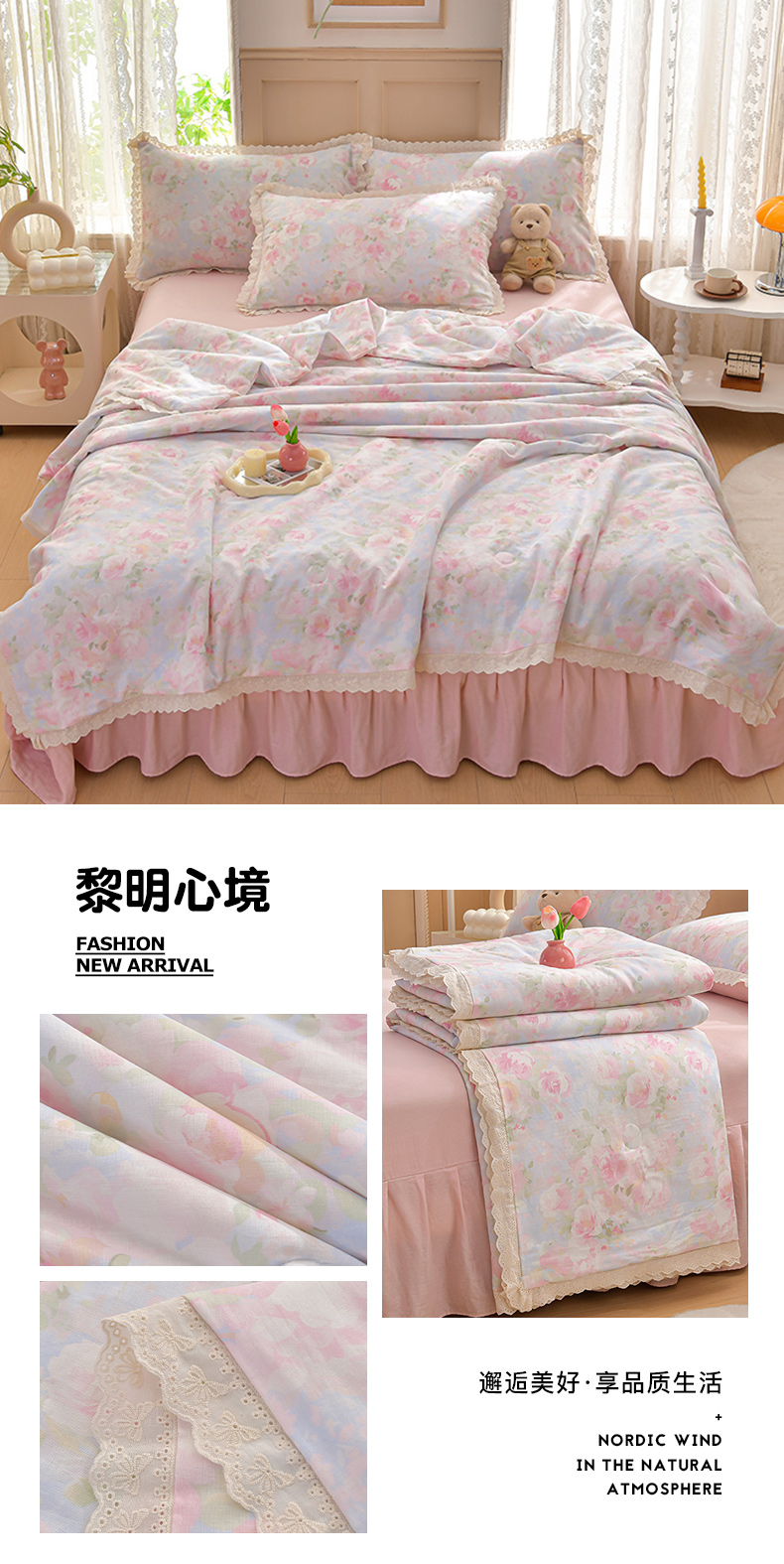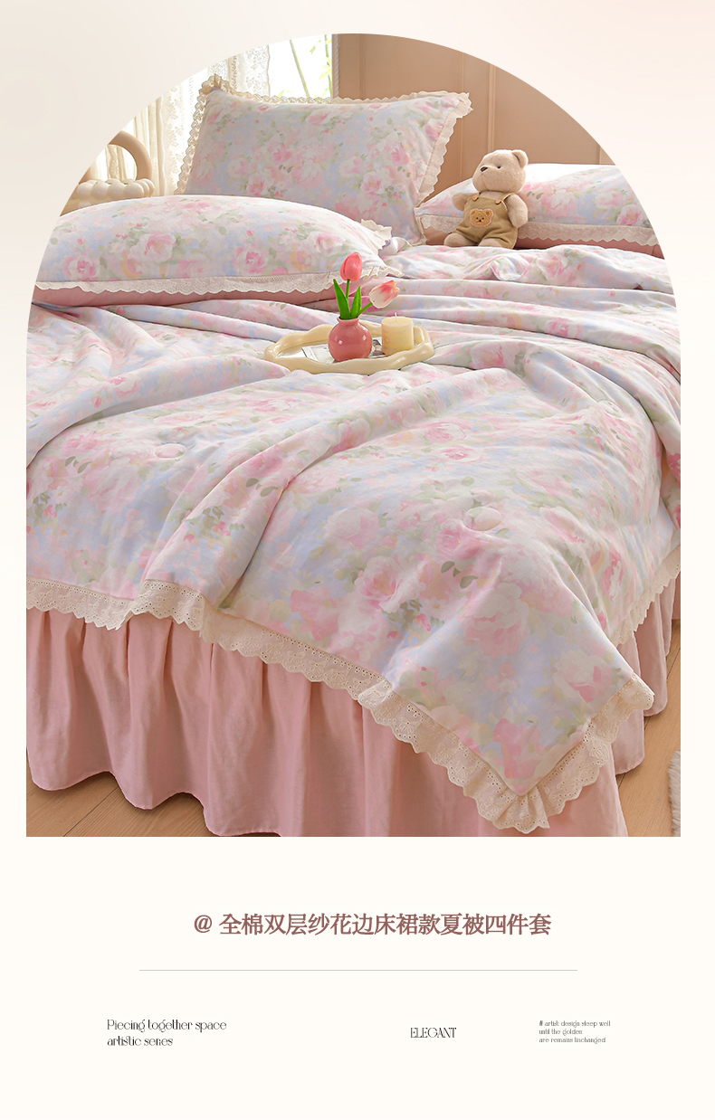 商品名称:绘萱家居 2025新款100%全棉双层纱花边床裙款夏被四件套 黎明心境
