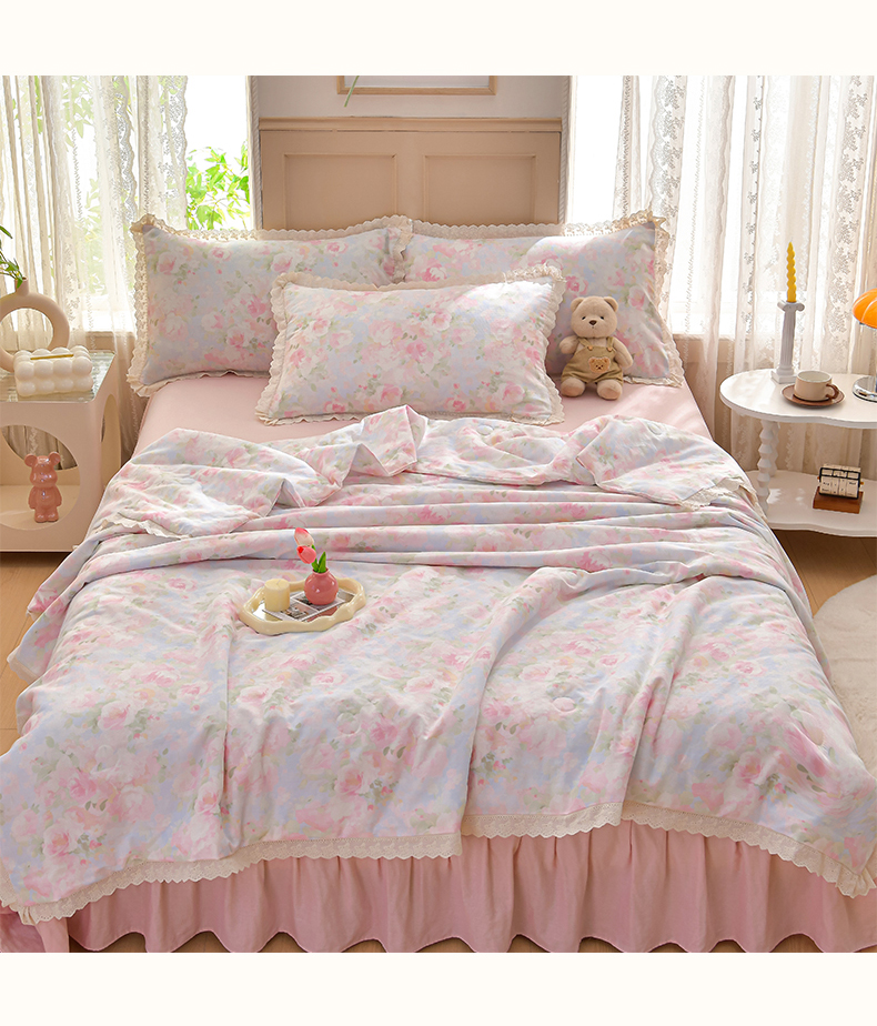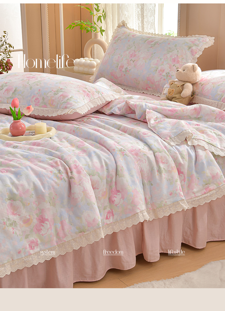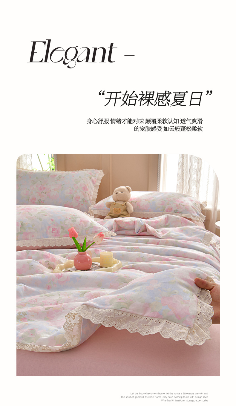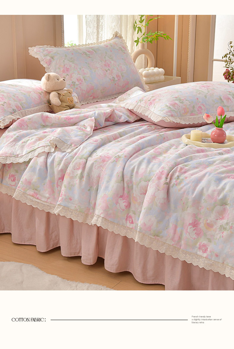 商品名称:绘萱家居 2025新款100%全棉双层纱花边床裙款夏被四件套 黎明心境