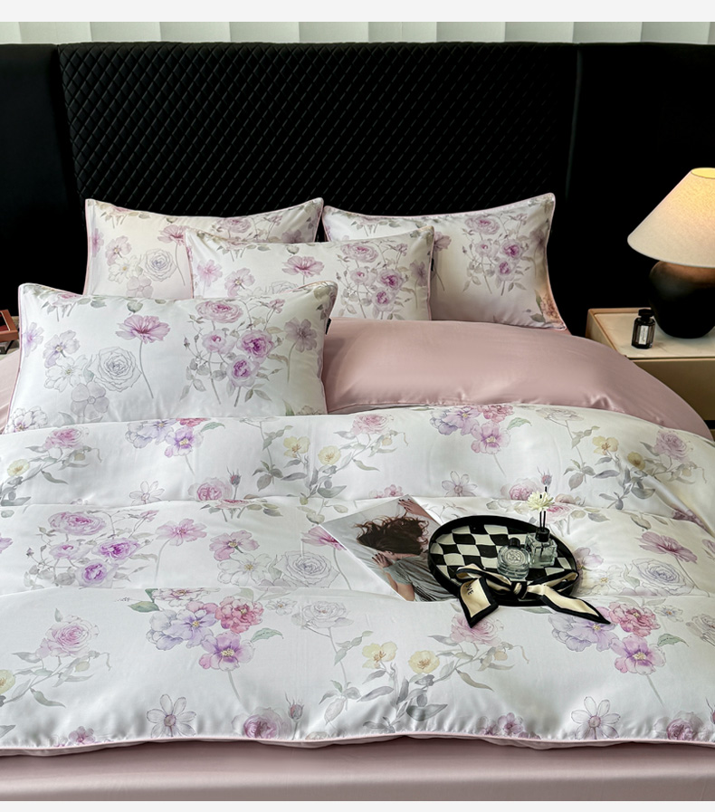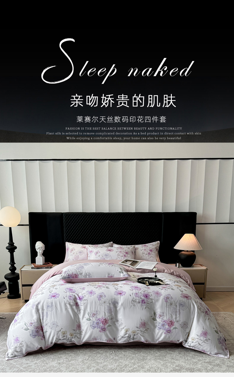 商品名称:芊寻家居 2025春夏新款50支莱赛尔天丝贡缎数码印花麻绳款四件套高端礼盒 春晓紫