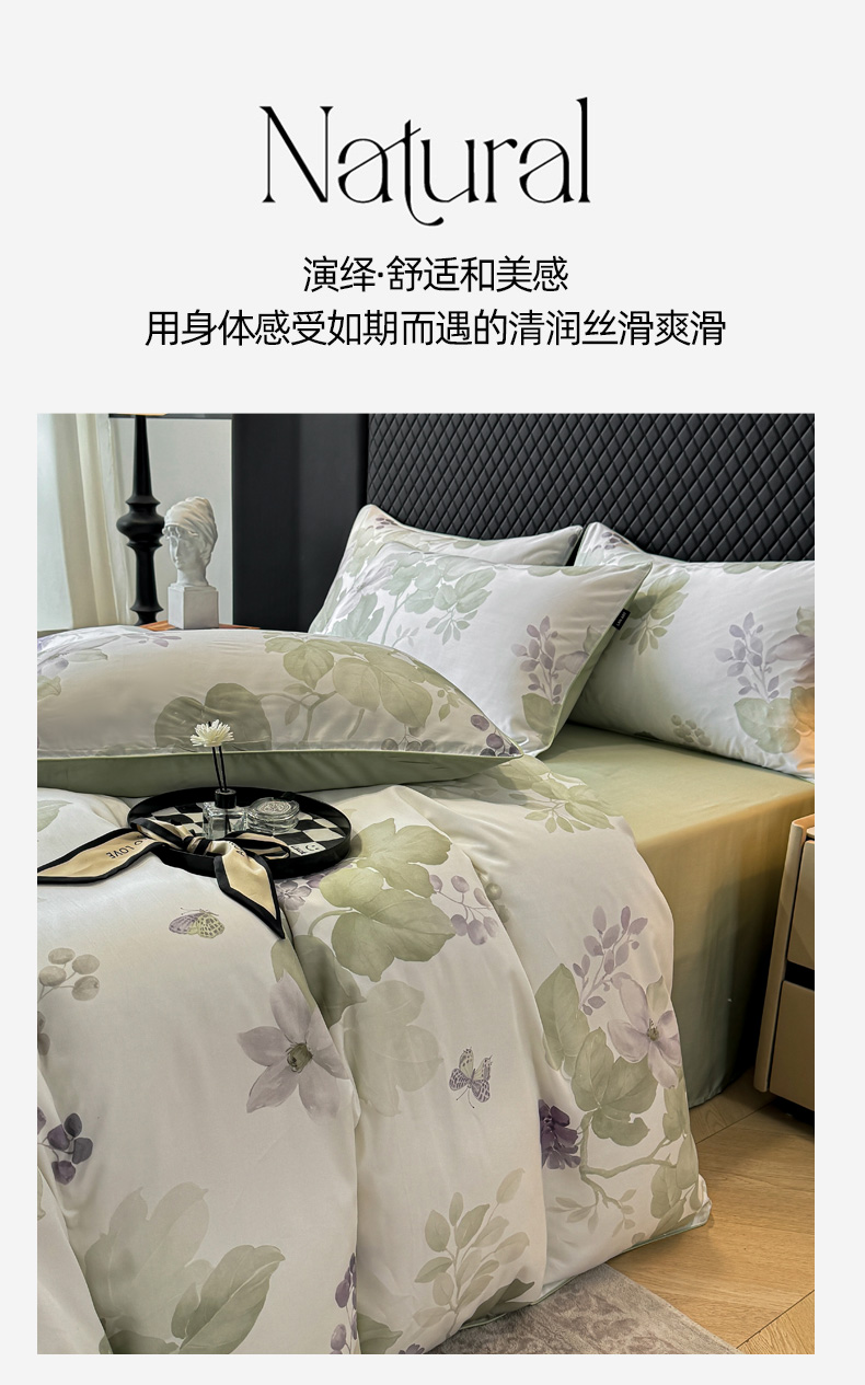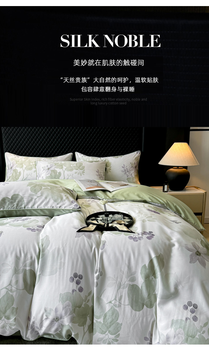 洺兰家居 2025春夏新款100支莱赛尔天丝贡缎数码印花麻绳款四件套高端礼盒 翠影绿