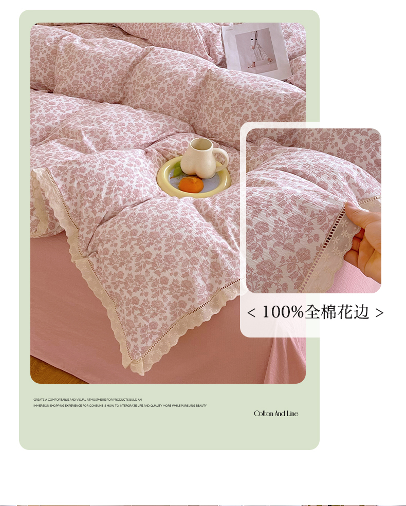 商品名称:雨彤家纺 2025新款A类高克重云感皱皱双层纱全棉镂空花边款法式四件套-床拍图 云槿香