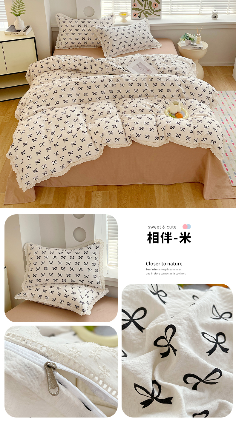 雨彤家纺 2025新款A类高克重云感皱皱双层纱全棉镂空花边款法式四件套-床拍图 云槿香