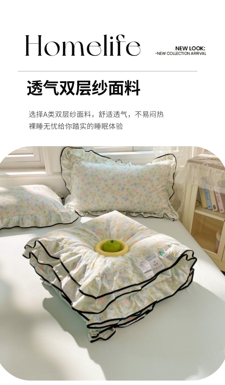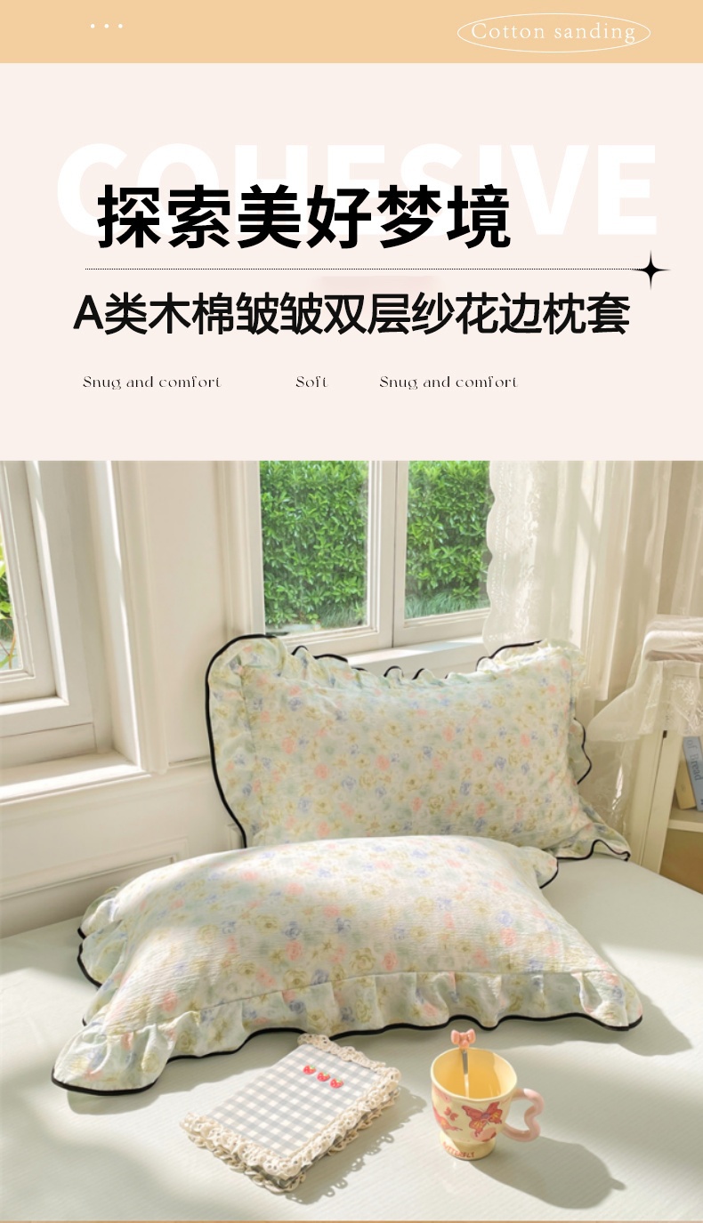 商品名称:梦舒羽 2025新款皱皱双层纱花边枕套宿舍情侣枕芯套单人枕头套 春日初见