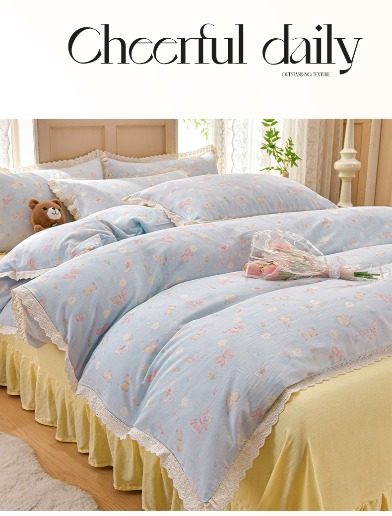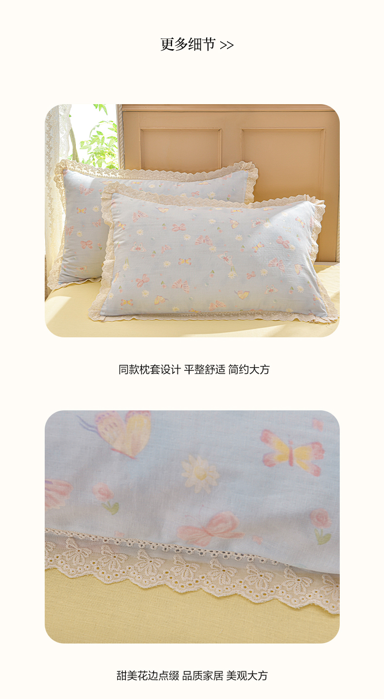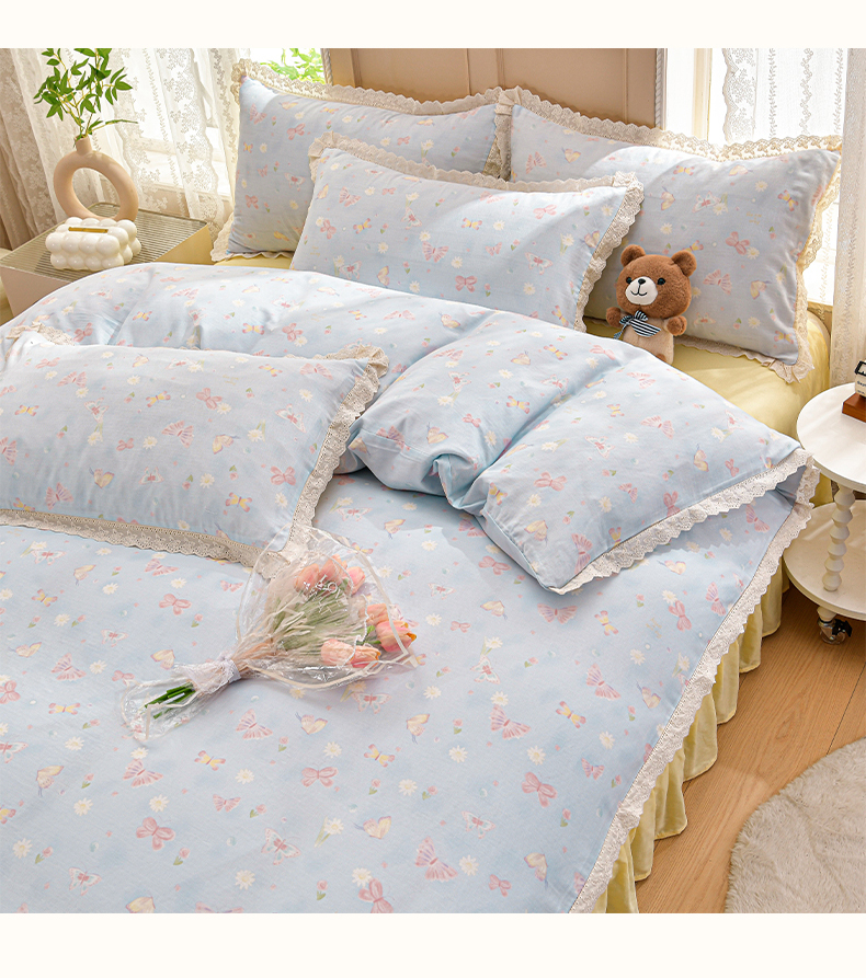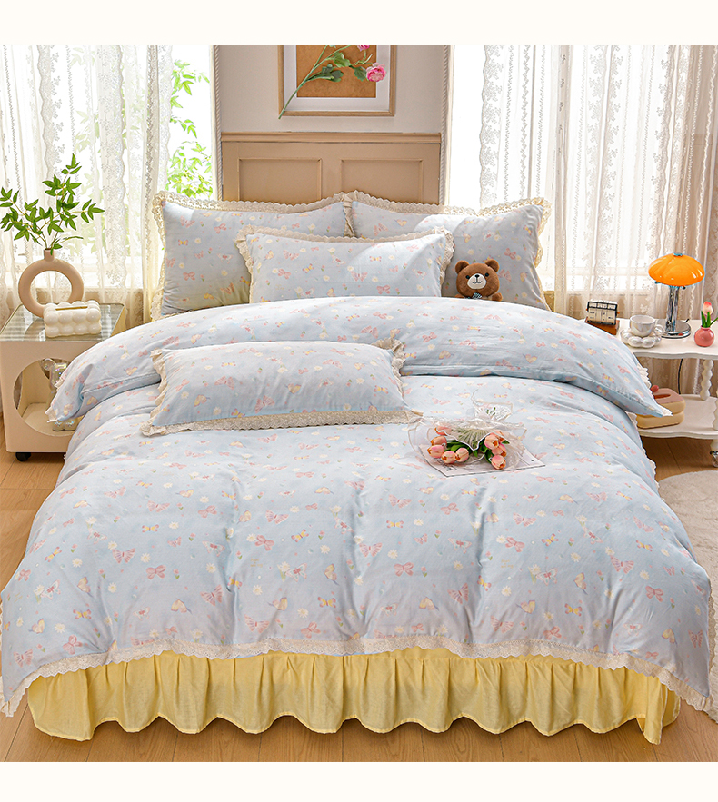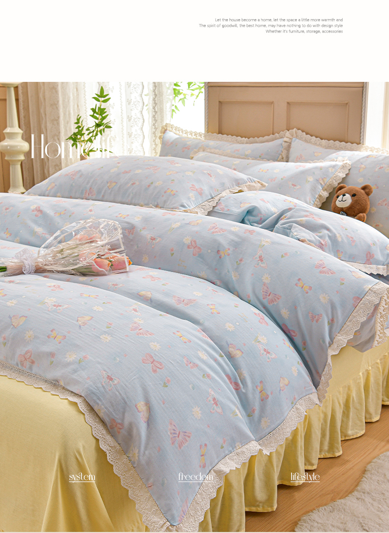 商品名称:绘萱家居 2026春夏新款纯棉100%全棉双层纱镂空花边工艺款床裙四件套 CQ雨蝶-蓝