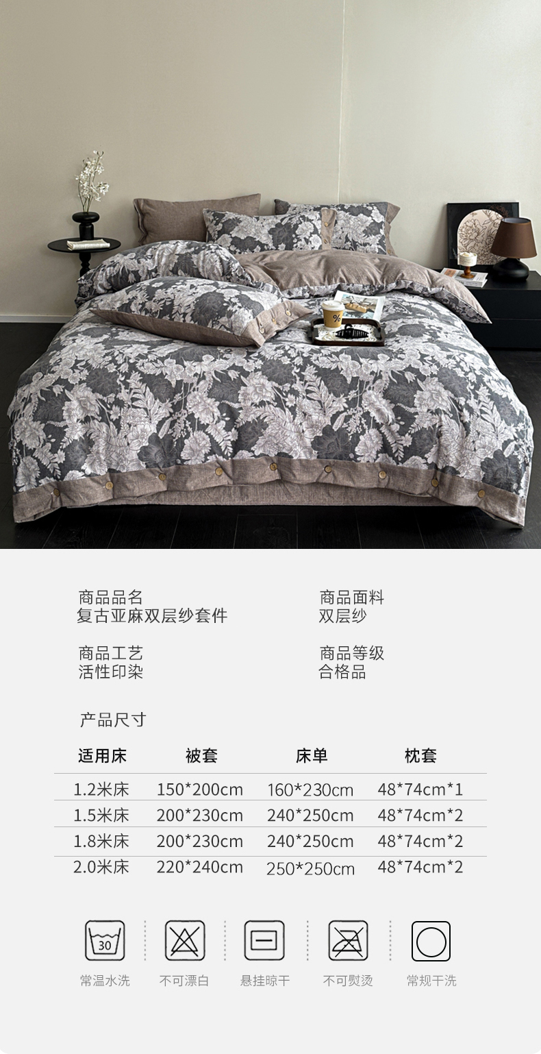 商品名称:漫仙阁家纺 2025秋冬新品加厚高克重复古风双层纱印花四件套 浮绘花影