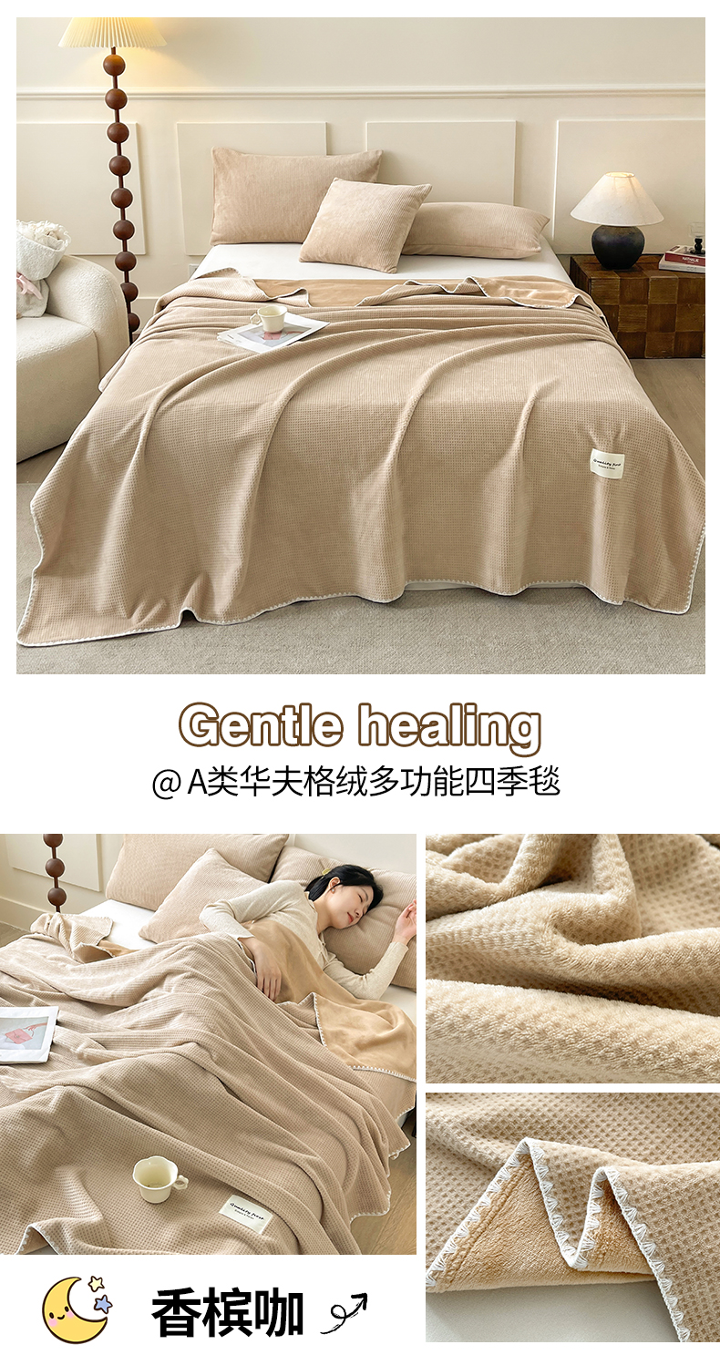 (总)澳梵家居 2025新款华夫格绒四季毯毛毯,香槟咖,焦糖色,抹茶绿,奶油黄,乳杏白,时光灰,组合图