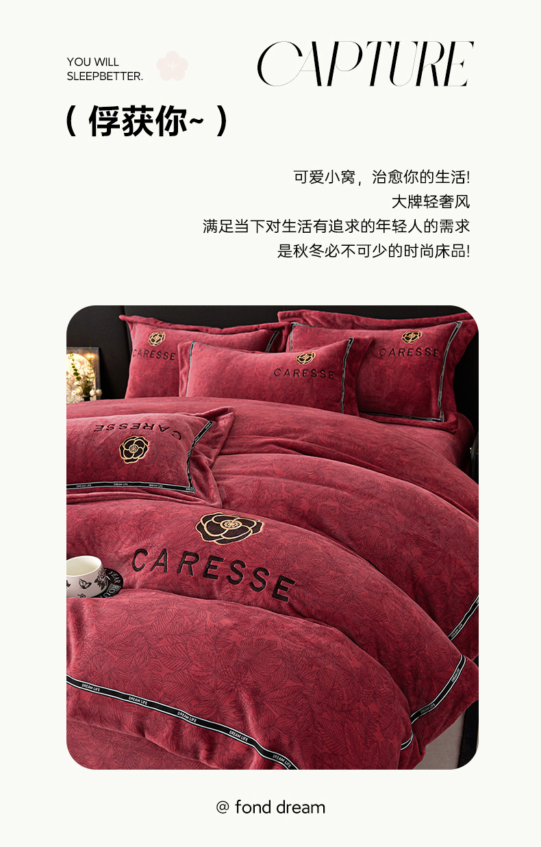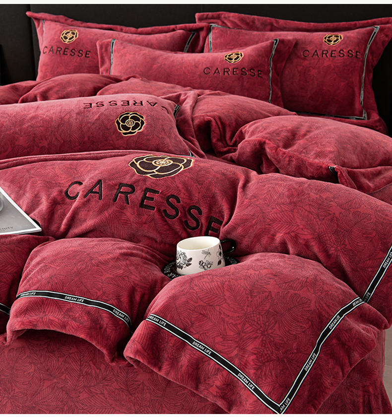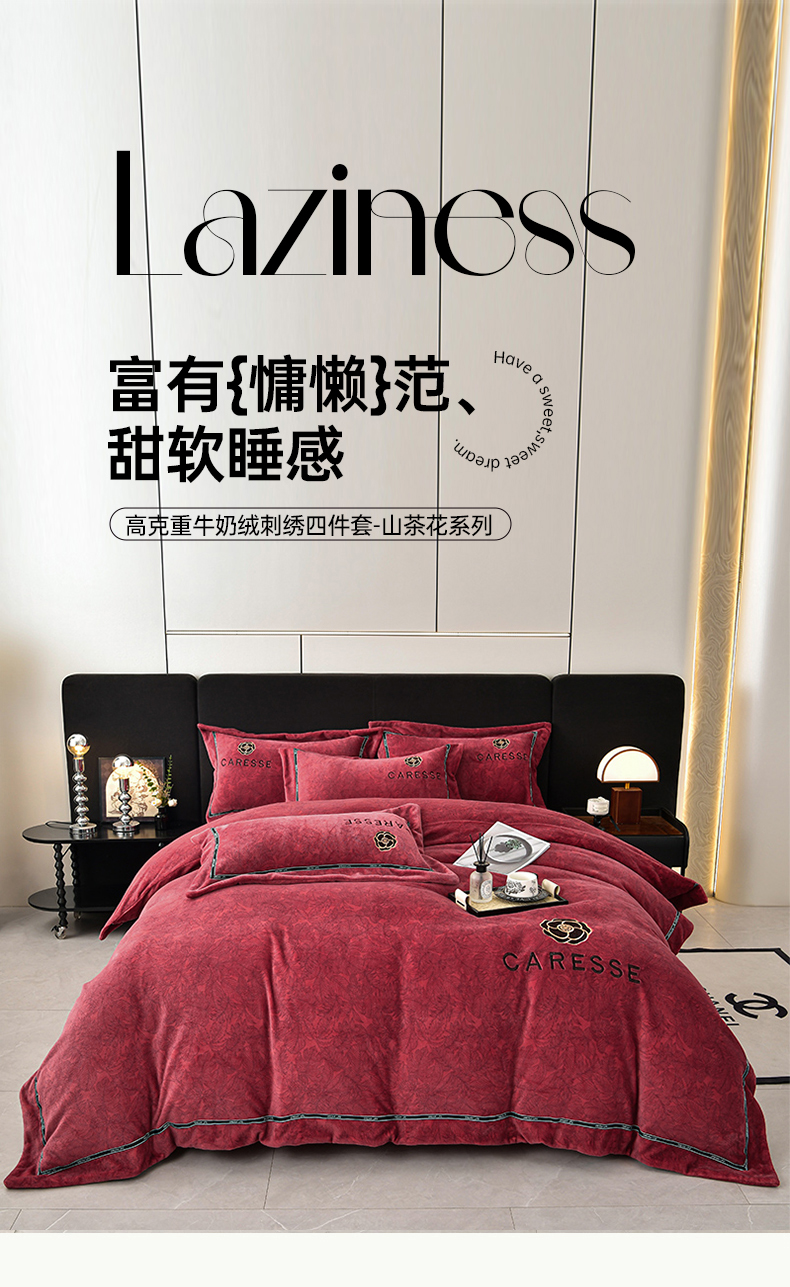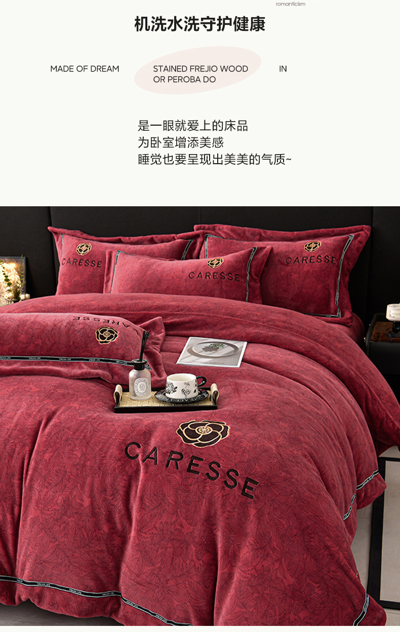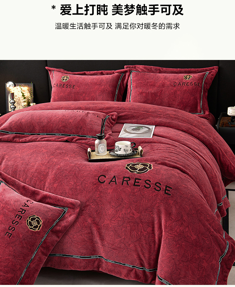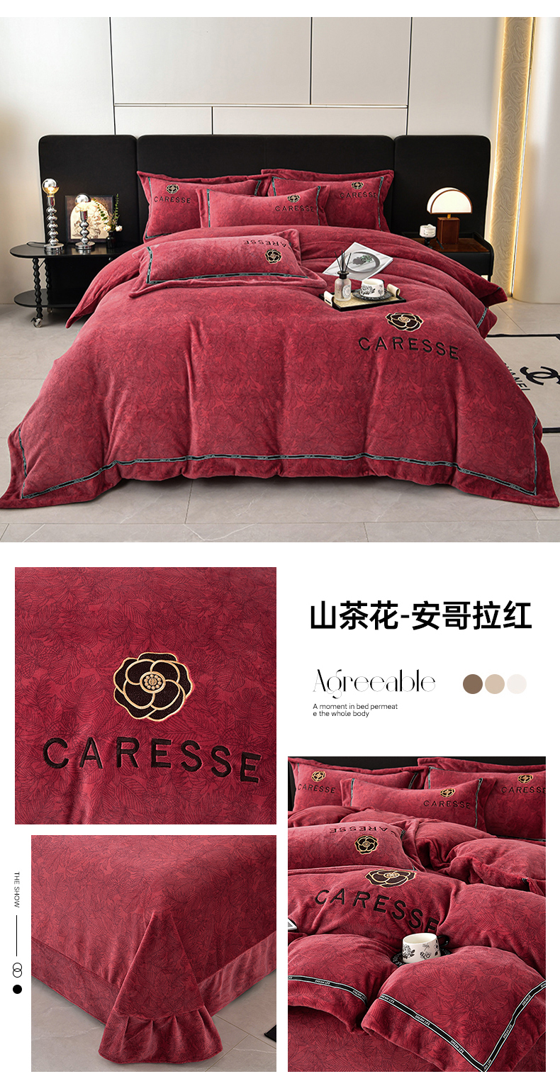 商品名称:妮恒美家纺 2025新款高克重牛奶绒刺绣四件套-山茶花-安哥拉红
