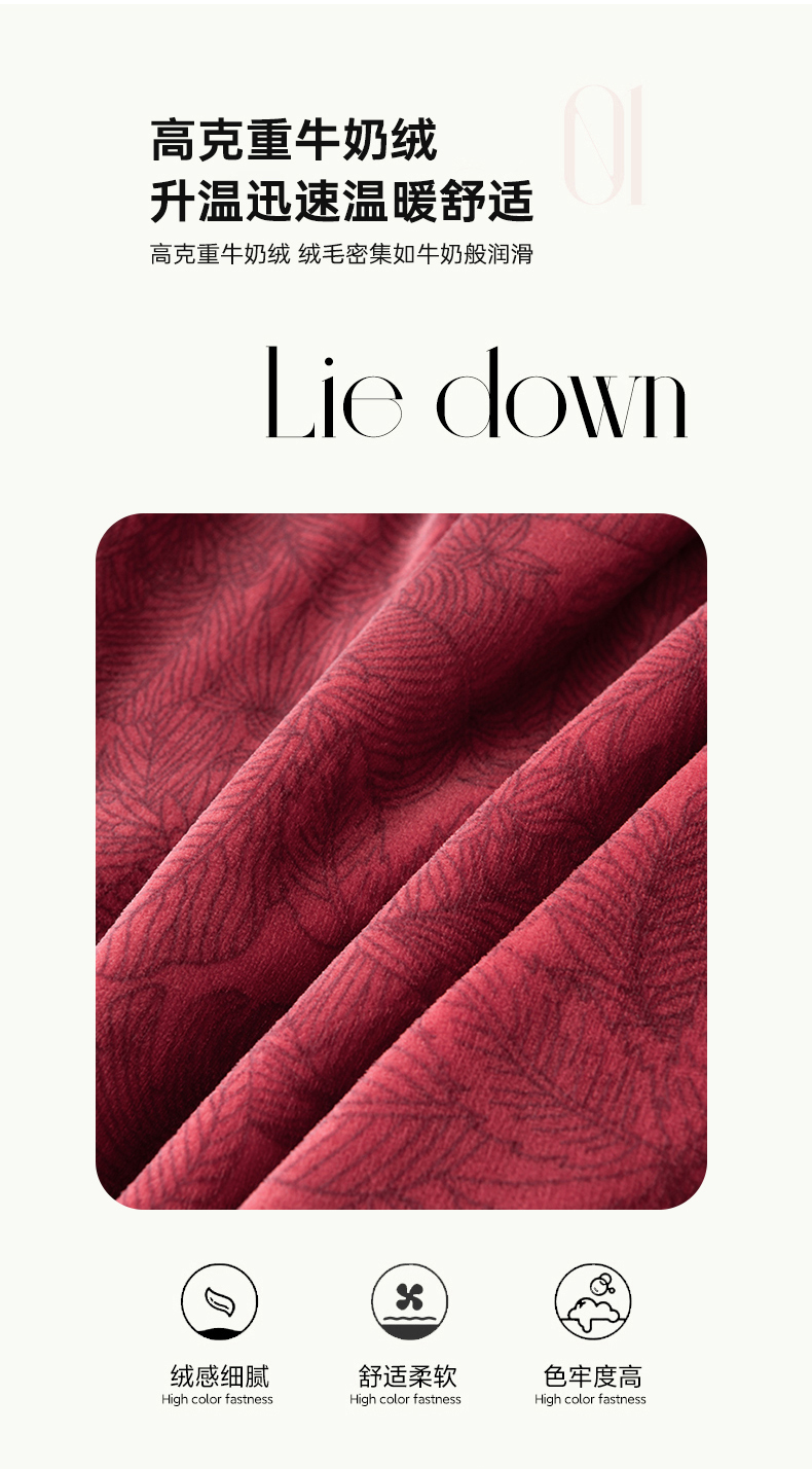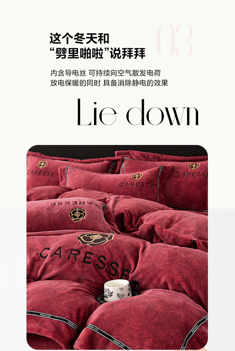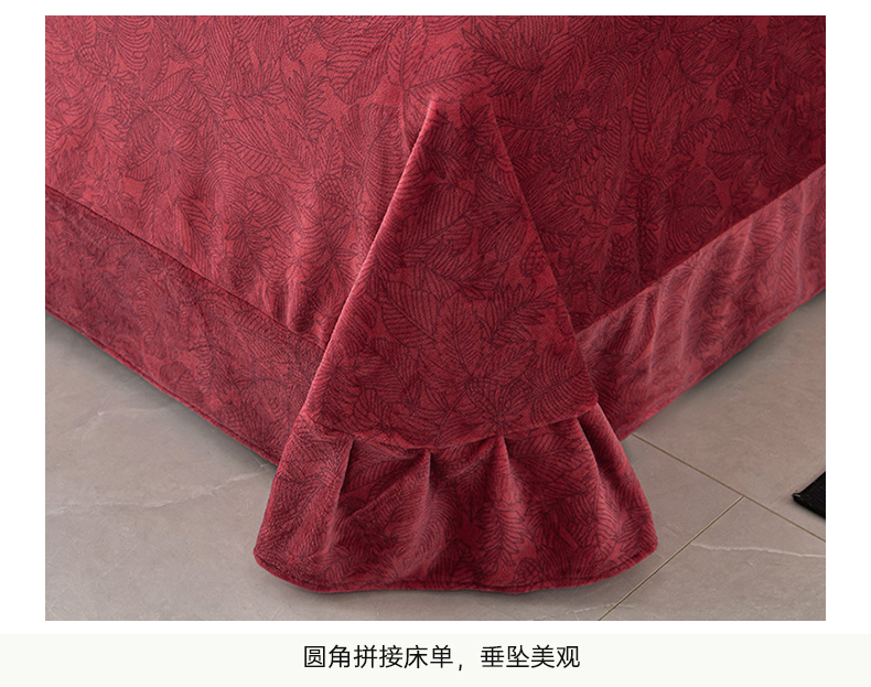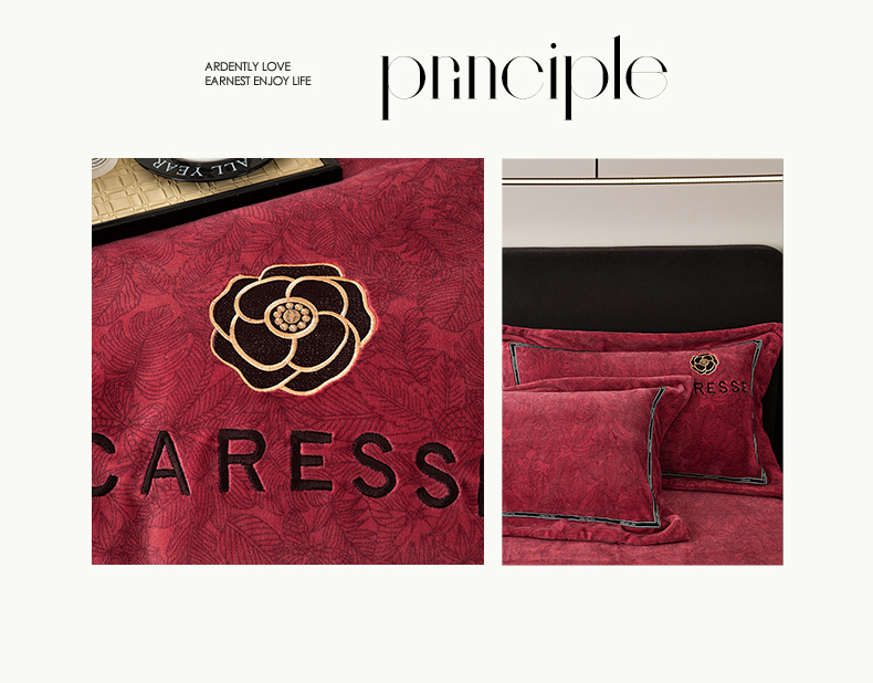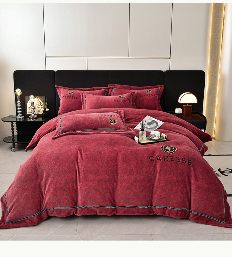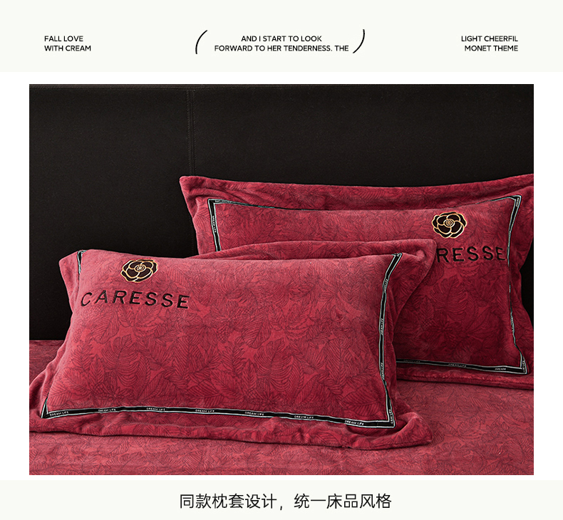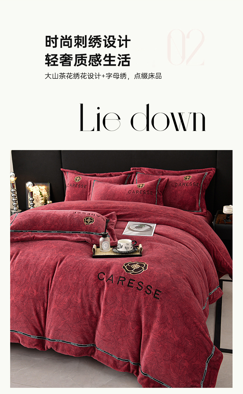 商品名称:妮恒美家纺 2025新款高克重牛奶绒刺绣四件套-山茶花-安哥拉红