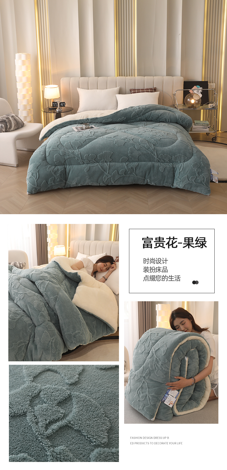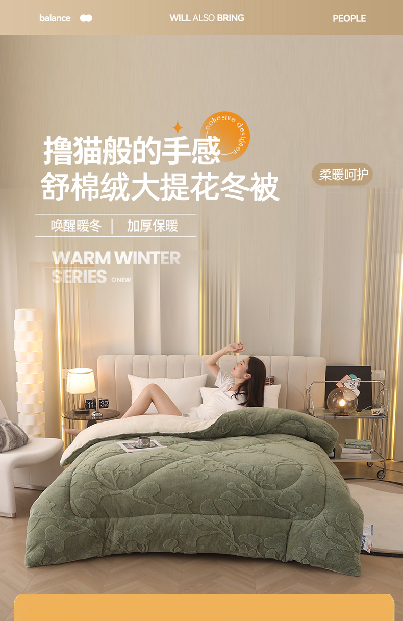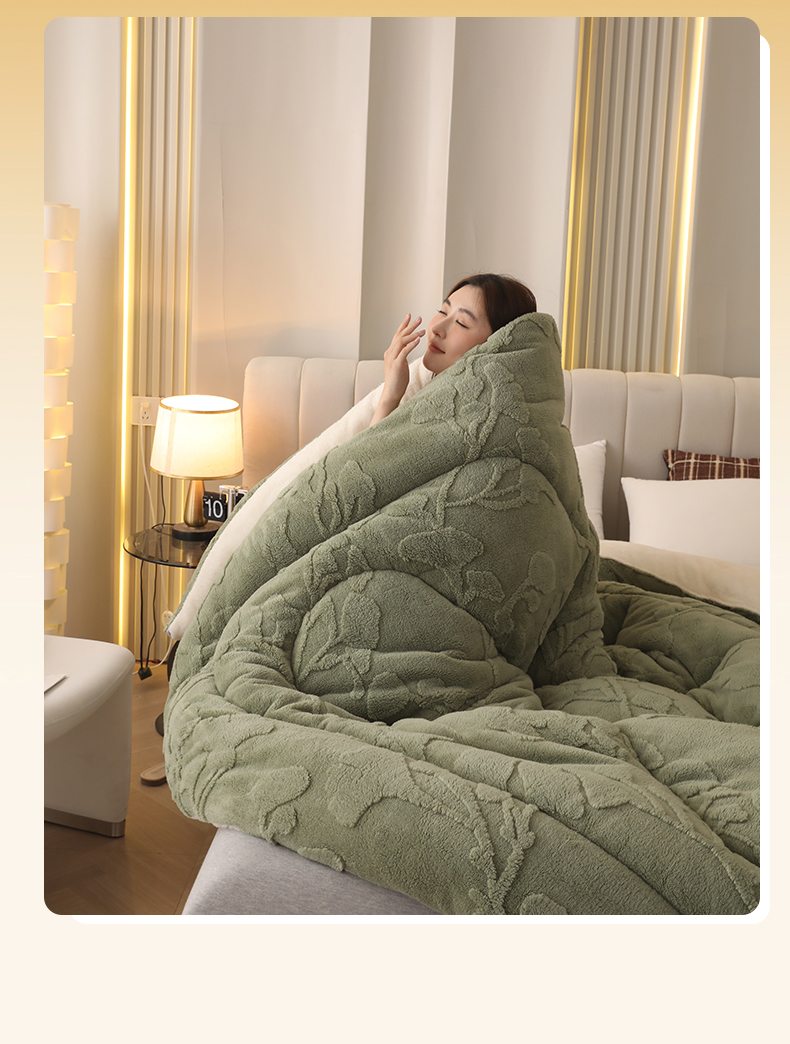 • 91家纺网 家纺一手货源 找家纺 悦然毛巾被 2025新款舒棉绒大提花冬被冬用保暖加厚被子被芯 富贵花-墨绿